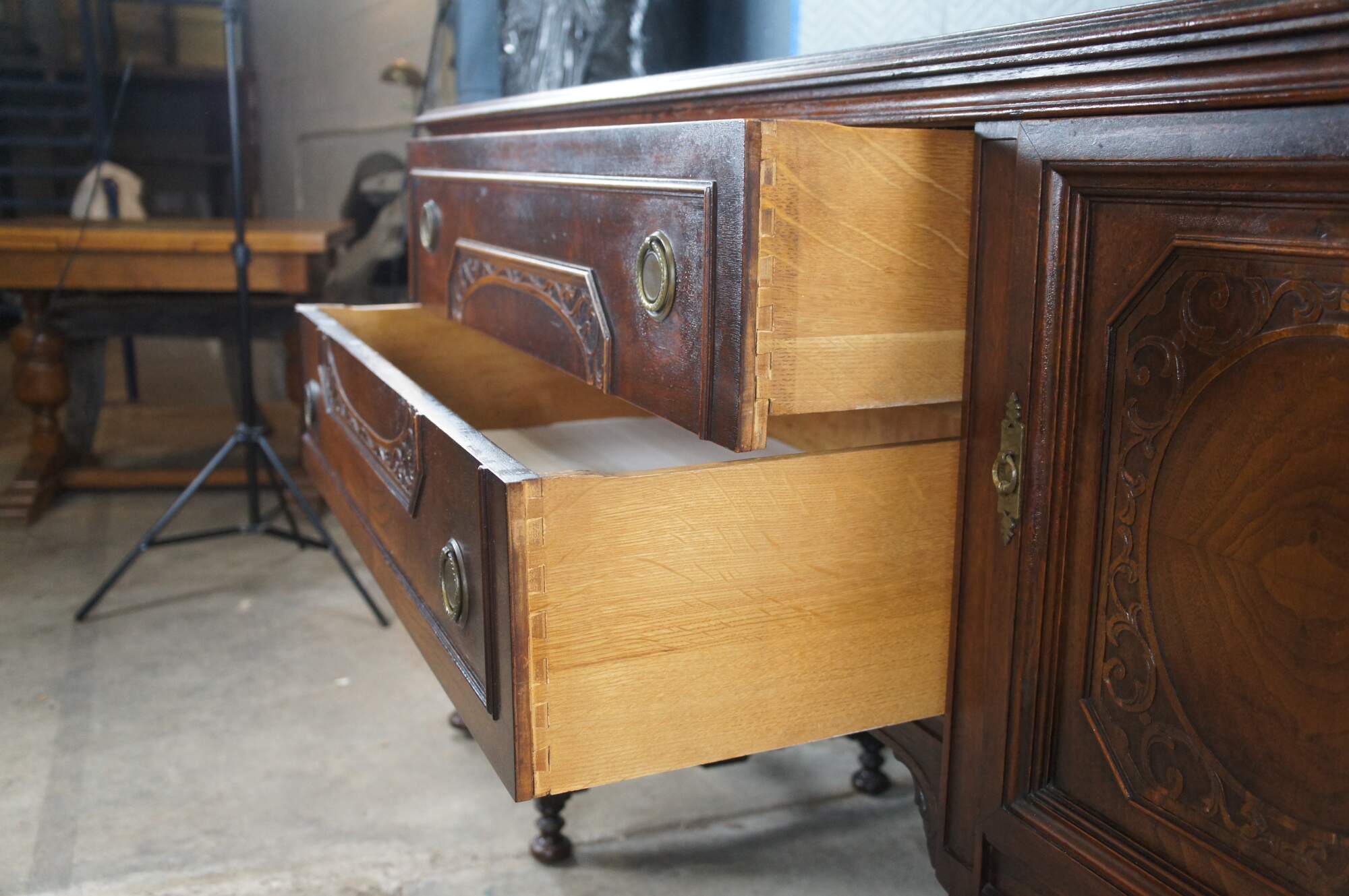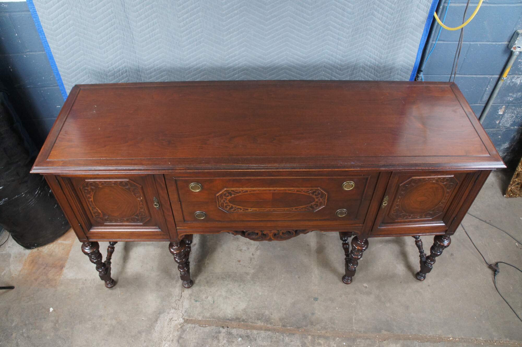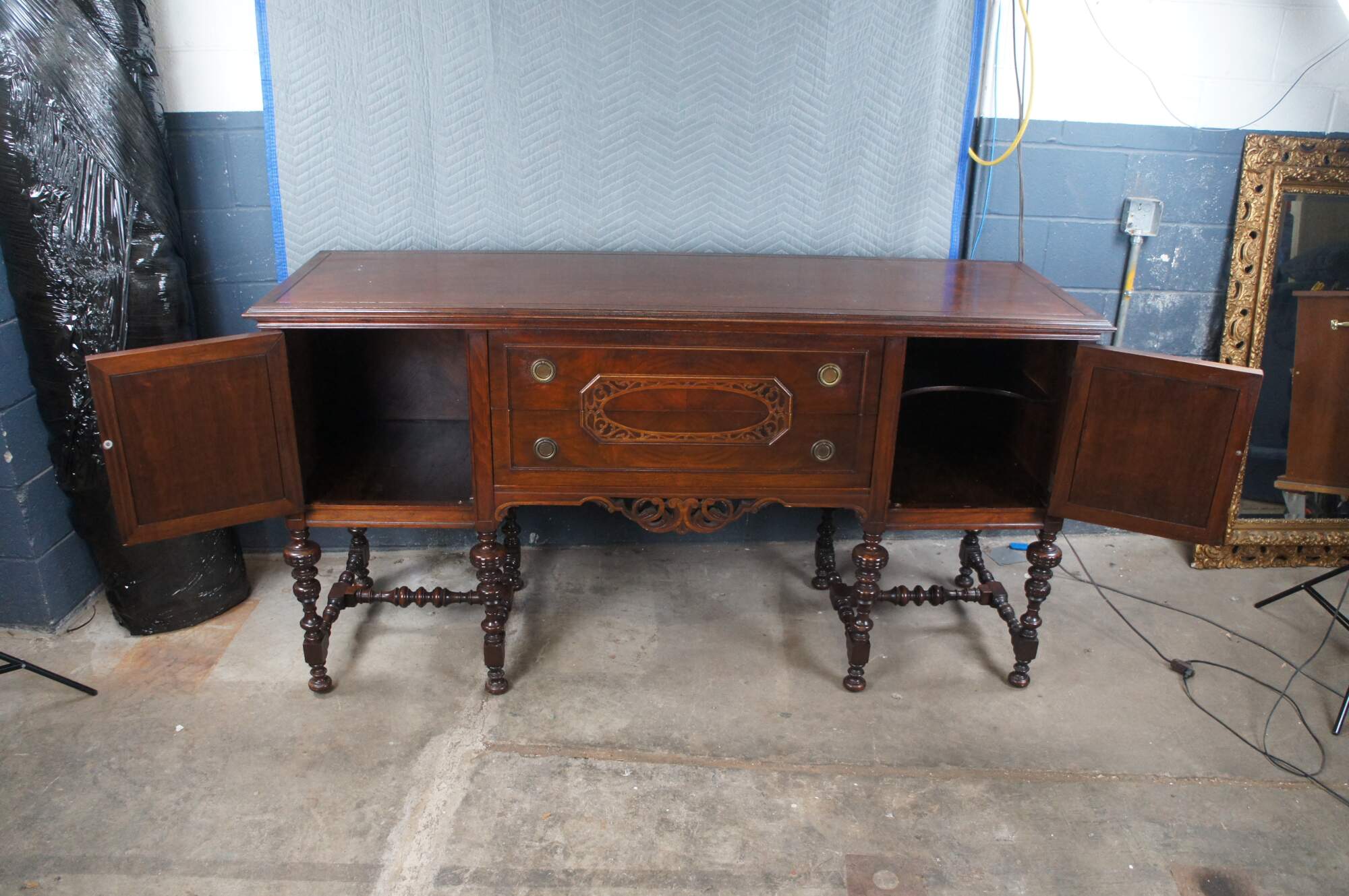 Antique Orinoco Furniture Company Jacobean buffet / sideboard / server. Made of oak featuring rectangular form with fretwork doors and drawers accented with a pierced and scrolled foliate trim over baluster turned ribbed legs / feet. Orinoco Furniture, Makers of Fine Furniture Only. Columbus Indiana, Finished with Duco, Dupont.