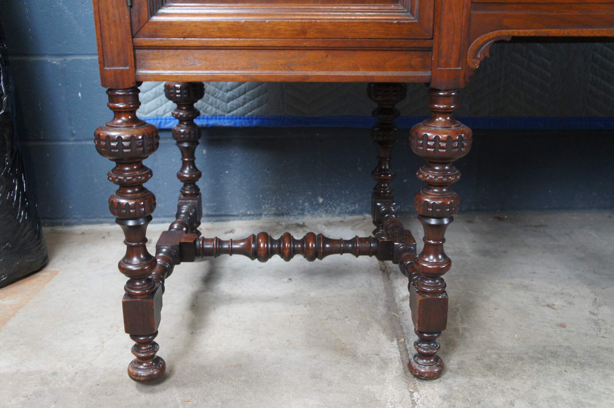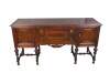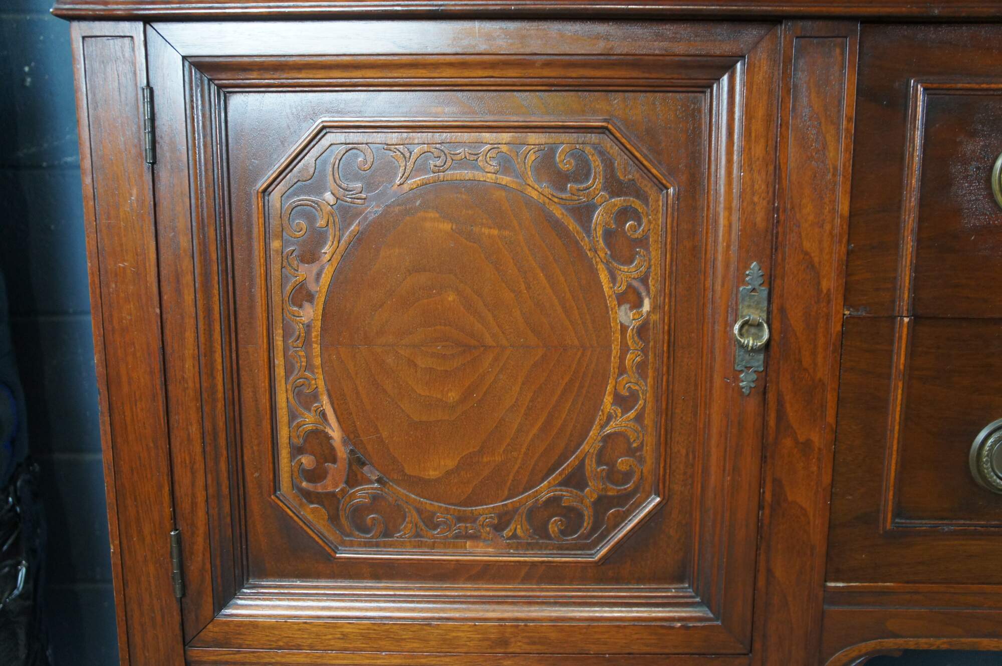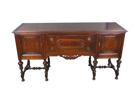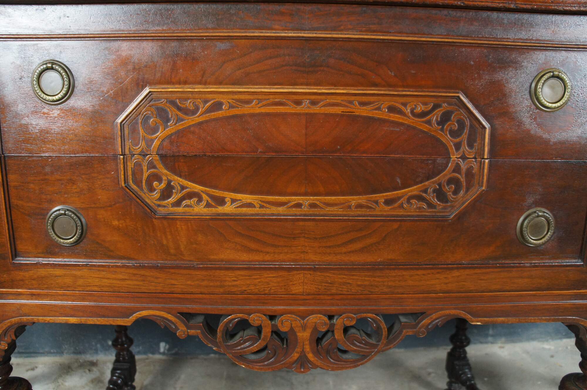 Antique Orinoco Furniture Company Jacobean buffet / sideboard / server. Made of oak featuring rectangular form with fretwork doors and drawers accented with a pierced and scrolled foliate trim over baluster turned ribbed legs / feet. Orinoco Furniture, Makers of Fine Furniture Only. Columbus Indiana, Finished with Duco, Dupont.