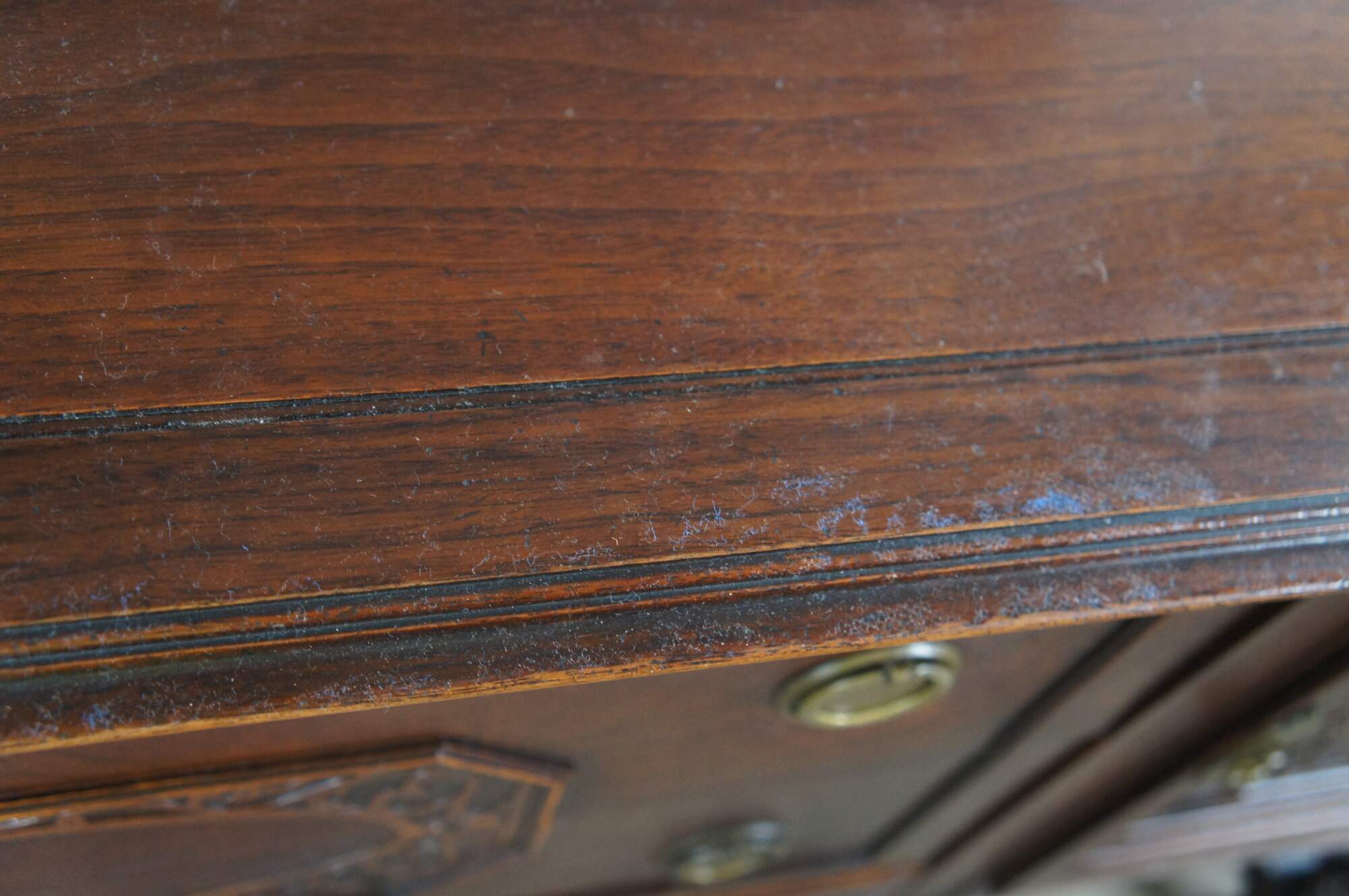 Structurally solid, veneer loss, marking, scuffing, hazing, some residue texture to finish.
