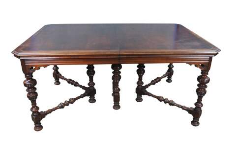 Antique Orinoco Furniture Company Jacobean / Spanish Revival style extendable dining table. Made of oak featuring rectangular form notched corners and pieced S scroll spandrels over baluster turned ribbed legs / feet. Orinoco Furniture, Makers of Fine Furniture Only. Columbus Indiana, Finished with Duco, Dupont. 4325.