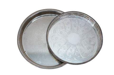 Pair of 20th century silverplate serving / bar trays. Round form with pierced raised gallery edges topped with rope twist edge. Both surfaces sport a scalloped and floral design. One also features Neoclassical foliate swags around the gallery. One marked Made in Sheffield England; one unmarked.