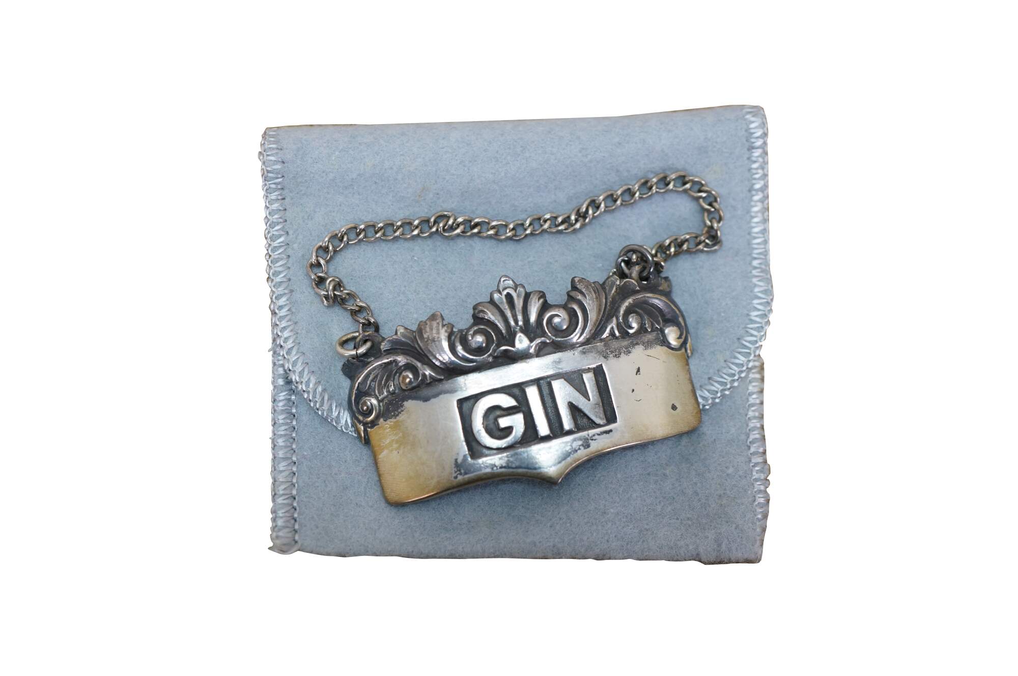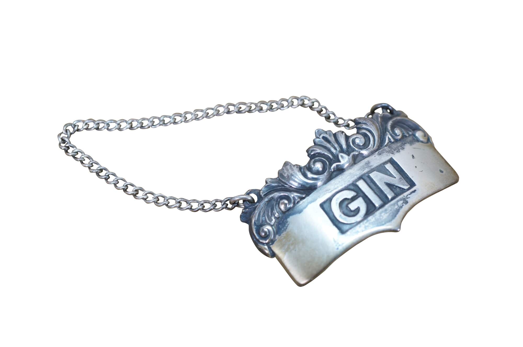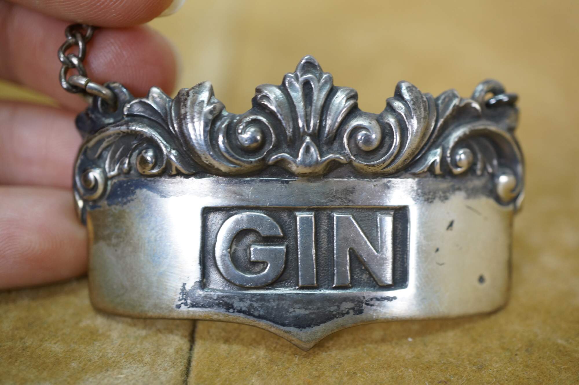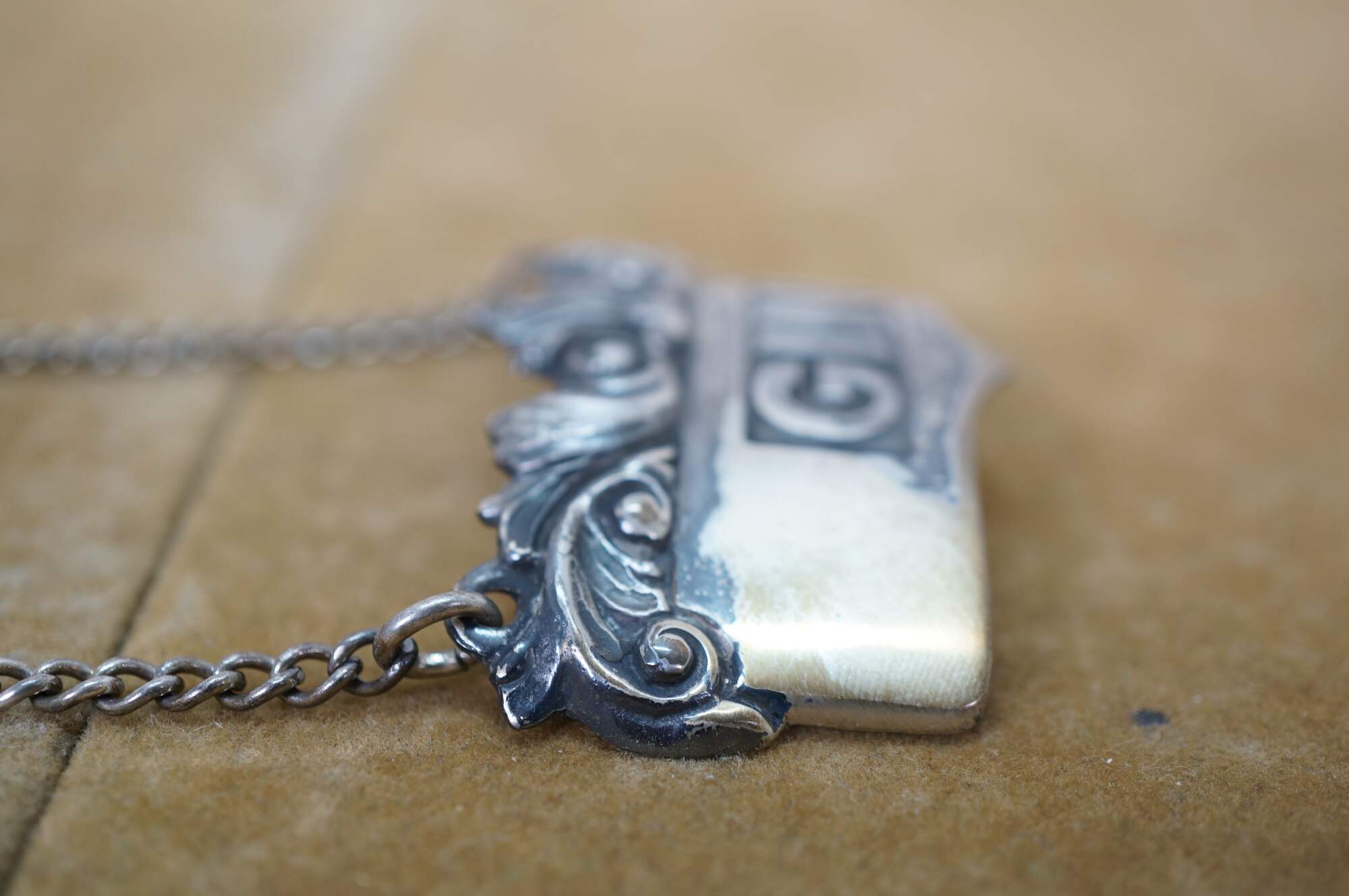 Circa mid 20th century baroque sterling silver Gin decanter / bottle label / charm on chain by R. Blackinton & Company.