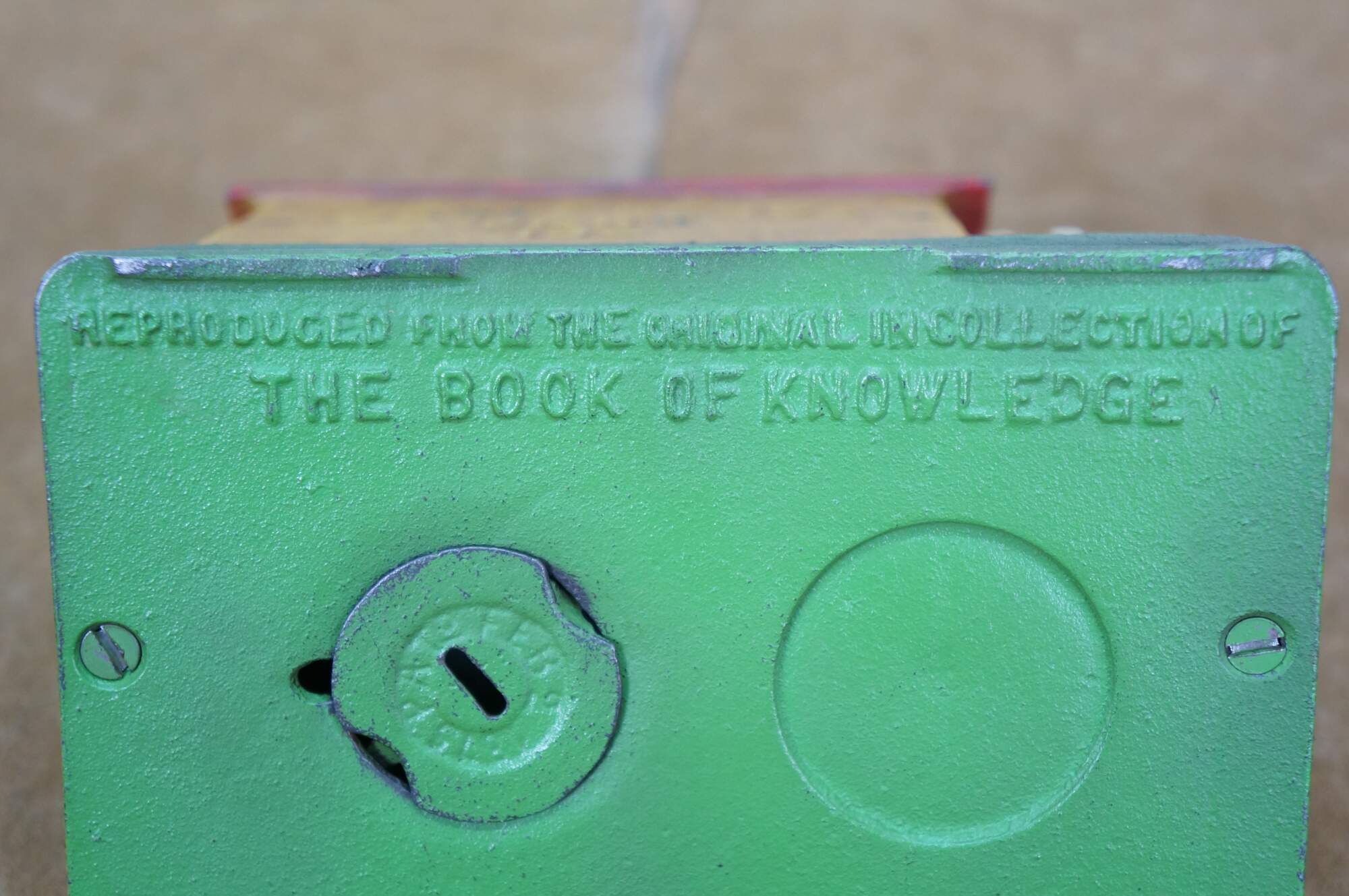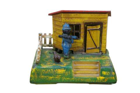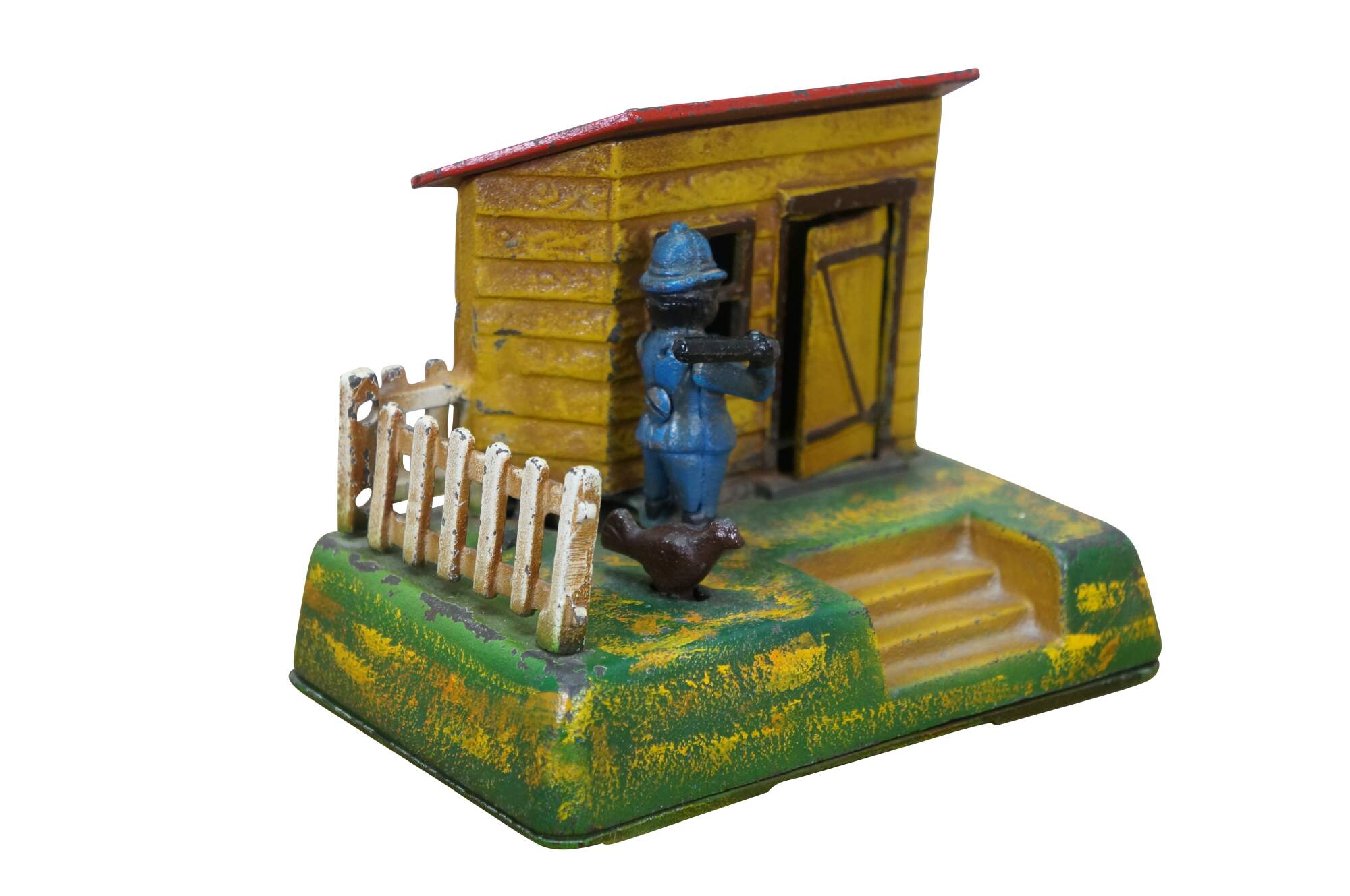 "Action of the "Uncle Remus Bank" is a masterpiece of synchronization. The figure of the cop is pulled back into position (refer to Figure 1). A coin is then placed into the slot atop the hen house roof. The operating lever, in the form of the chicken and positioned in front of the coop, is pressed downward. Simultaneously, the cop, nightstick raised, scoots around the side of the house. The coin then falls into the bank; Uncle Remus slams the door shut, hiding himself from the pursuing policeman. Deposits are retrieved by opening the square key-lock coin retainer underneath the base.