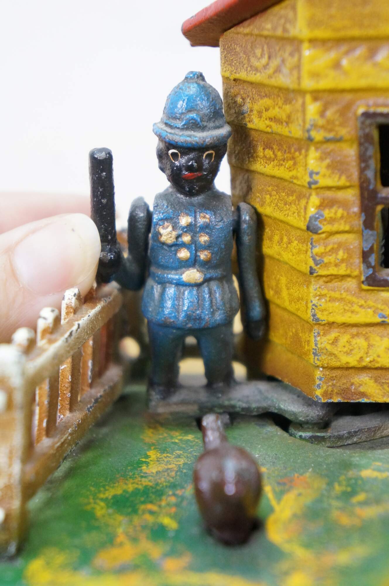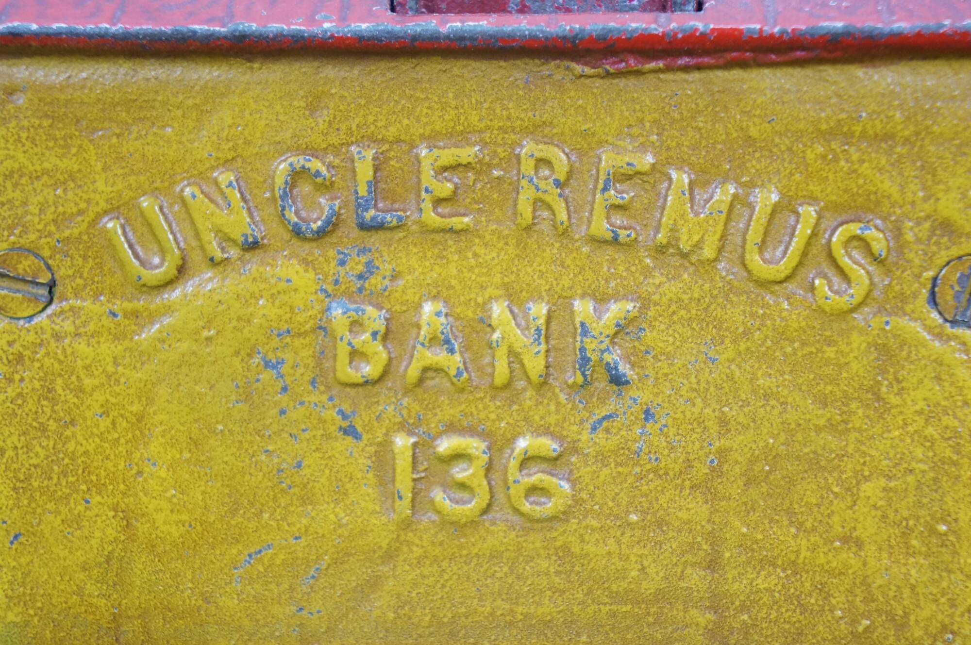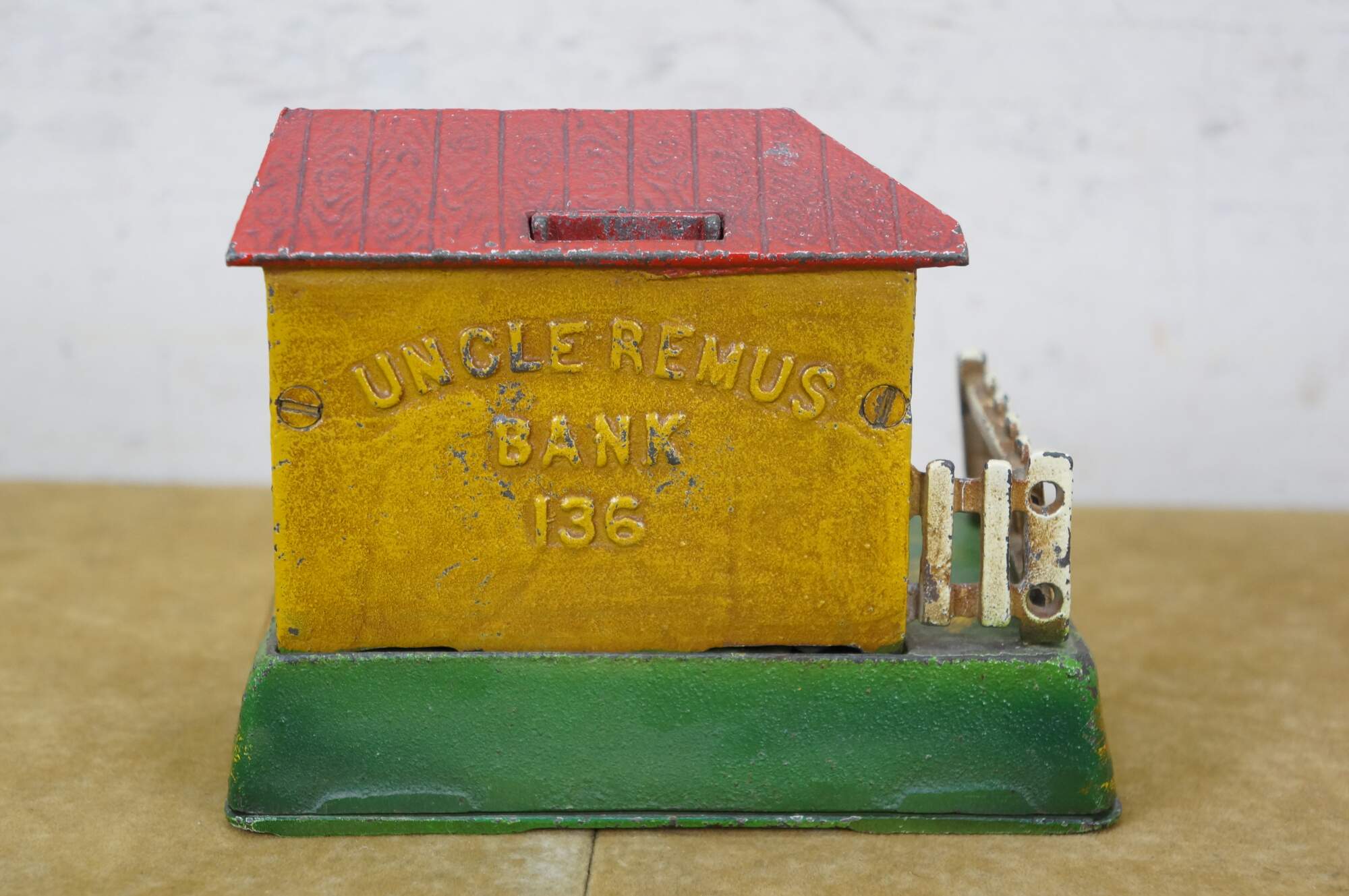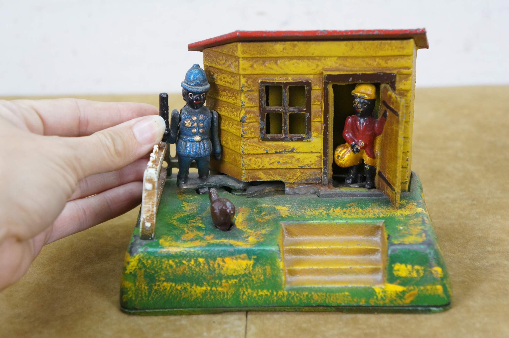 Vintage 20th century Uncle Remus number 136 cast iron mechanical coin bank. Depicts a thief with a sack at the door of a yellow and red hen house, while a policeman in traditional beat cop attire comes around the corner with his Billy club. A chicken stands in the foreground by a set of steps. Reproduced from the Original in Collection of The Book of Knowledge. Patd Feb 9, 1873.