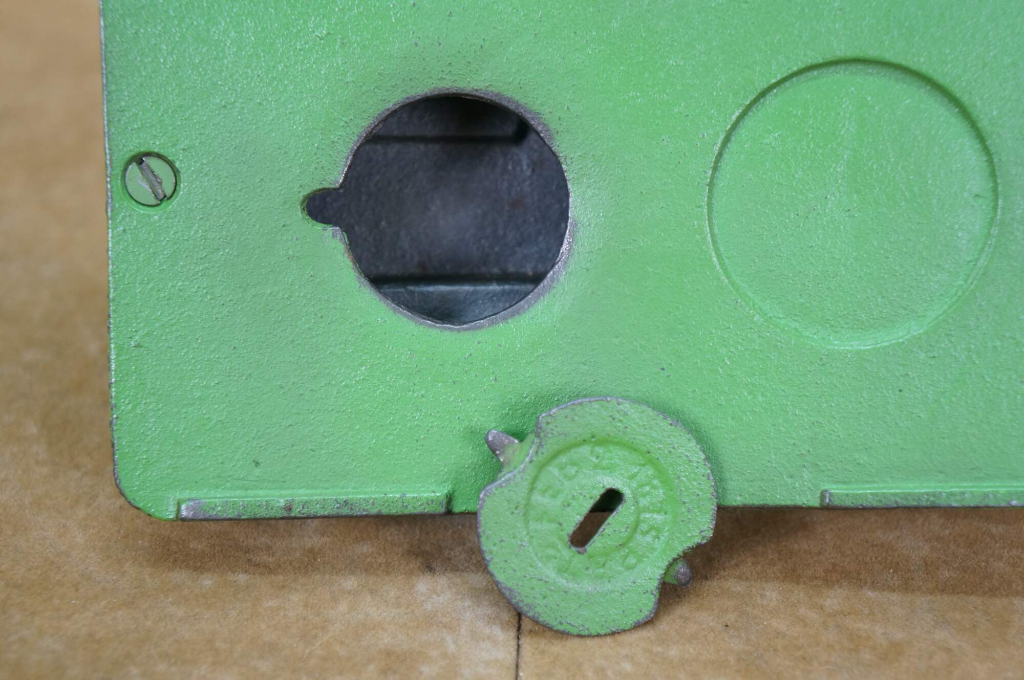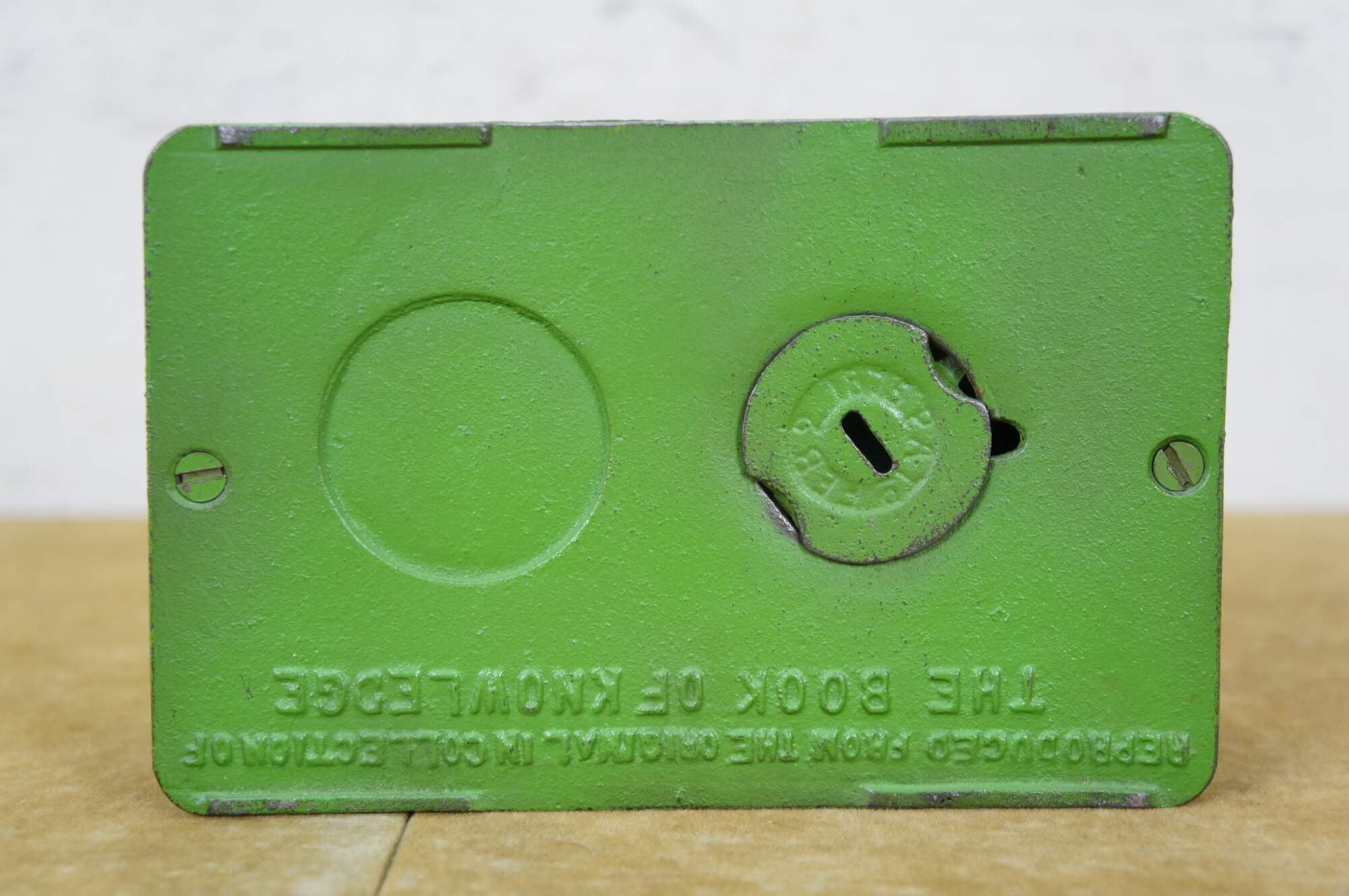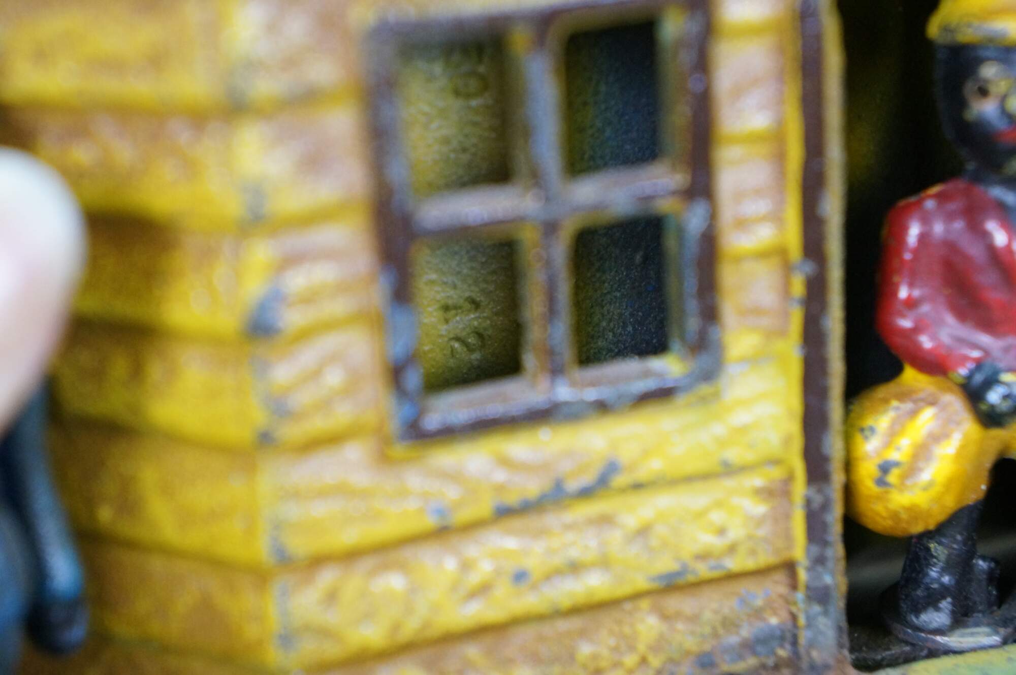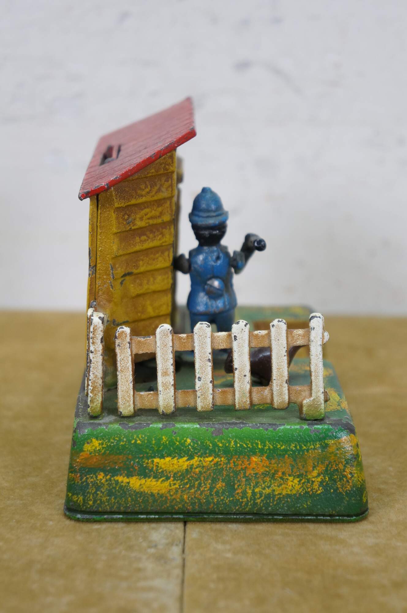 Vintage 20th century Uncle Remus number 136 cast iron mechanical coin bank. Depicts a thief with a sack at the door of a yellow and red hen house, while a policeman in traditional beat cop attire comes around the corner with his Billy club. A chicken stands in the foreground by a set of steps. Reproduced from the Original in Collection of The Book of Knowledge. Patd Feb 9, 1873.