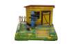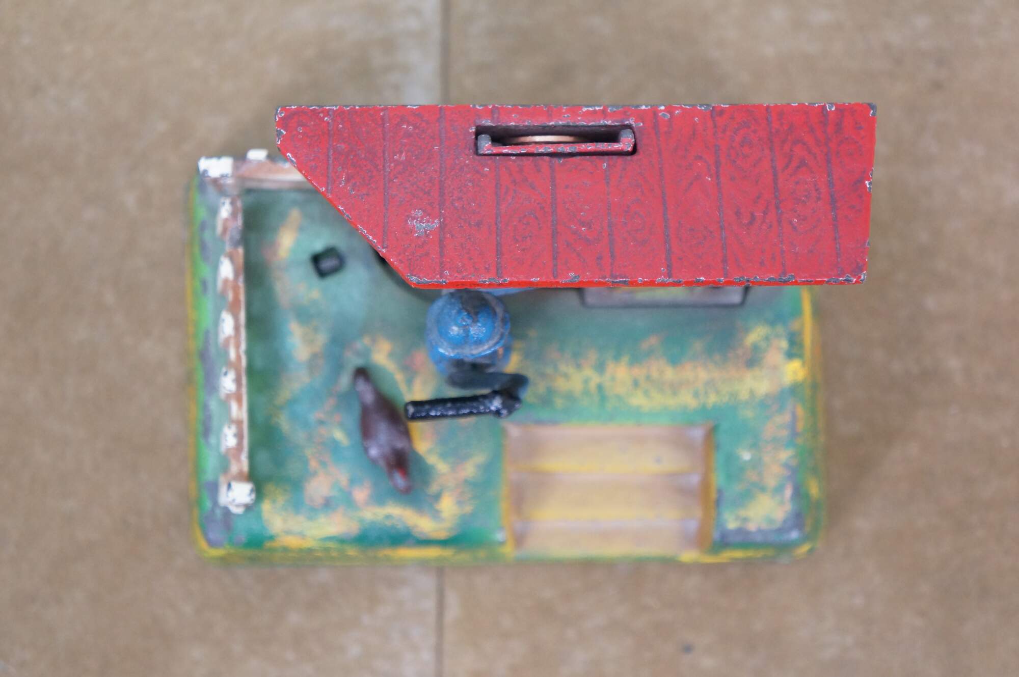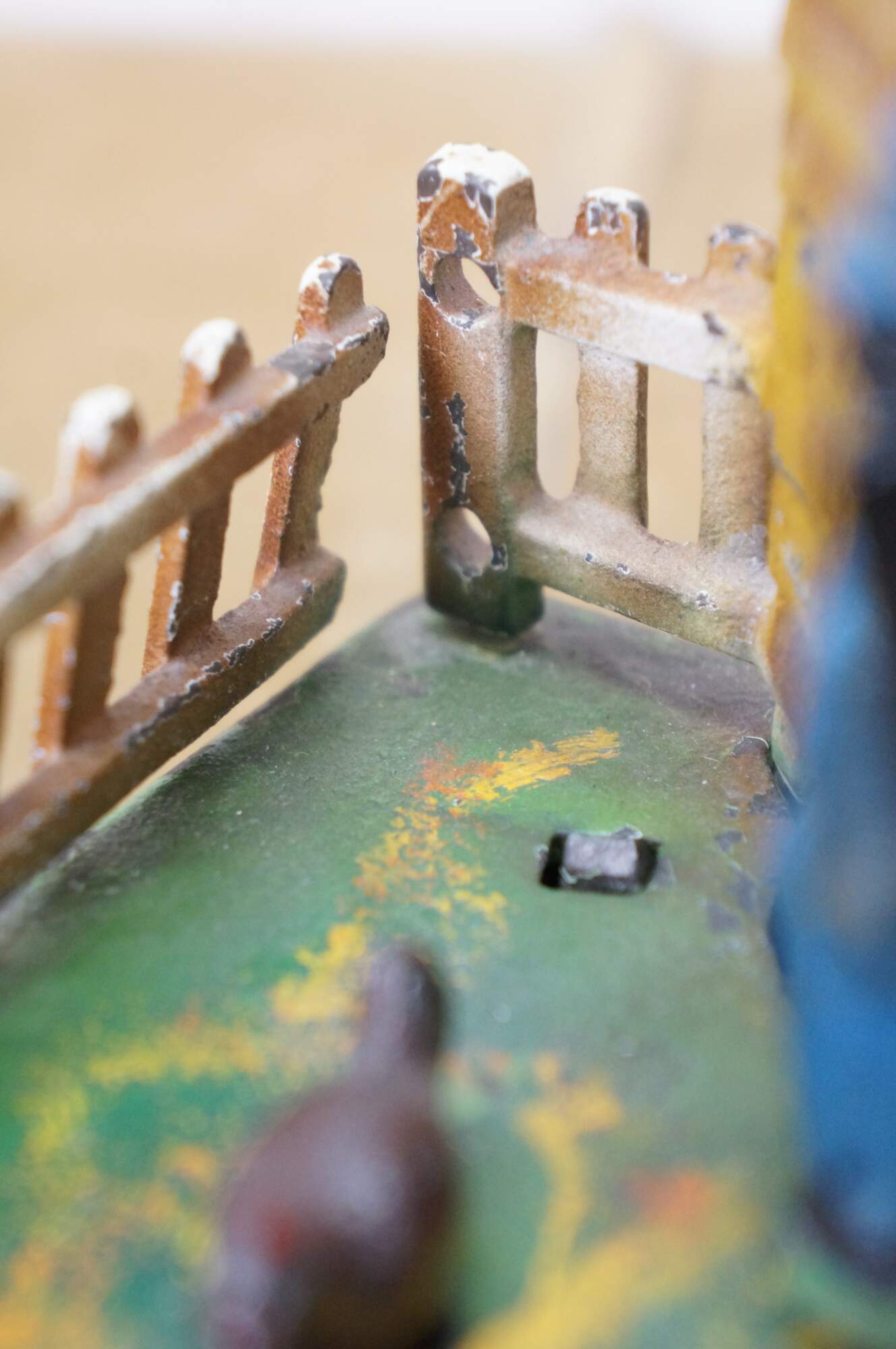 Spring mechanism not currently functional; part of fence post missing; wear to paint