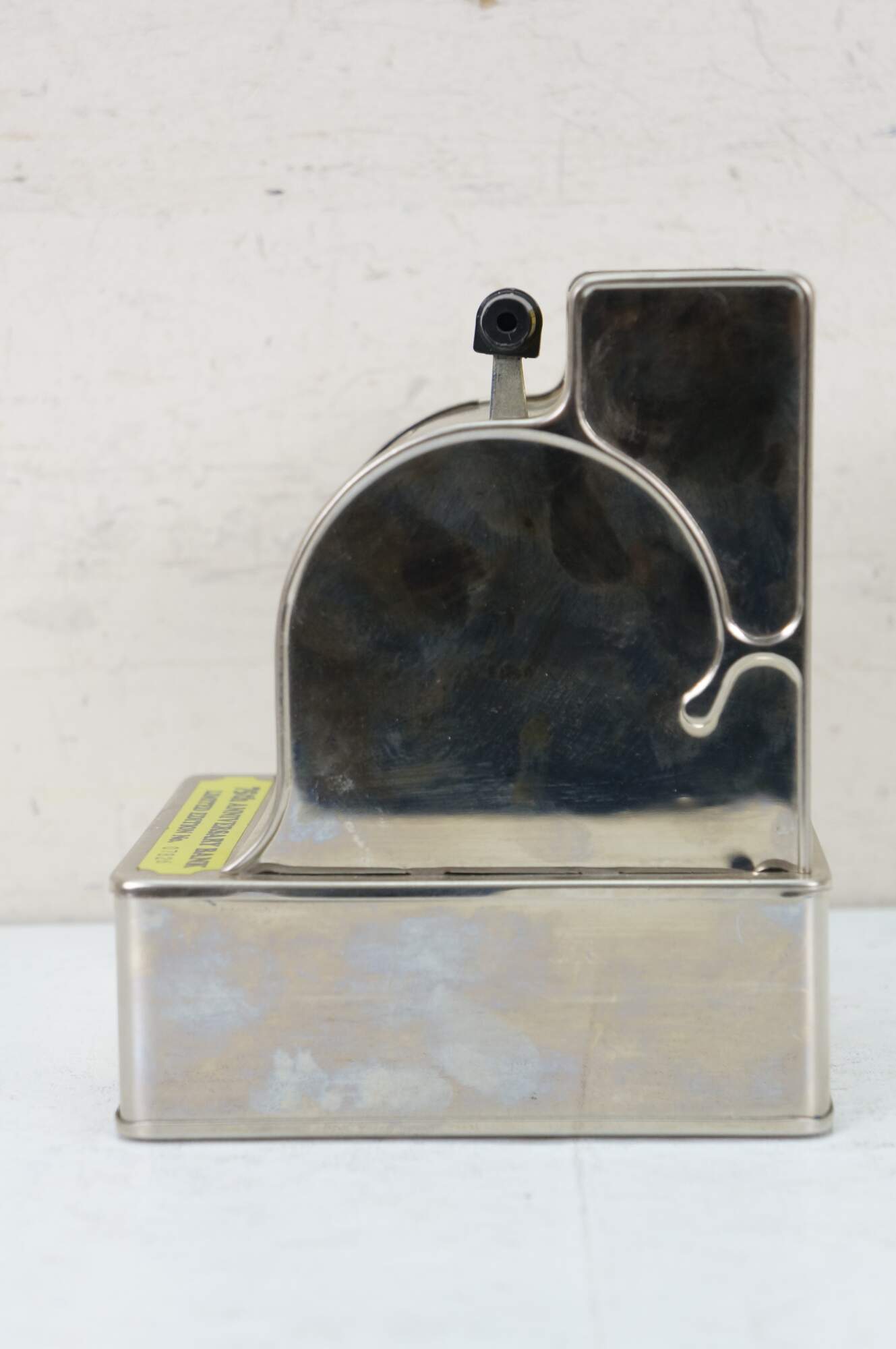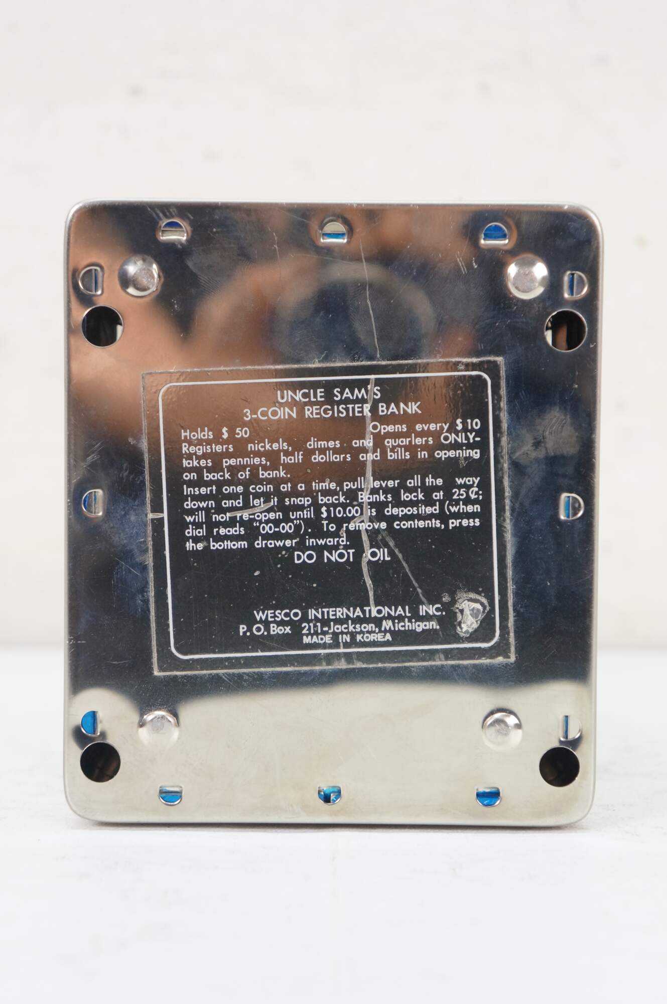 "First made in 1907, this coin bank found its way to many kids and adults from the 1920s -1970s. Locks at first 25 cents, and ONLY OPENS in the front when reach $10 reads 00.00 It only opens when you put $10 dollars of coins in, numbers will turn over and reads 00.00 In looking at different models from different years I've determined by its features, about what years each model looked at was made. Made of cold rolled Steel in the U.S.A. till the 1960s, then made of heavy Tin in Japan from the 1960s 1970s then finally Korea and Hong Kong China early 1980s. The Durable Toy and Novelty Company in USA made the coin banks for over 50 years. In the early 1900s till 1923 the first design was different, the coins were deposited in a vertical slot, and the lever was to the very right of the bank, in a square paddle shape. The coin bank in the form of a cash register had in those early 1900s a pin stripe design outlining the sides of the coin bank. After 1923 the design of the coin bank change the way it looked and stayed that way, to the last year in production in the early 1980s. The only differences are few and slight in the metal casting. Also a couple of features changed through the years, and can be noticed when looked for. Other things that happened in its production is the company name and what country it was produced in the later years. The 1940s in the WW2 years (world war 2 1940-45 ) a figure pic of Uncle Sam was placed in right front under the coin slot. This was a patriotic war time coin bank those war years. In 1958 The Durable Toy and Novelty Co. was bought by Western Stamping Co. and from Late 57-60 The name painted in back read Durable Toy and Novelty Company a Division of Western Stamping Company. The 1960s Western Stamping Company changed is production from U.S.A. to Japan, and changed the metal casting, from Cold Rolled Steel, to Heavy Tin. Can tell by the hole for rolled paper money no longer has a raised circle edge, now having a flat thin circle edge, also the words made in Japan. The painted directions on back, no longer there, changed to a sticker on back and later placed under the bottom. The early 1980s was the last years of the Original Uncle Sam's 3 Coin Bank. A 75th Anniversary Limited Chrome edition was issued in the early 80s over 20 thousand made. It says made in Korea in back, and Company name changed to Wesco. Before that Ohio Art was the company name after Western Stamping Company. These Anniversary Banks were the last of the original coin banks." (Uncle Sam 3 Coin Bank Blogspot)
