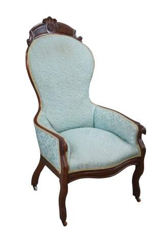 Antique Victorian balloon back arm chair. Made of walnut featuring high back with paneled foliate crest, low arms and serpentine legs with castors. Upholstery by Shillito's Department Store in Cincinnati. Shillito's was the first department store in Cincinnati in 1830. Shillito's merged with Rikes, before becoming Lazarus, which eventually merged into Macy's.
