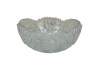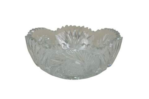 Vintage 20th century clear cut crystal bowl / dish. Round form with a scalloped sawtooth edge. Center cut with a star; sides cut with alternating panels of fan shapes and pinwheels.
