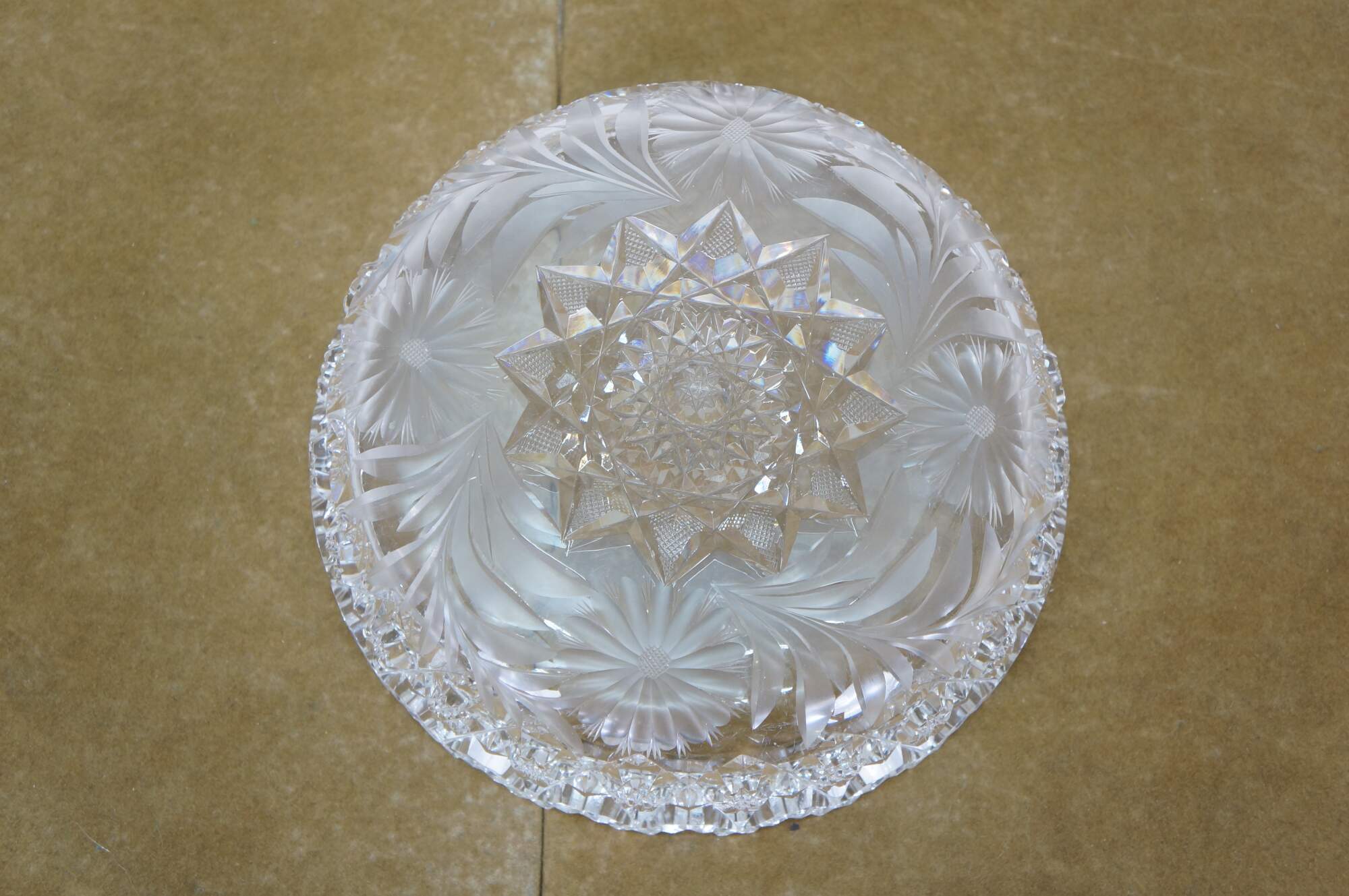 Vintage 20th century cut crystal ashtray / trinket dish / catchall / wine bottle coaster. Round shape with sawtooth edge; diamond and etched star pattern around the sides; center cut with an intricate star framed in a wreath of daisy stems and blossoms.