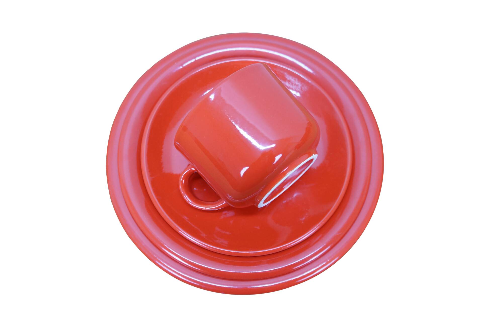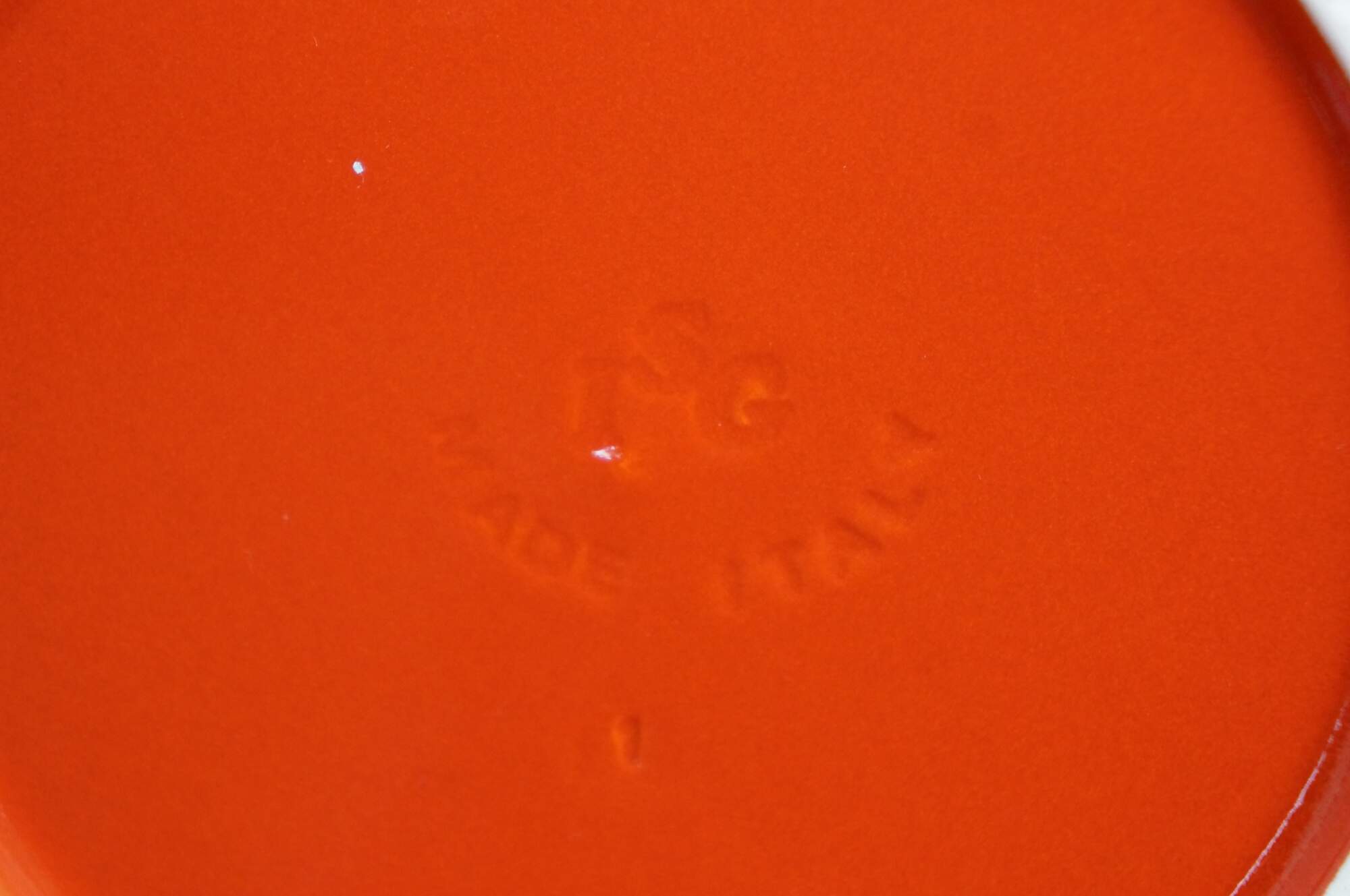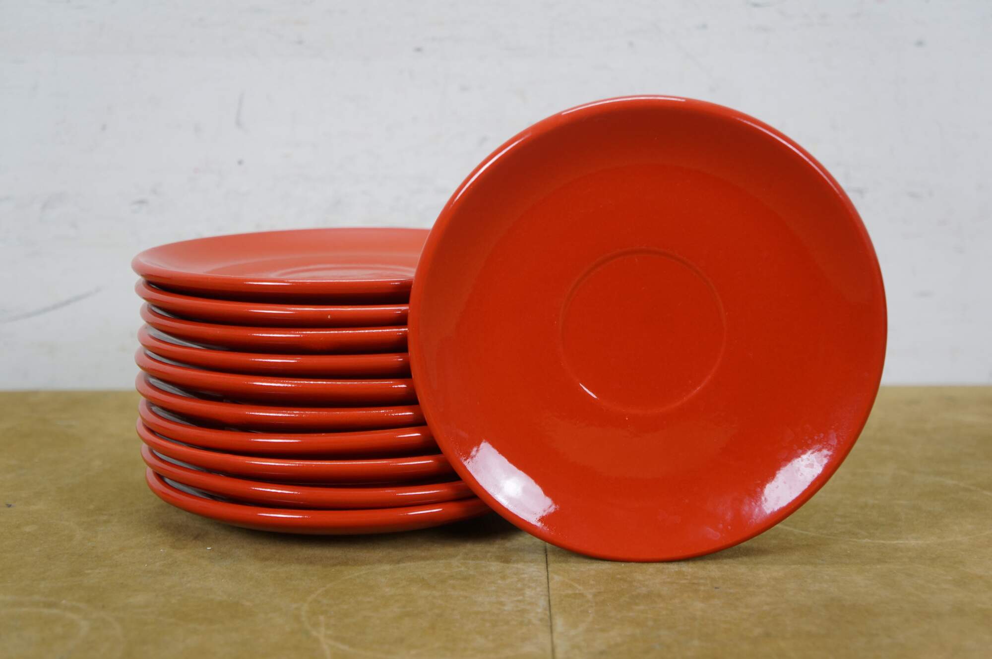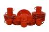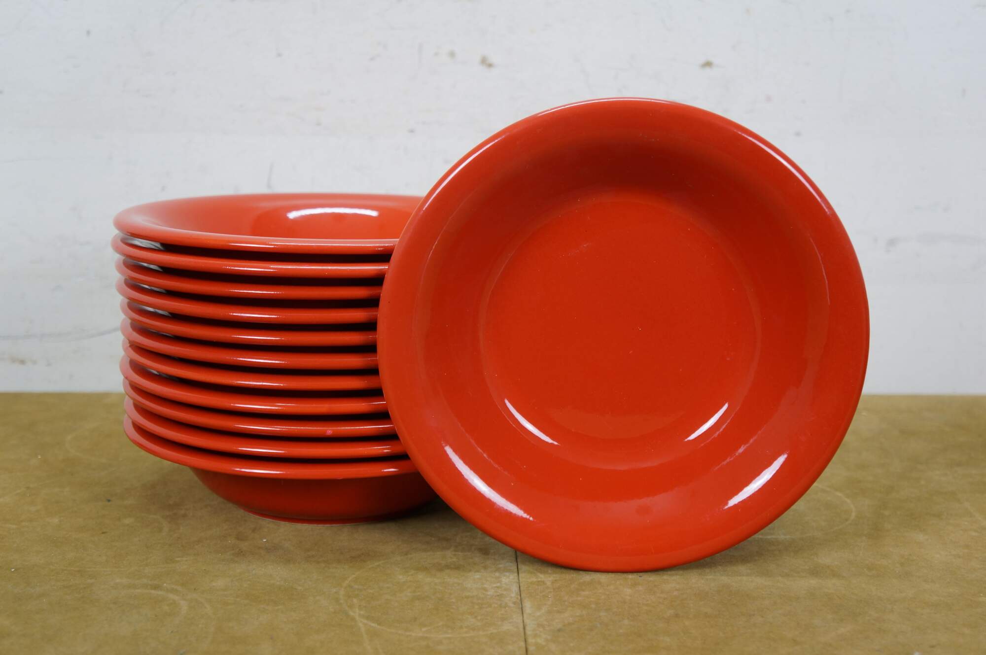Late 20th century 43 piece set of red ISG ceramic dinnerware / china. Made in Italy. Set includes: Serving Bowl, 12 Salad / Soup Bowls, 10 Bread Plates, 11 Saucers, 9 Tea / Coffee Cups