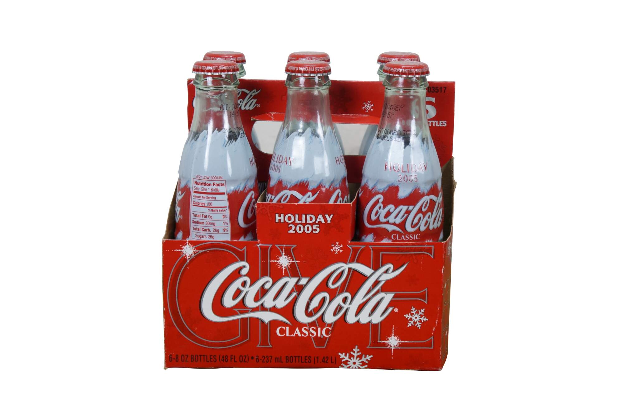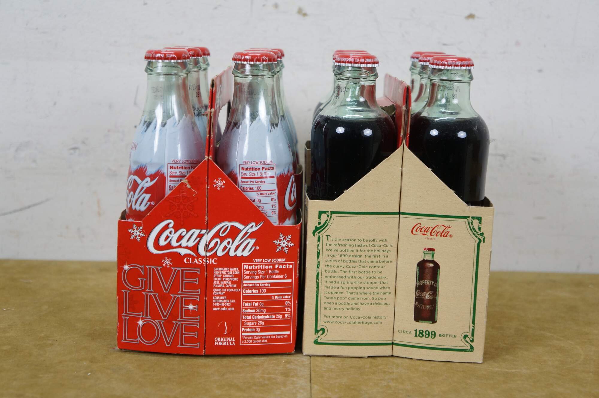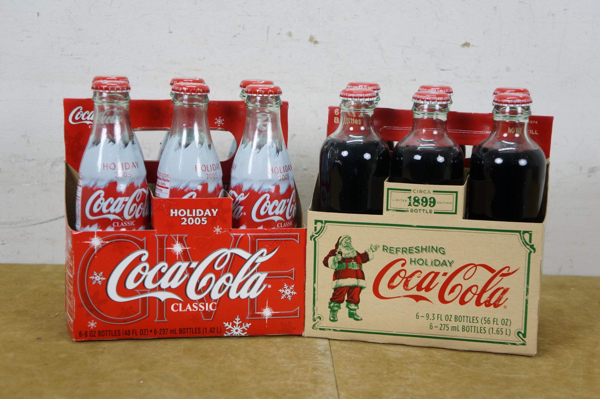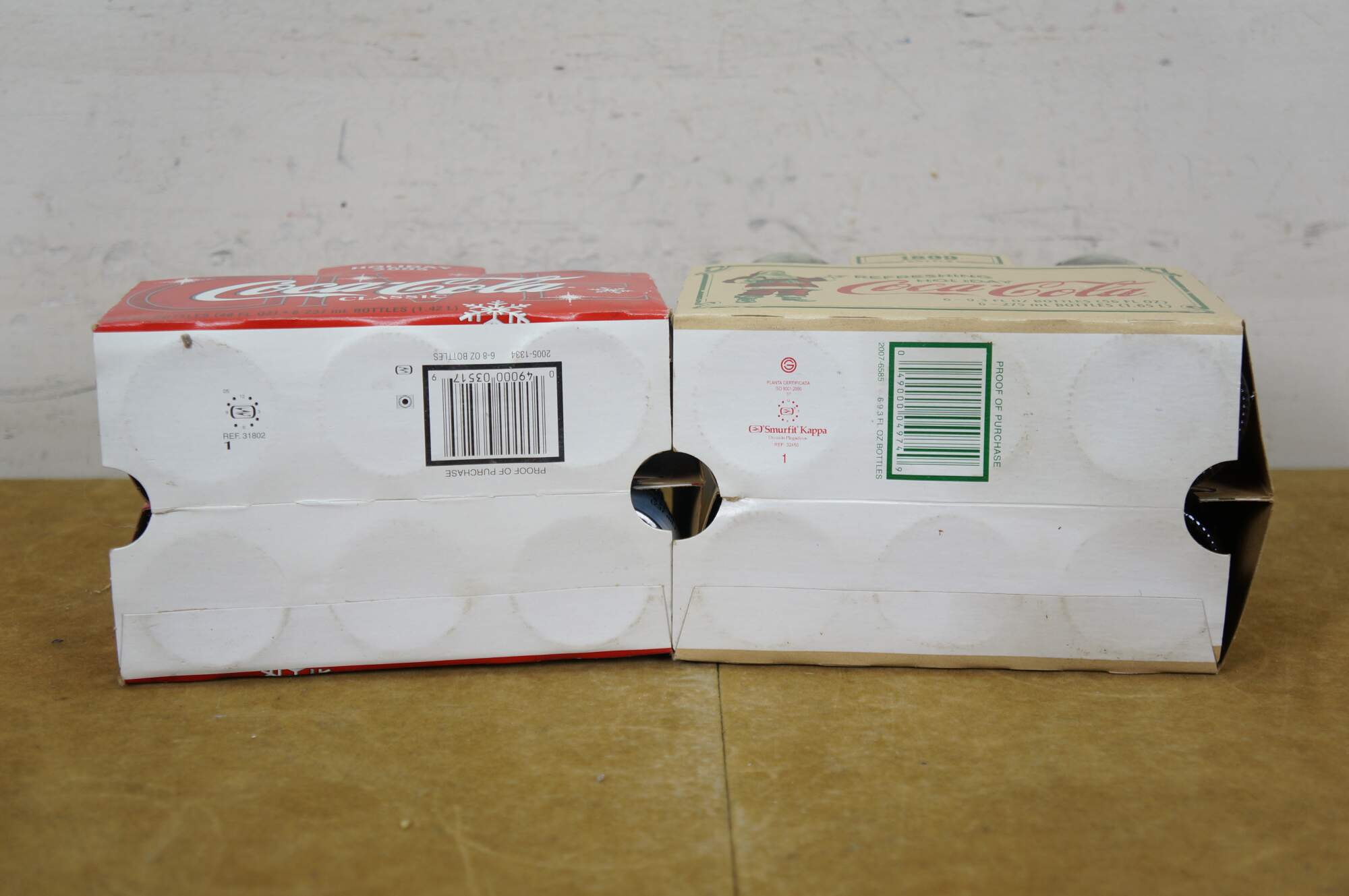 Pair of holiday Coca-Cola glass bottle six packs of sealed bottles in original cardboard carriers - one Holiday 2005 Coca-Cola Classic and one Limited Edition Circa 1899 Bottle Refreshing Holiday Coca-Cola.