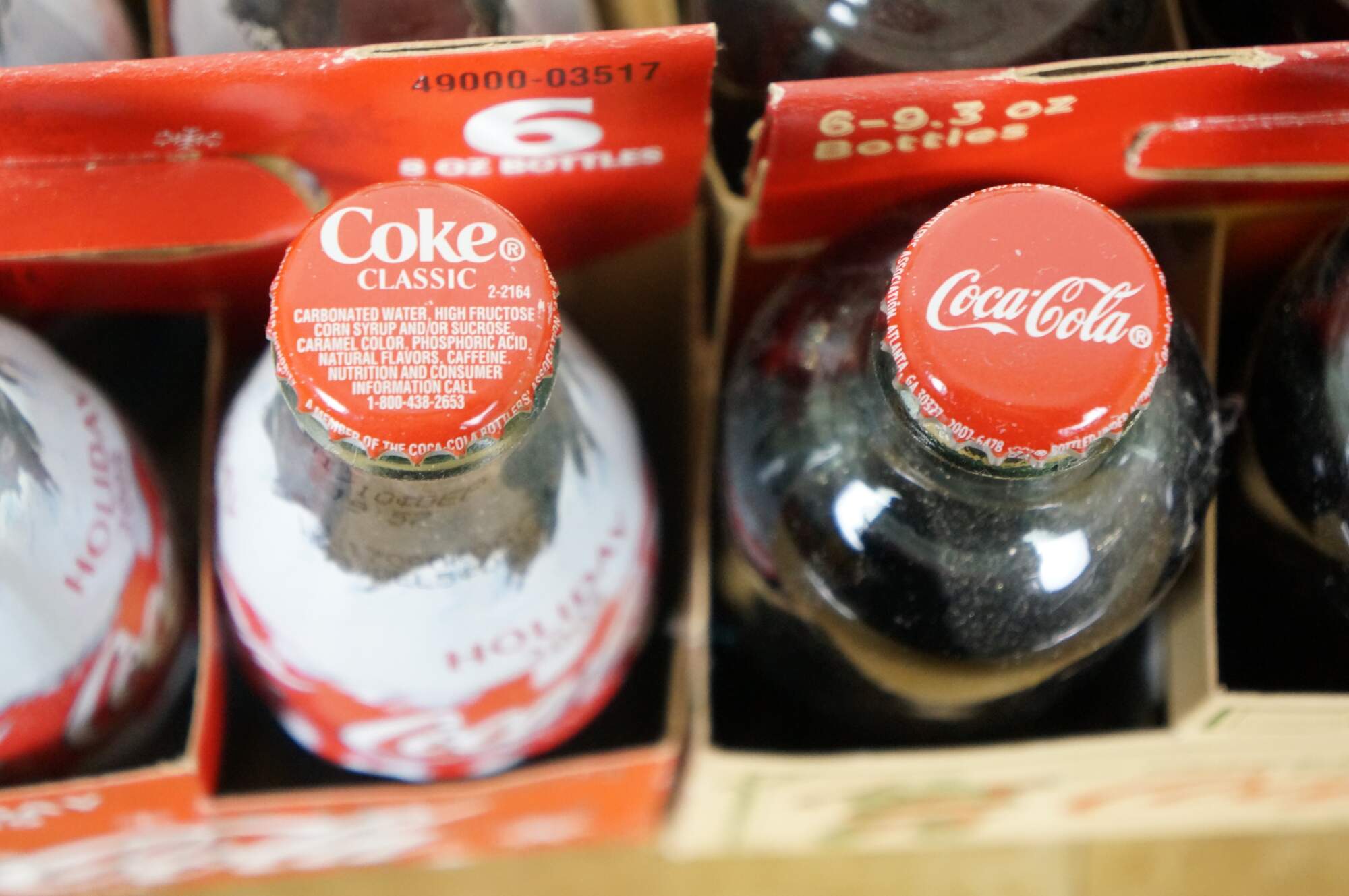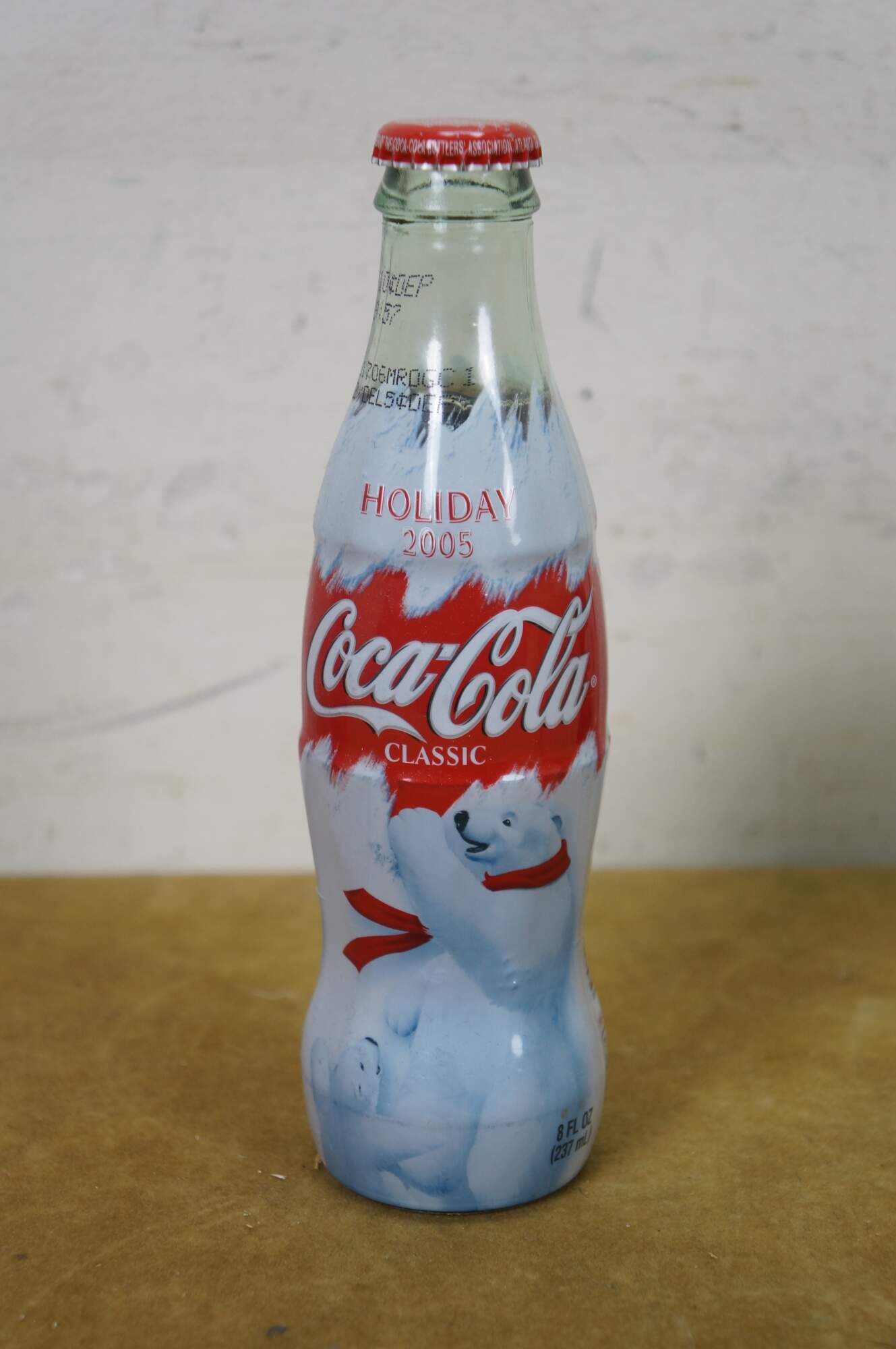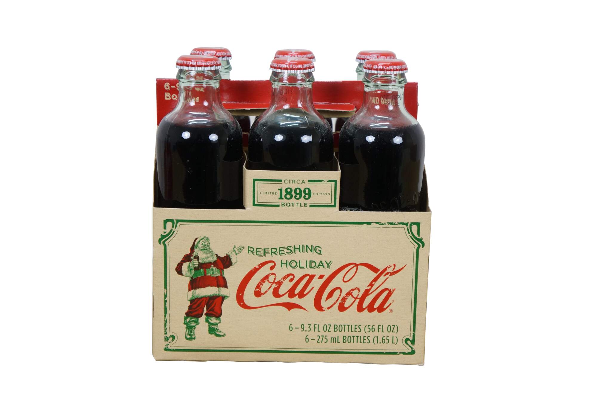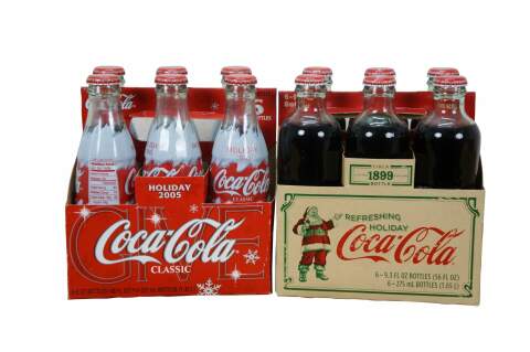 Pair of holiday Coca-Cola glass bottle six packs of sealed bottles in original cardboard carriers - one Holiday 2005 Coca-Cola Classic and one Limited Edition Circa 1899 Bottle Refreshing Holiday Coca-Cola.
