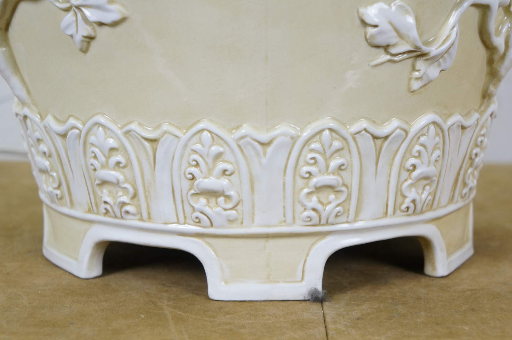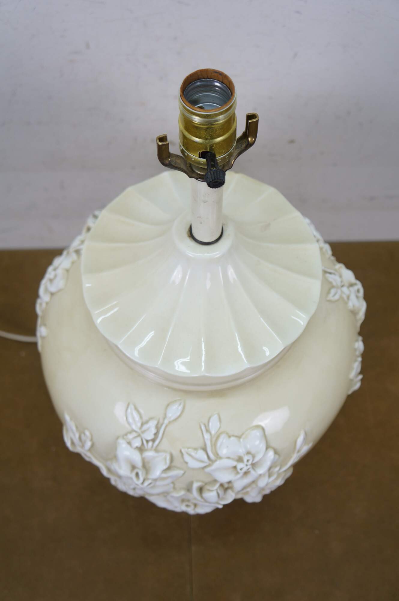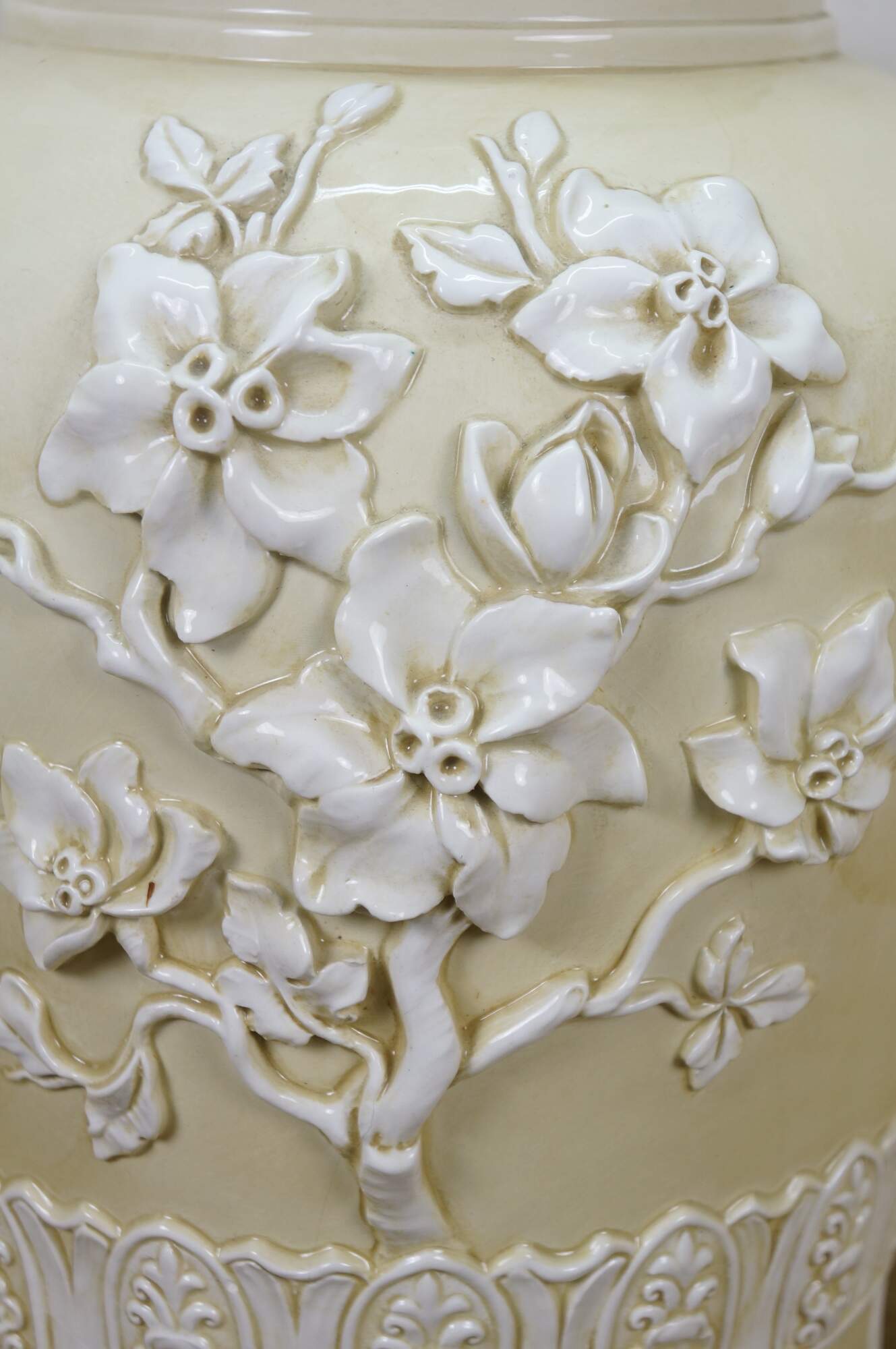 Late 20th century Chinoiserie style table lamp - pale yellow porcelain in the shape of a footed ginger jar with round, pagoda roof style top, with three dimensional flowering branches applied to the sides. Made in Italy 7315. Includes harp, brass finial and white fabric Roseart shade.