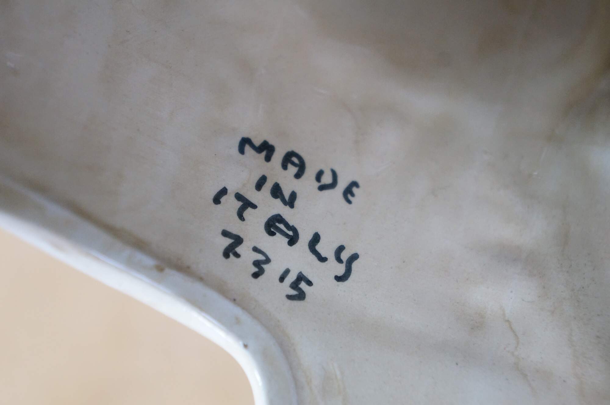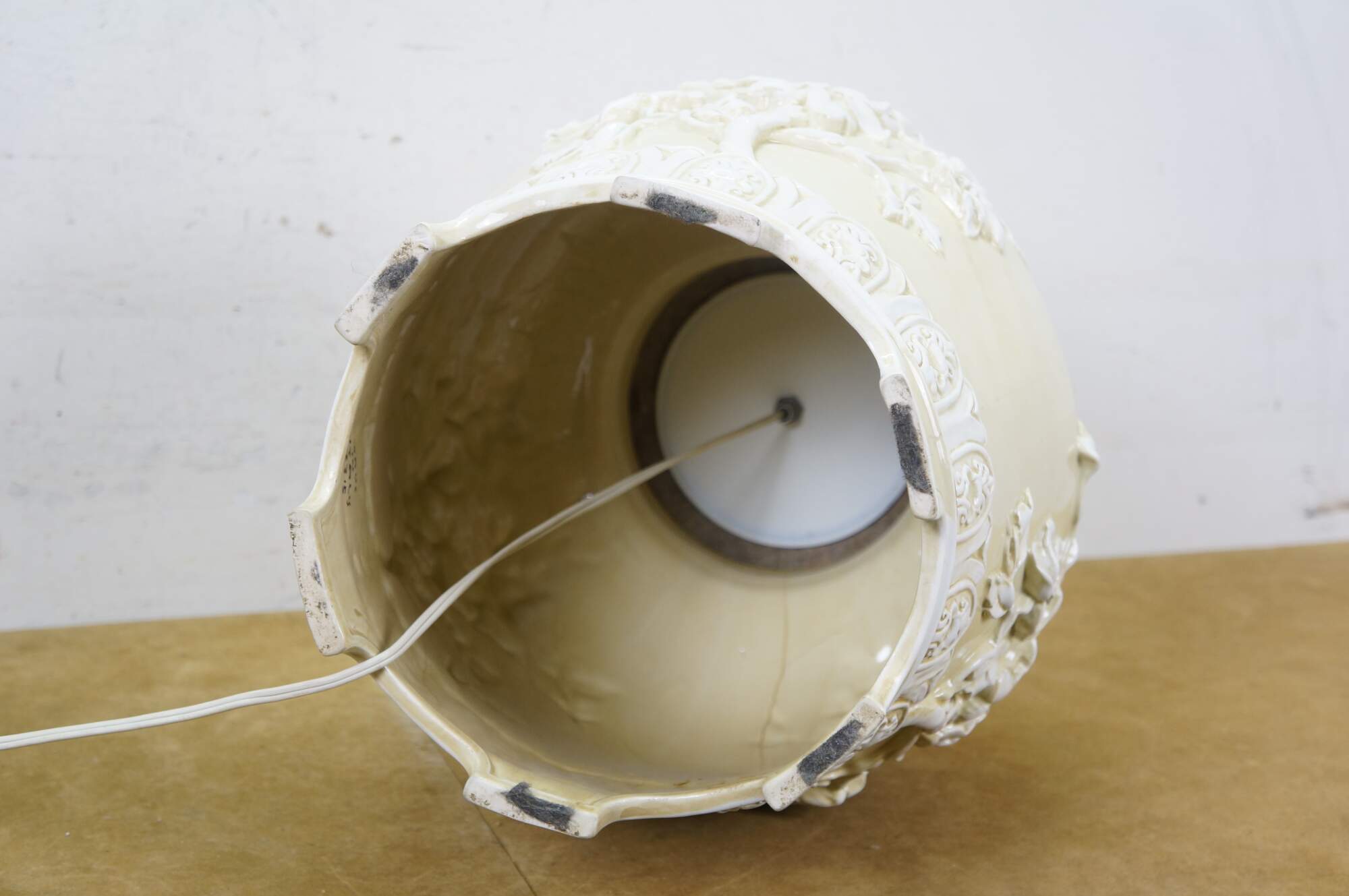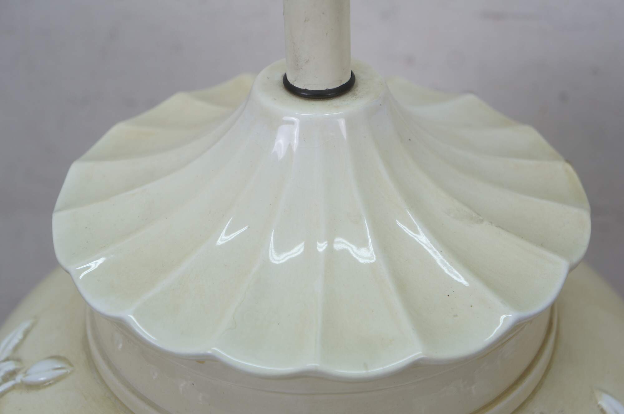Late 20th century Chinoiserie style table lamp - pale yellow porcelain in the shape of a footed ginger jar with round, pagoda roof style top, with three dimensional flowering branches applied to the sides. Made in Italy 7315. Includes harp, brass finial and white fabric Roseart shade.
