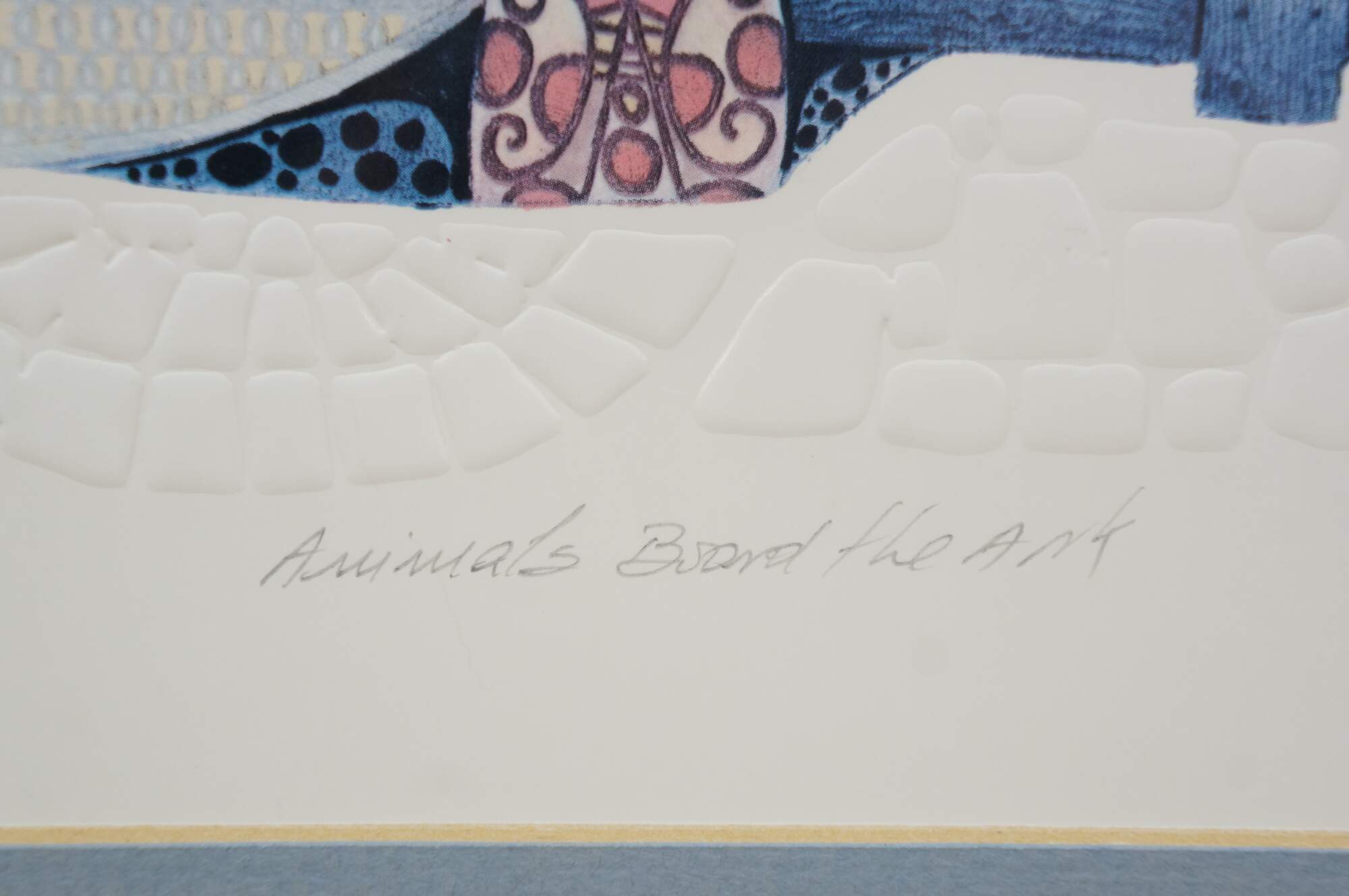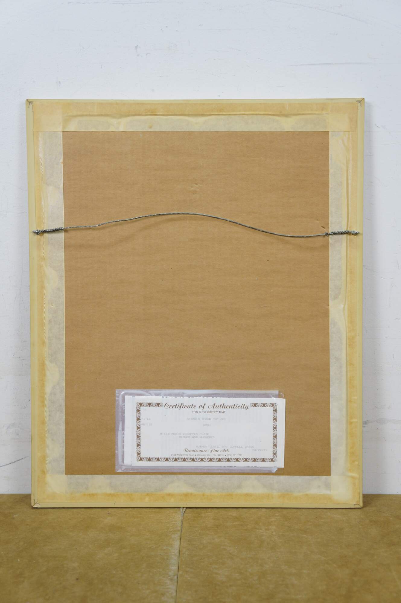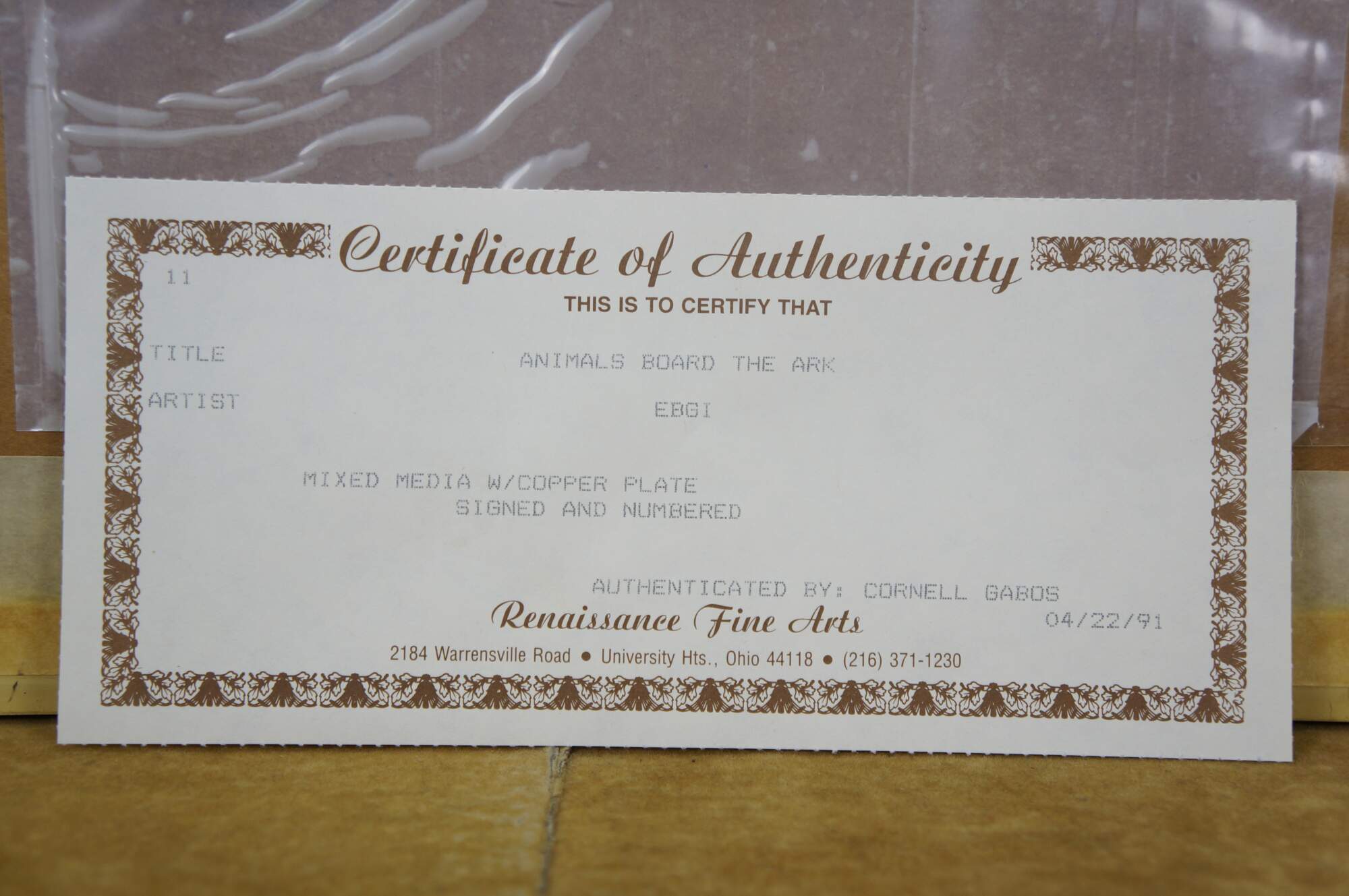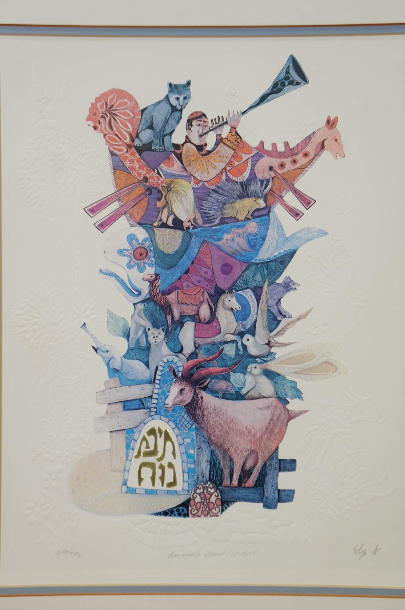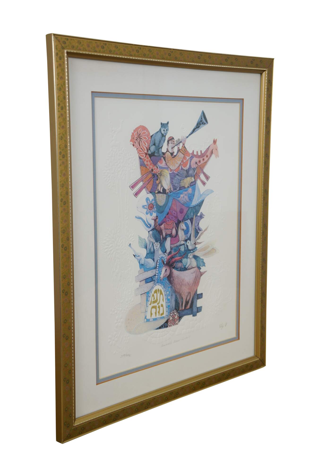 Vintage mixed media with copper plate titled "Animals Board the Ark" by Amram Ebgi. Depicts a colorful stack of of animals topped with Noah in the Ark, blowing a horn, framed with other embossed animals around the central image. Pencil signed, titled and numbered 359/950 II. Includes artist biography and Certificate of Authenticity from Renaissance Fine Arts, Authenticated by Cornell Gabos, 04/22/91. Gilt frame with printed daisy detail; no mat.