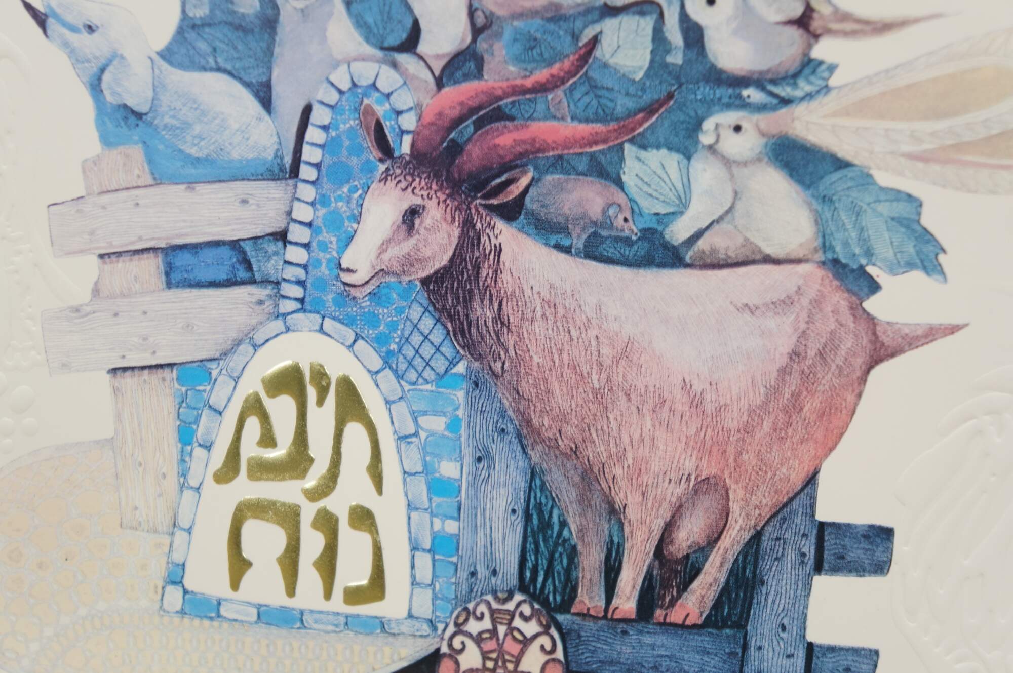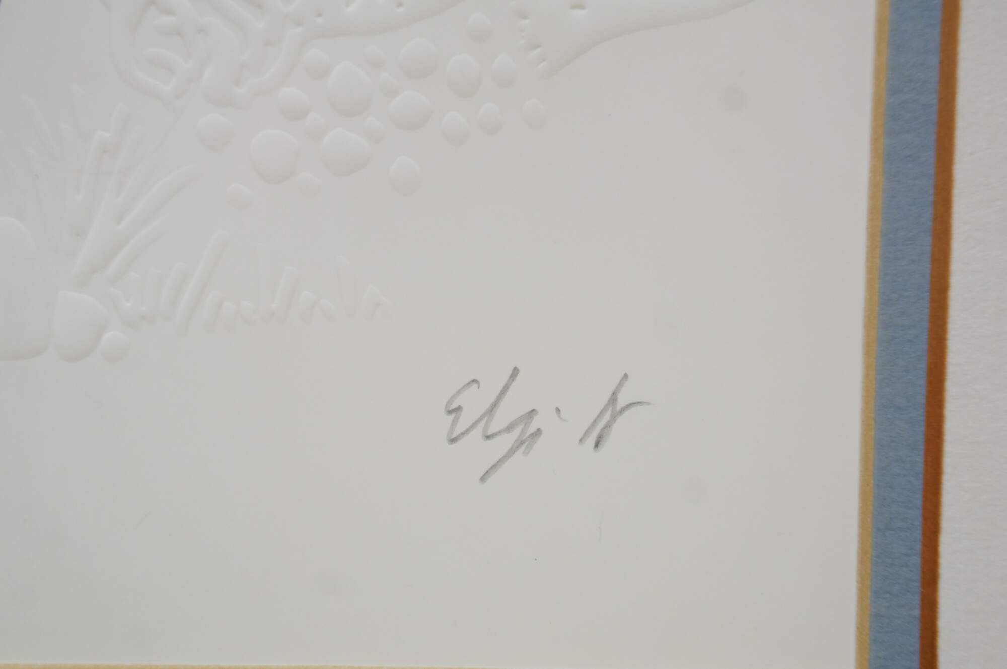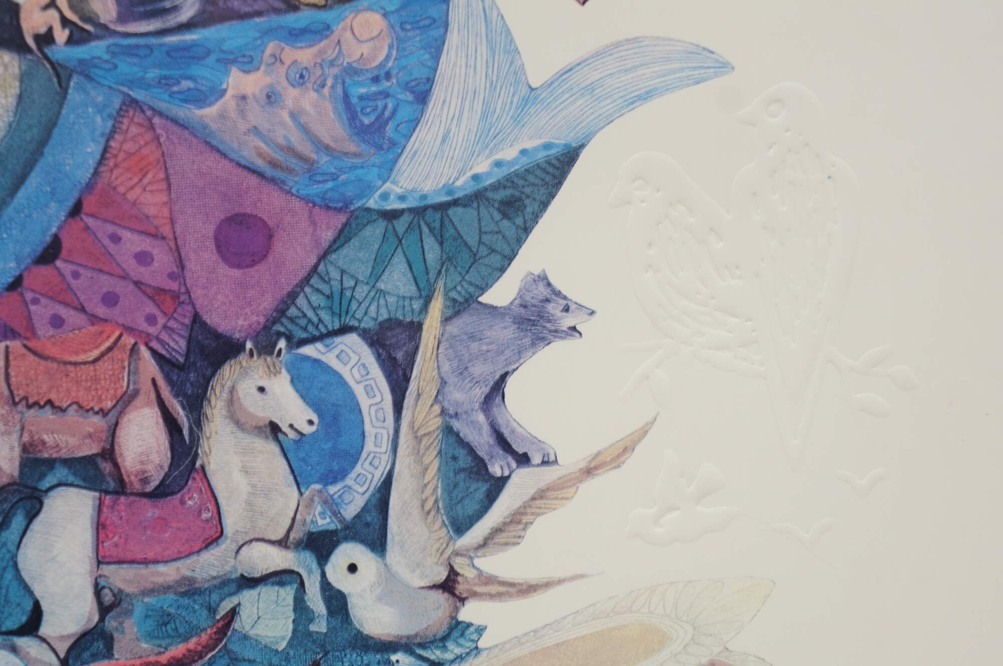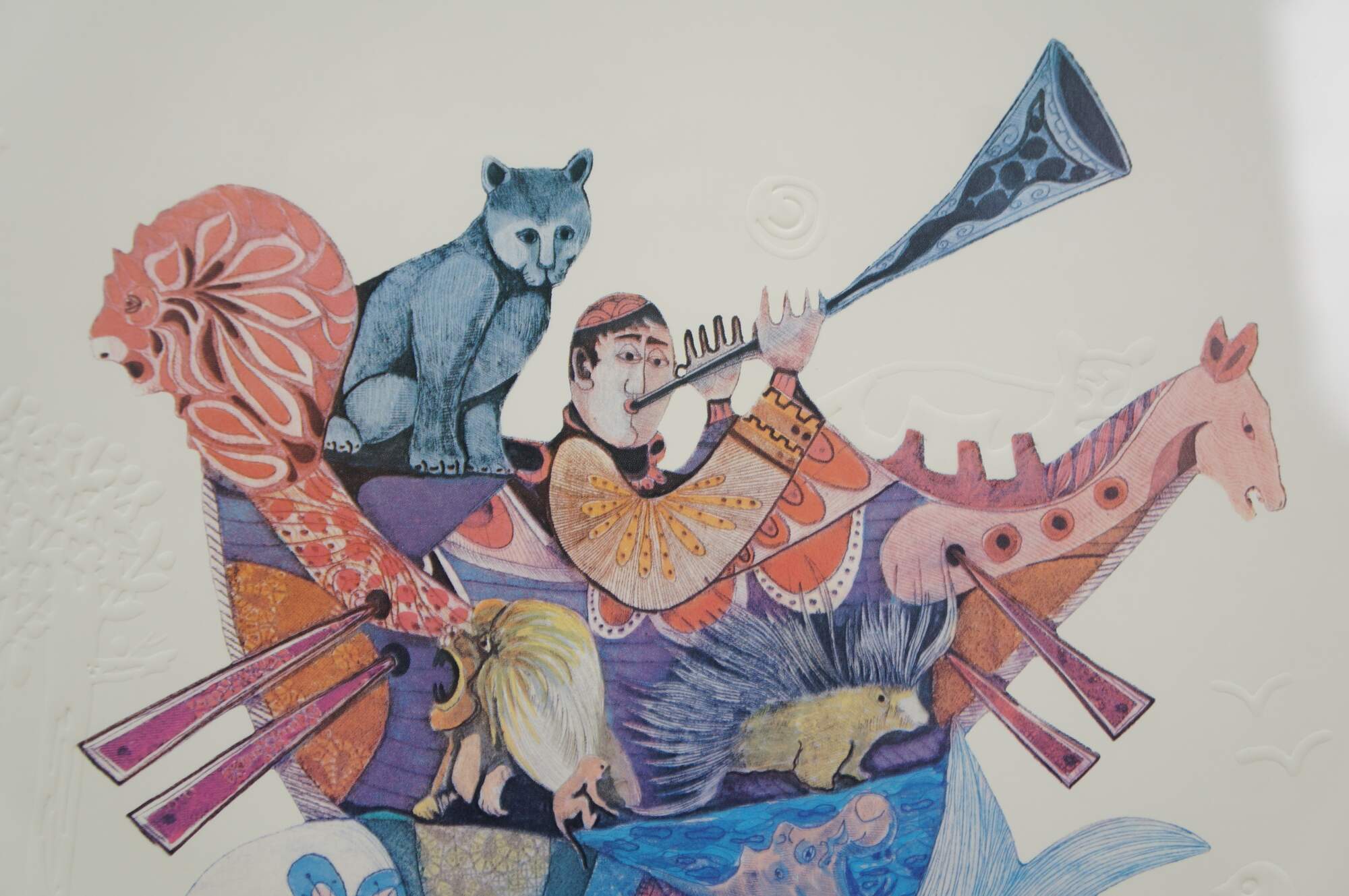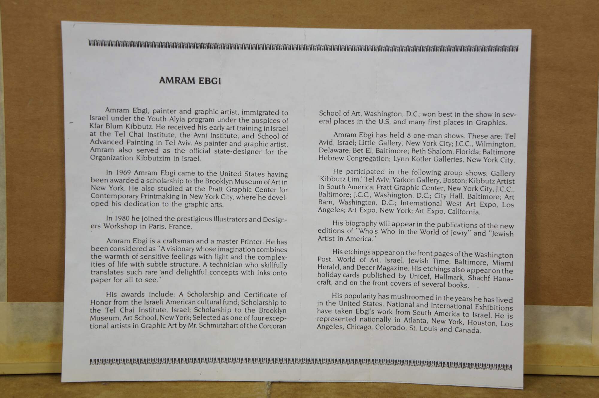 Vintage mixed media with copper plate titled "Animals Board the Ark" by Amram Ebgi. Depicts a colorful stack of of animals topped with Noah in the Ark, blowing a horn, framed with other embossed animals around the central image. Pencil signed, titled and numbered 359/950 II. Includes artist biography and Certificate of Authenticity from Renaissance Fine Arts, Authenticated by Cornell Gabos, 04/22/91. Gilt frame with printed daisy detail; no mat.