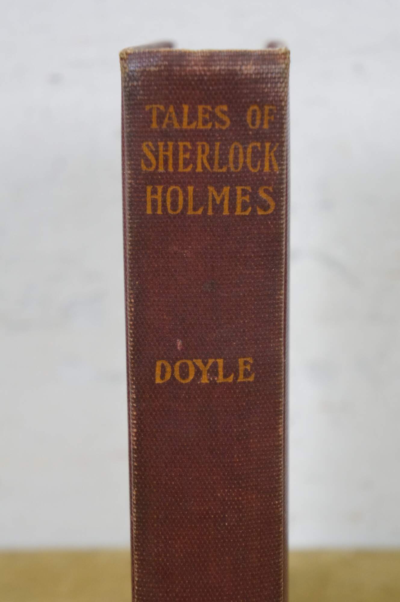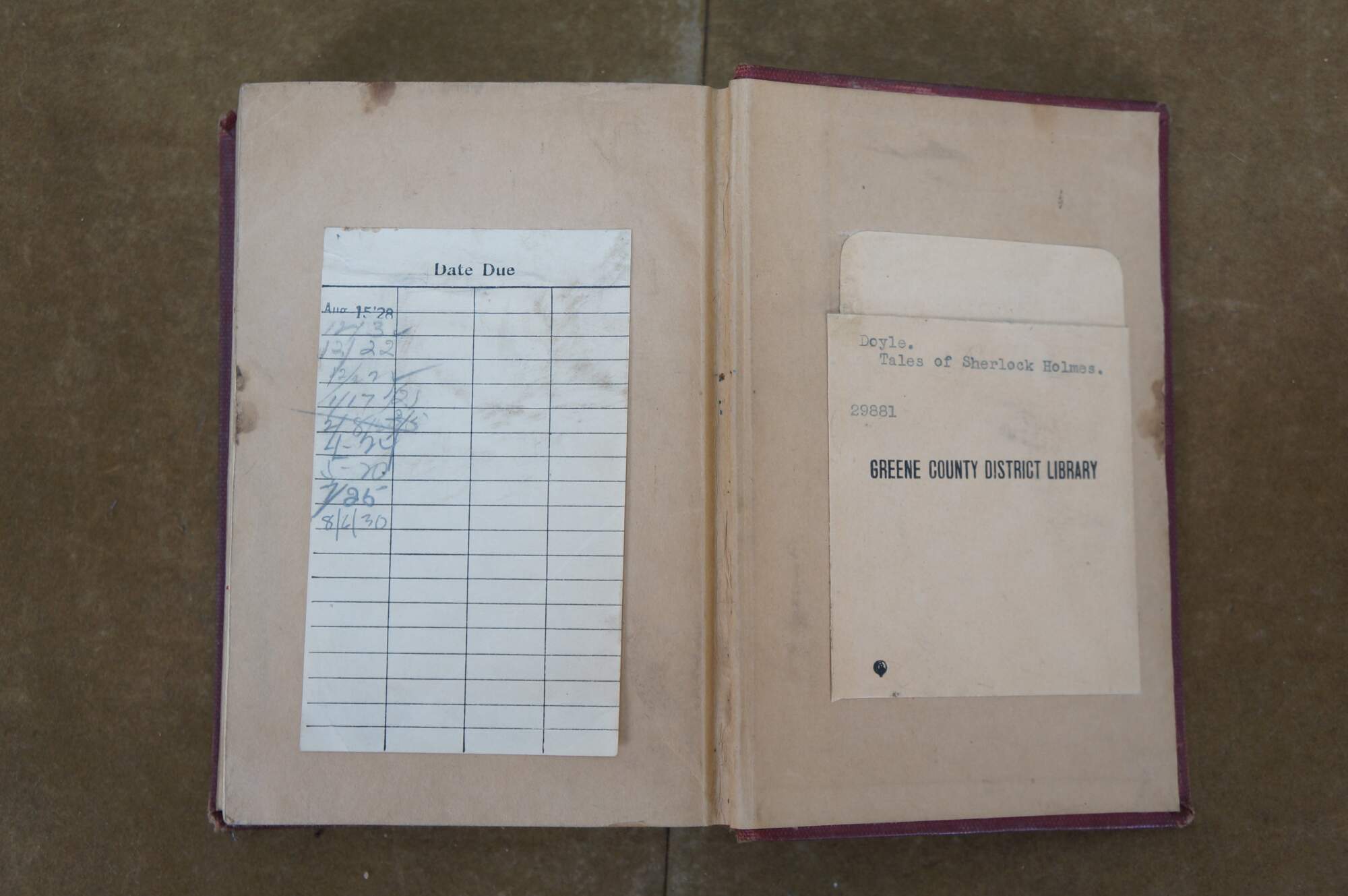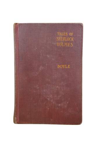 Antique early 20th century hard cover copy of "Tales of Sherlock Holmes" by Sir Arthur Conan Doyle - Published by Grosset & Dunlap - Made in the United States of America. Formerly in the collection of the Greene County District Library, due date slip shows check outs from the1920s-1930s. Hard back / hard cover, red cloth binding with stamped details. No jacket.