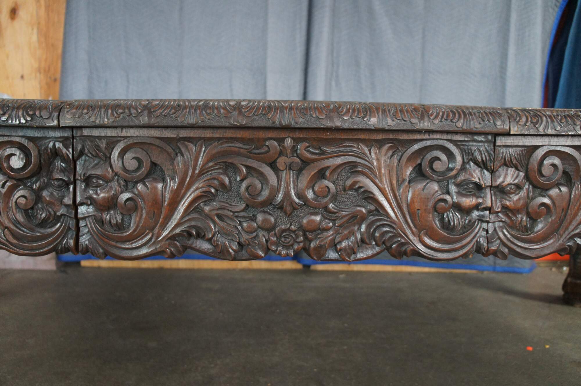 Exceedingly Rare Italian Renaissance Revival figural mahogany dining table, circa 1850-1870s. The table can be used in its smaller rounded form at 59" or extended to 125" for formal dining use. The table showcases an acanthus carved edge over a hand carved low relief apron with scrolling foliate, grotesque northwind faces flanked by cherubs, scalloping and acanthus relief. The table is supported by four robust fully carved Atlas figures with crossed arms over leafy scrolled lower body leading to large claw feet. Includes three leaves for extension. The table retains the original buzzer button that would have been used by the head of the house to signal to the butlers for service. This one of a kind piece will make the perfect statement for any grand dining room or great room.