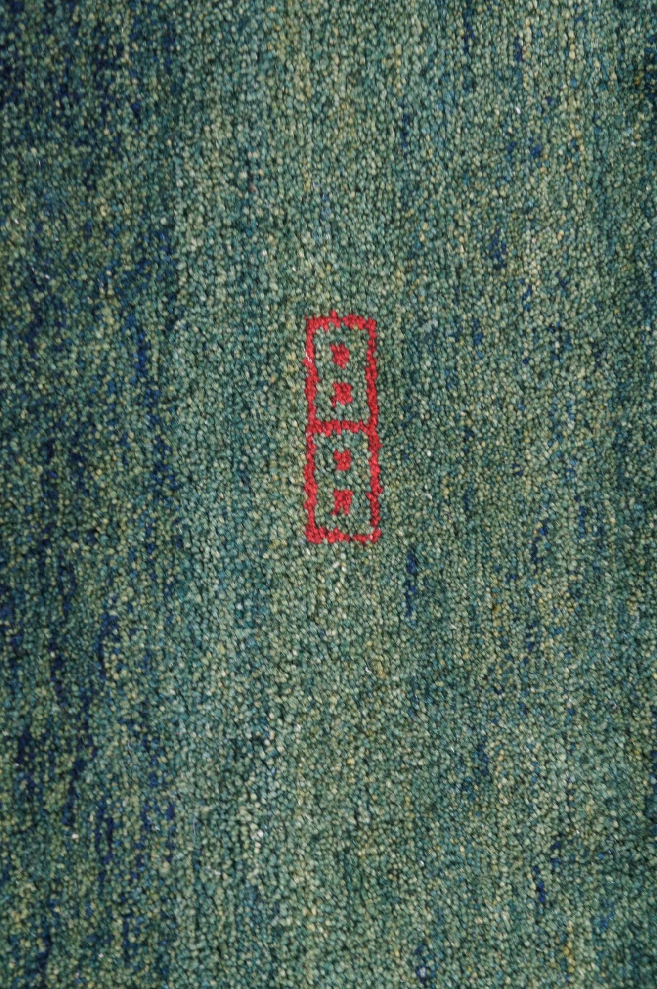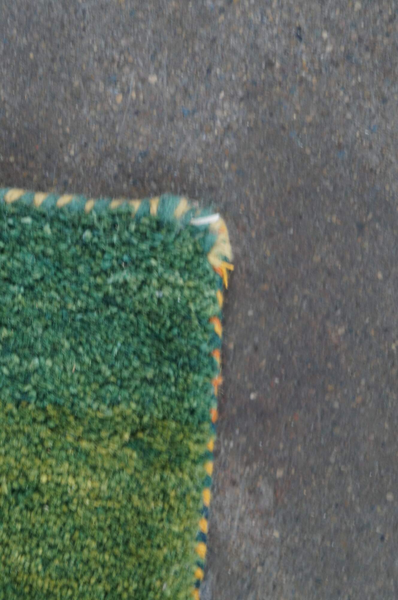 Hand Knotted Indian Gabbeh Wool Area Rug. Features a Modern design with green pile accented with red trees and figures.