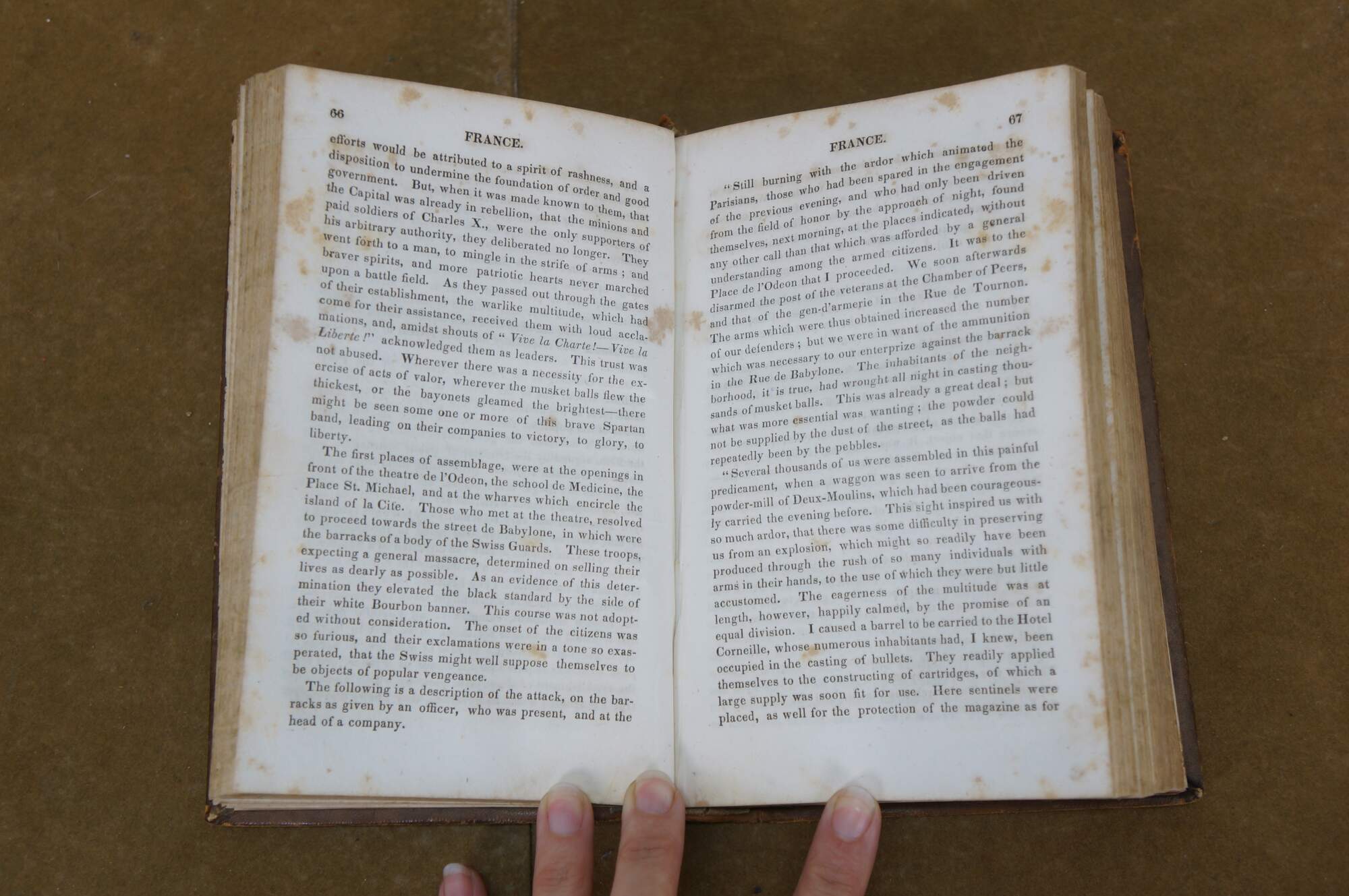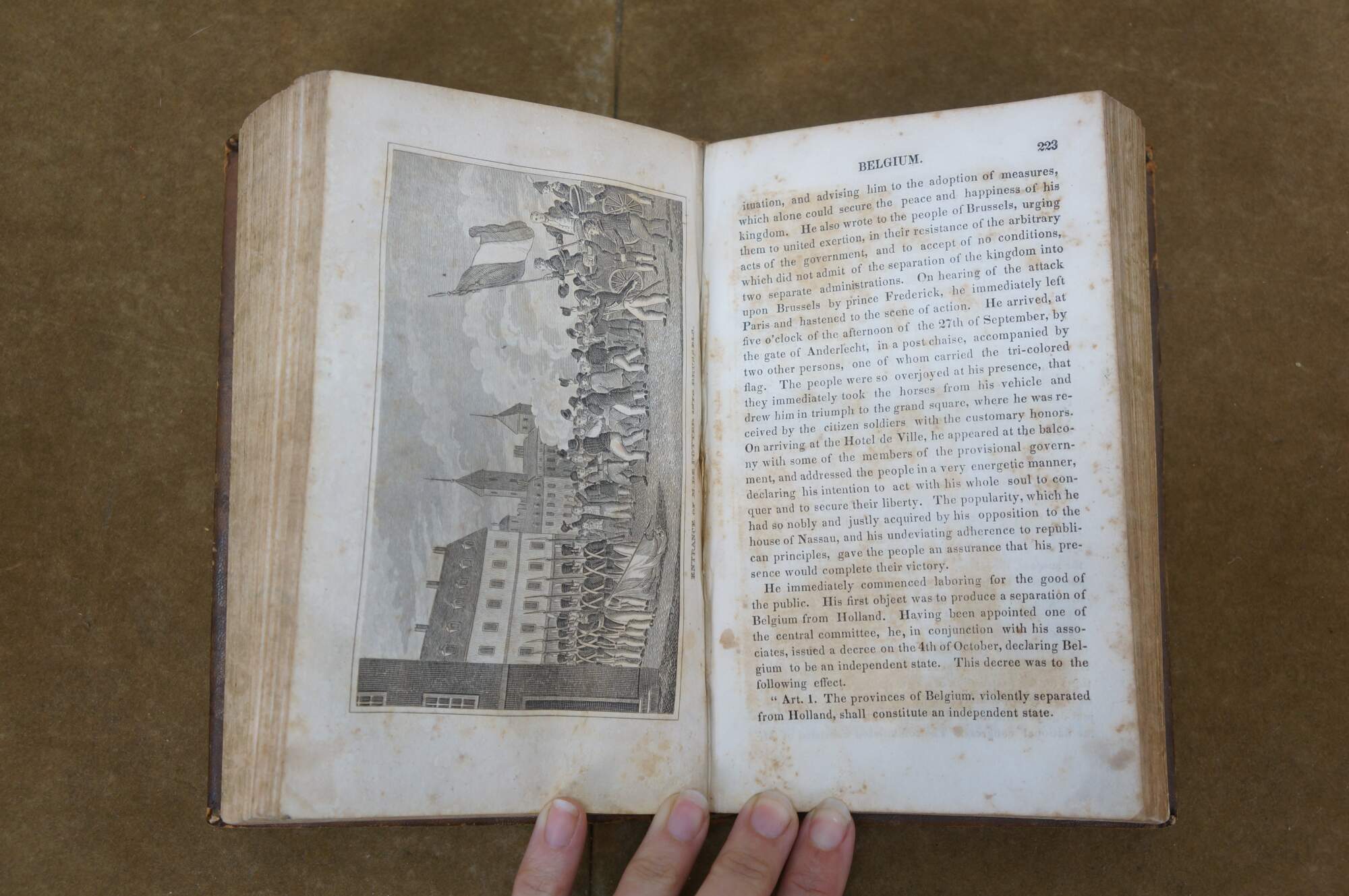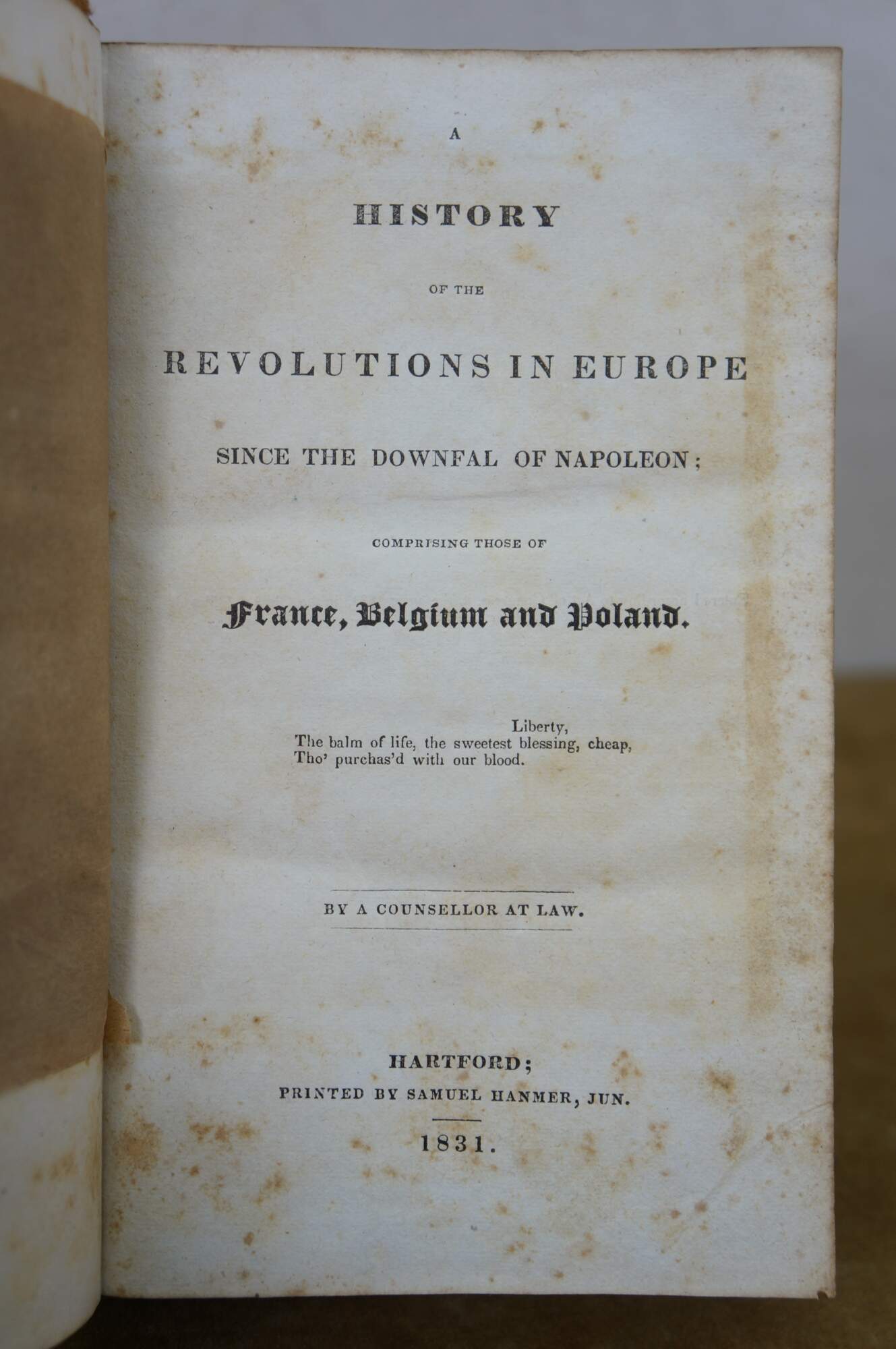 Antique hard cover copy of "A History of Revolutions in Europe Since the Downfall of Napoleon: Comprising Those of France, Belgium, and Poland" by A Counsellor at Law - Hartford, Printed by Samuel Hanmer, Jun 1831 - Entered According to Act of congress in the year 1831, in the Clerk's Office of the district Court of Connecticut.Hard back / hard cover, brown leather binding with stamped gilt details.