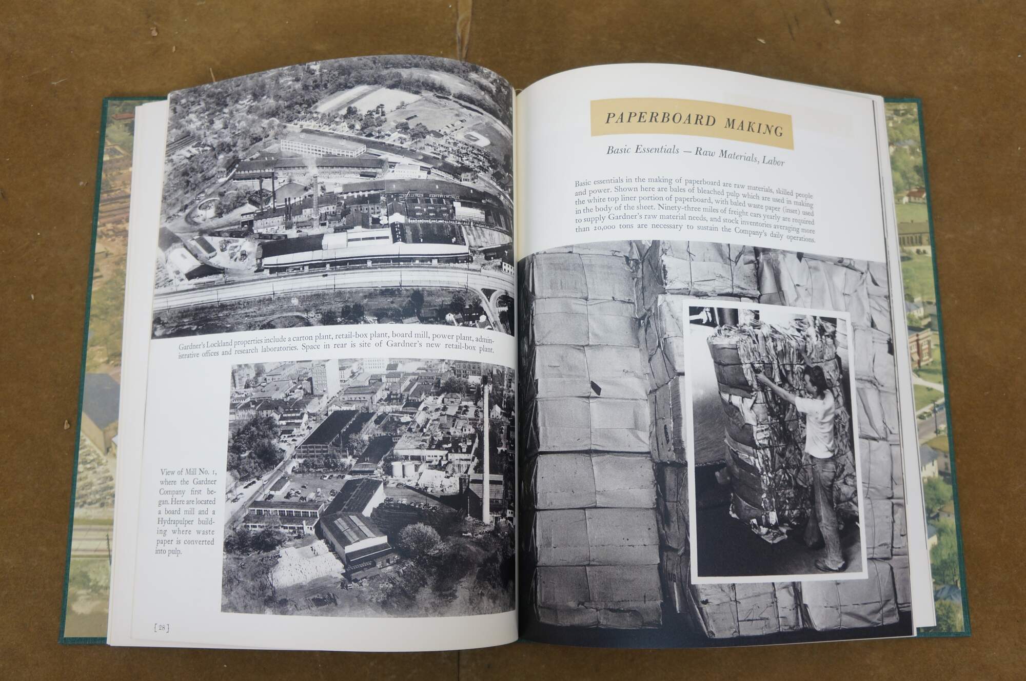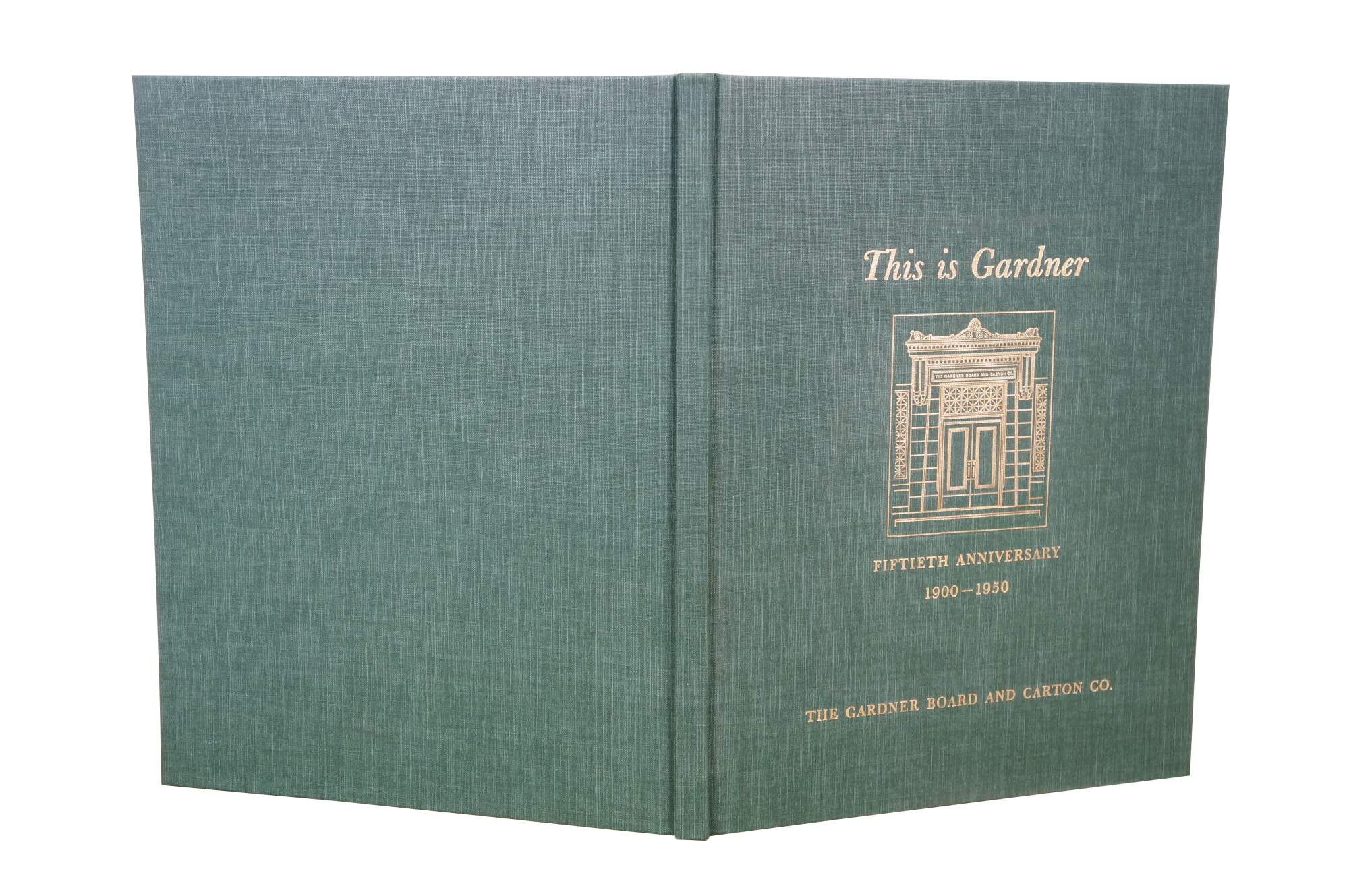 Vintage hard cover commemorative book, "This Is Gardner: Fiftieth Anniversary 1900-1950" - Copyright 1950, The Gardner Board and Carton Company, Middletown, Ohio / Lockland-Cincinnati, Ohio. Hard back / hard cover, green cloth binding with stamped gilt details. Cardboard cover.