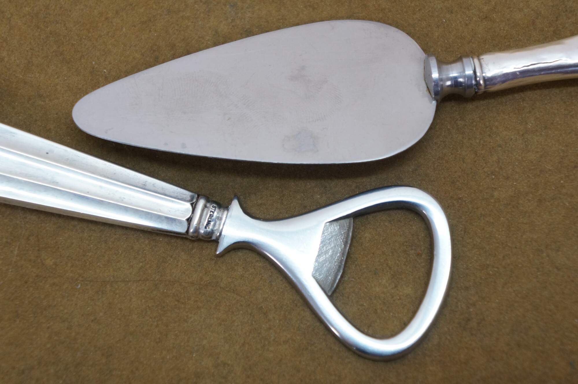 Antique / vintage 20th century lot of 6 assorted utensils with stainless steel blades and sterling silver handles. Includes three butter knives / spreaders, one cheese knife, one fish knife, and one bottle opener. Brands include Towle, Steiff, and Colonial Williamsburg.