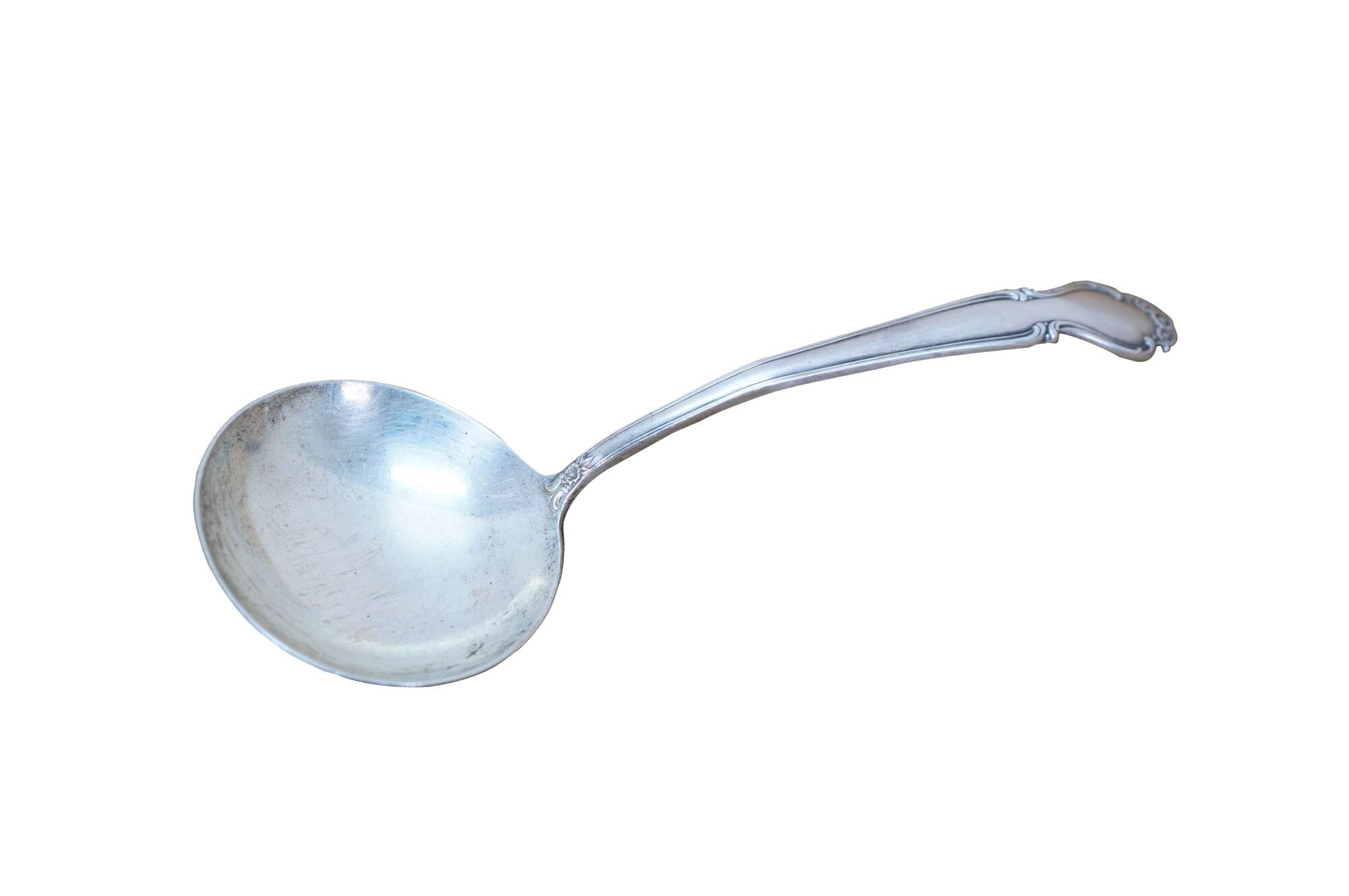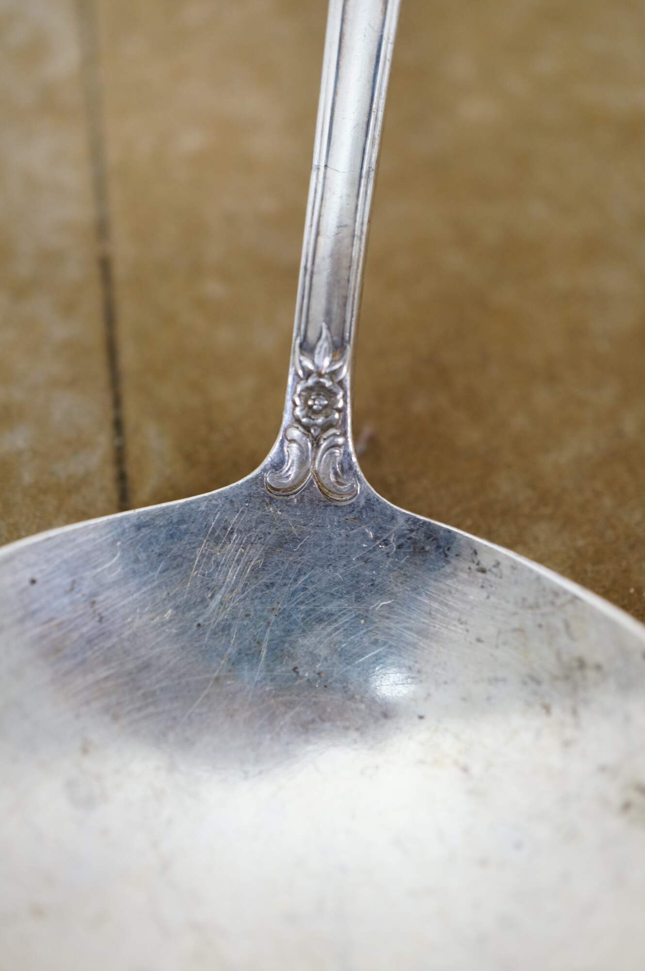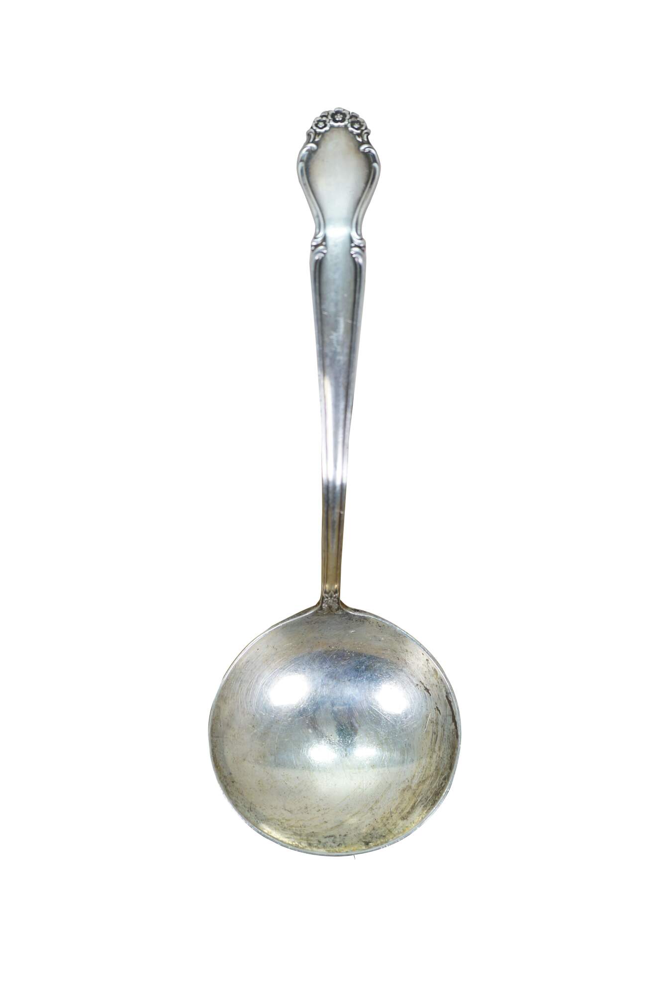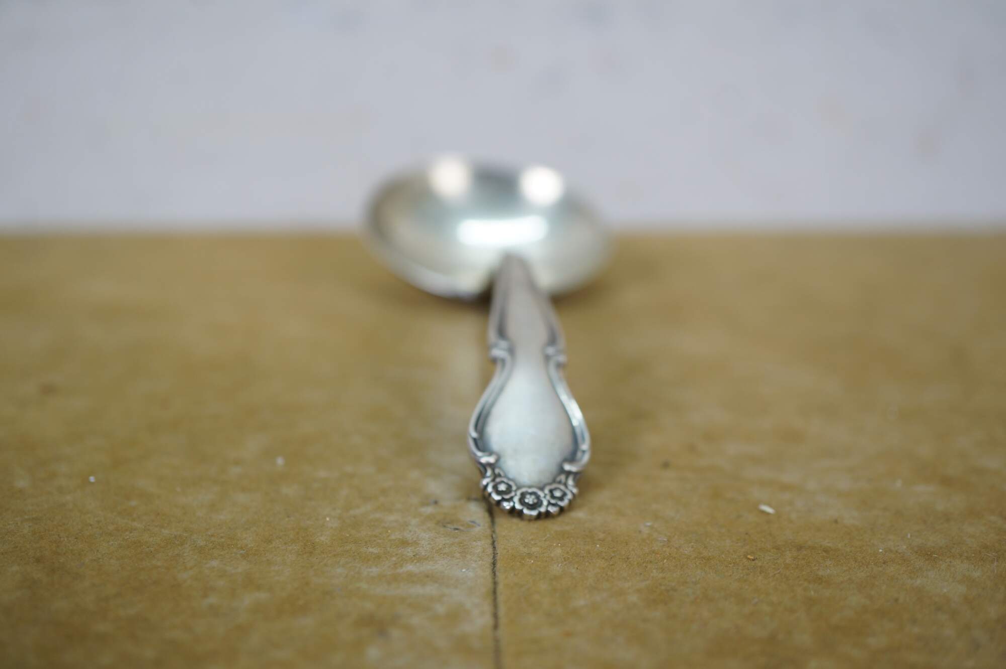 Mid 20th century William Rogers Mfg Co / International Silver Co sterling silver sauce ladle spoon in the Wedding Bells pattern (produced circa 1948-1959, designed by Alexandra A Dabrowski).