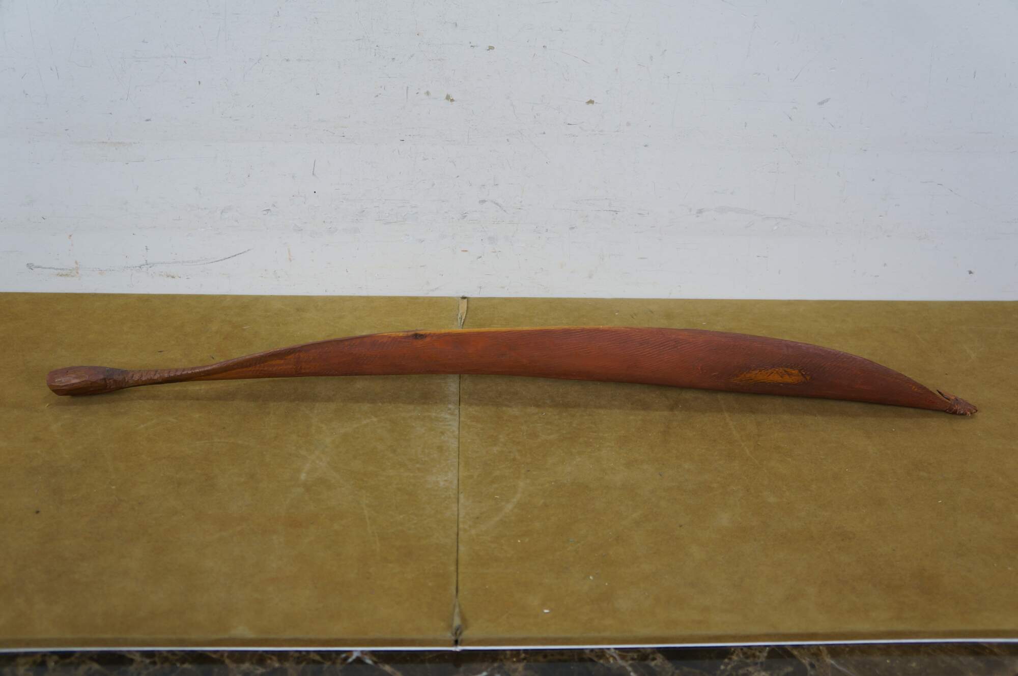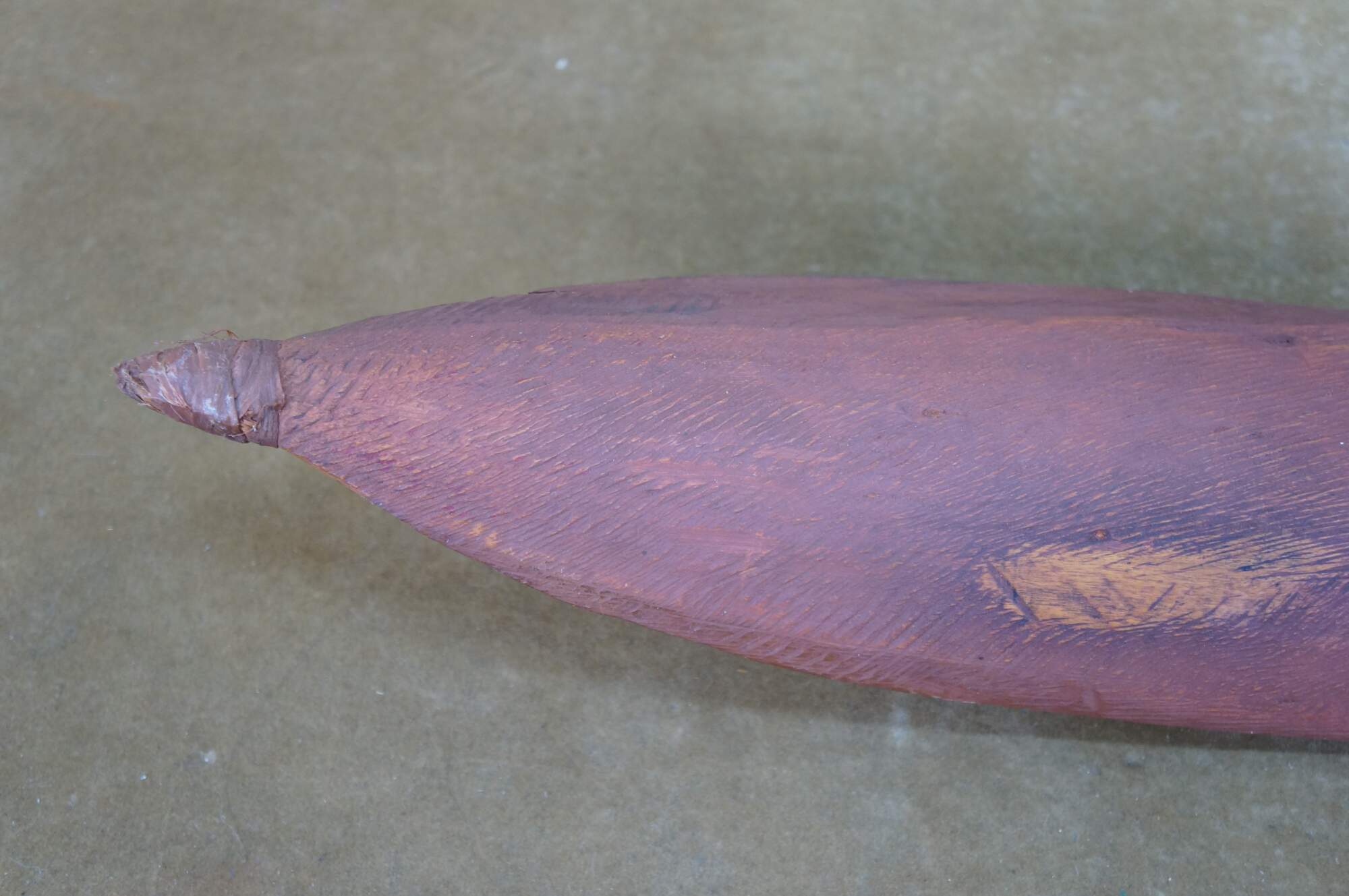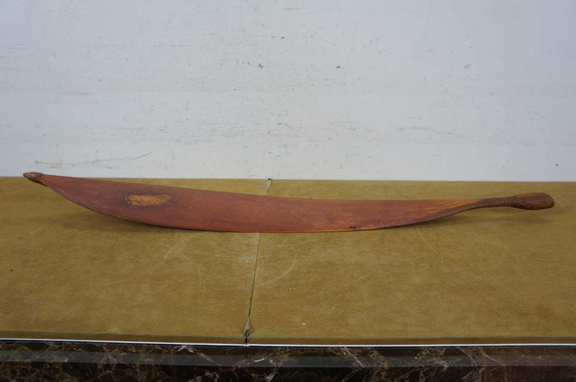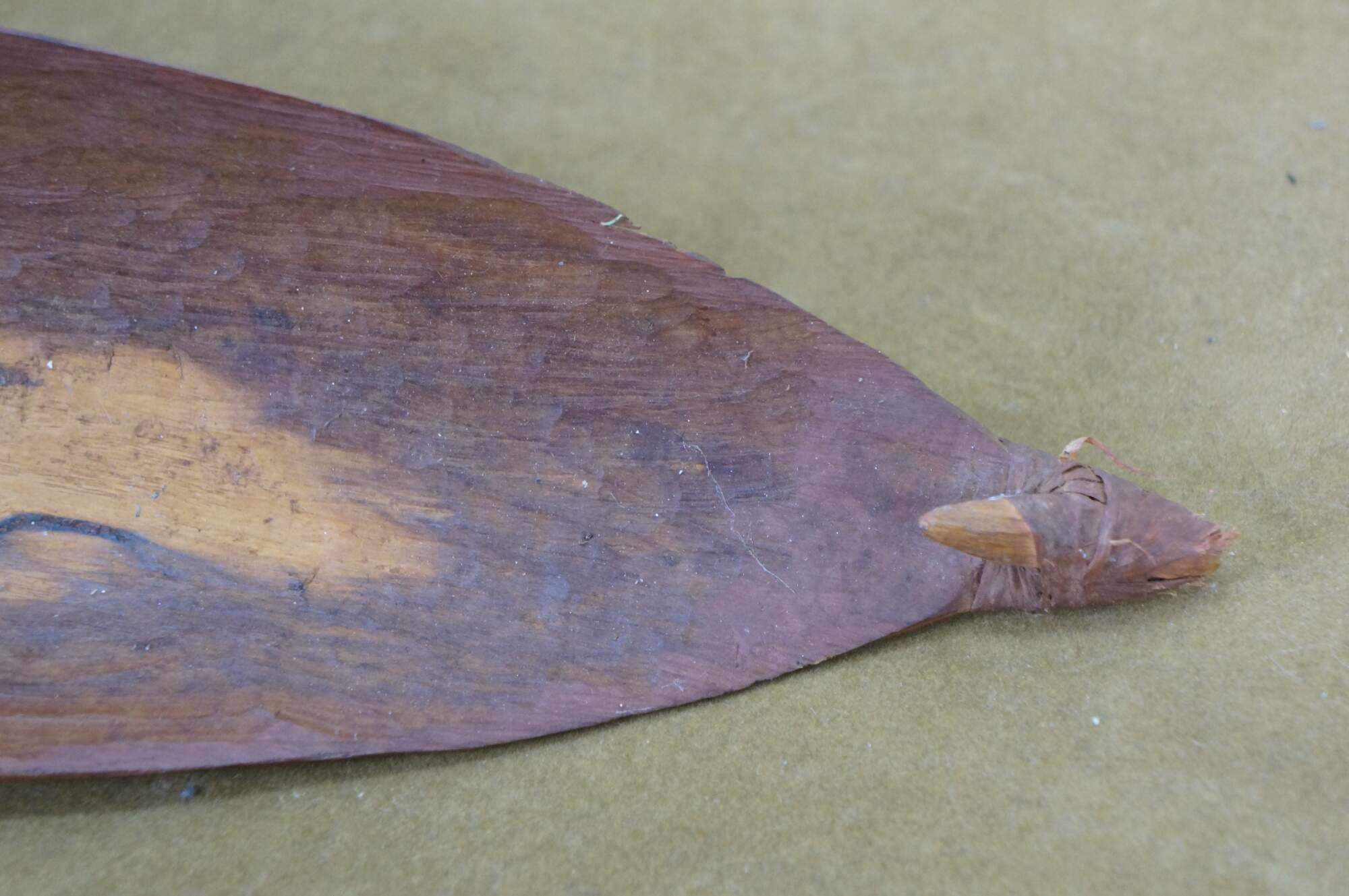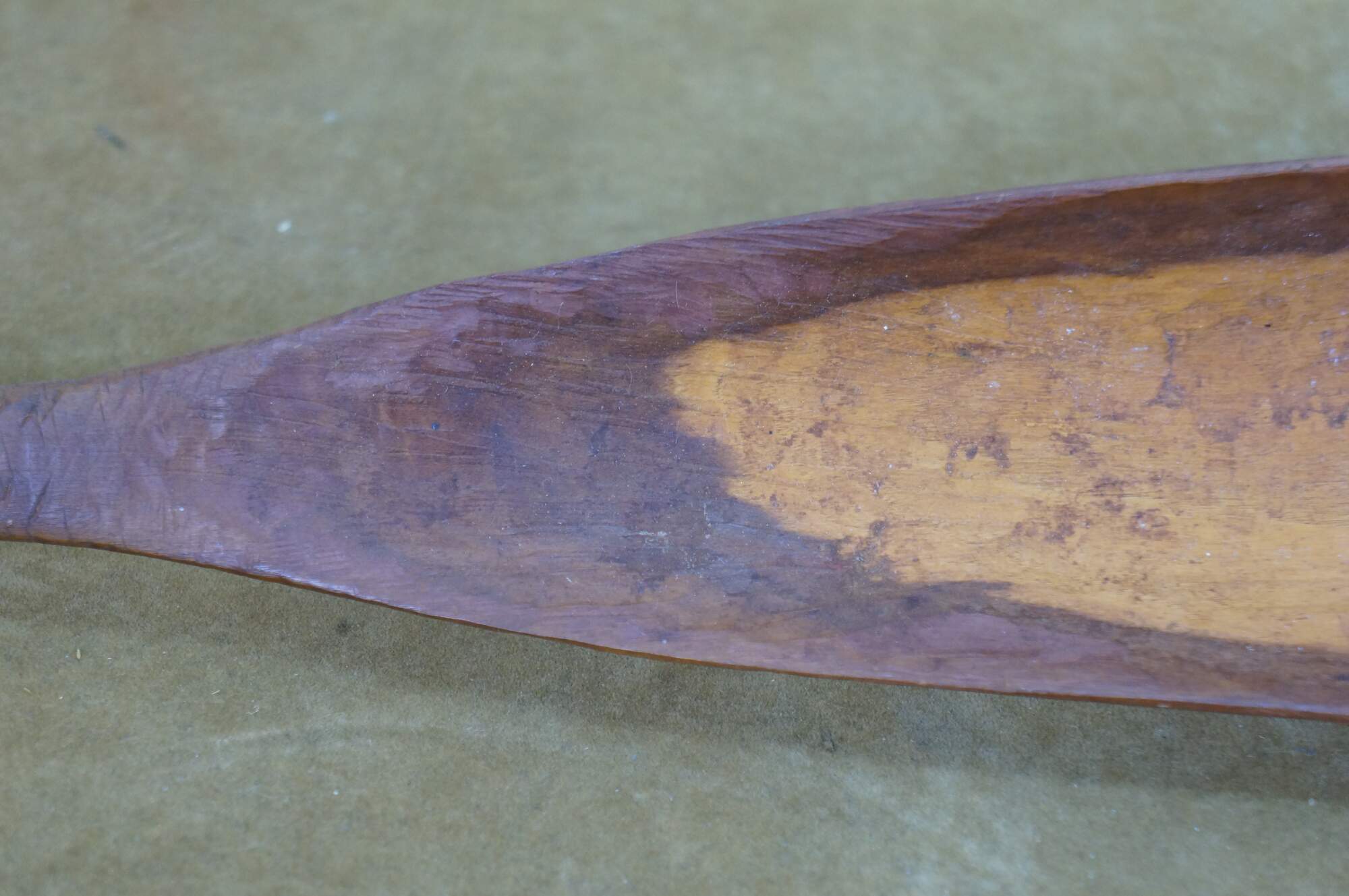 Vintage 20th century Australian aboriginal wooden woomera or hunting spear. Leaf shaped throwing spear hand carved in two toned wood.