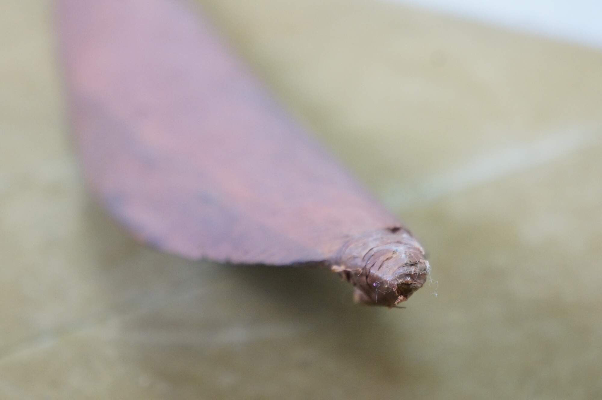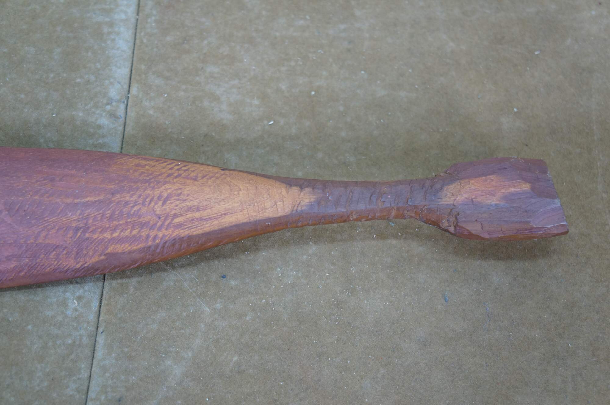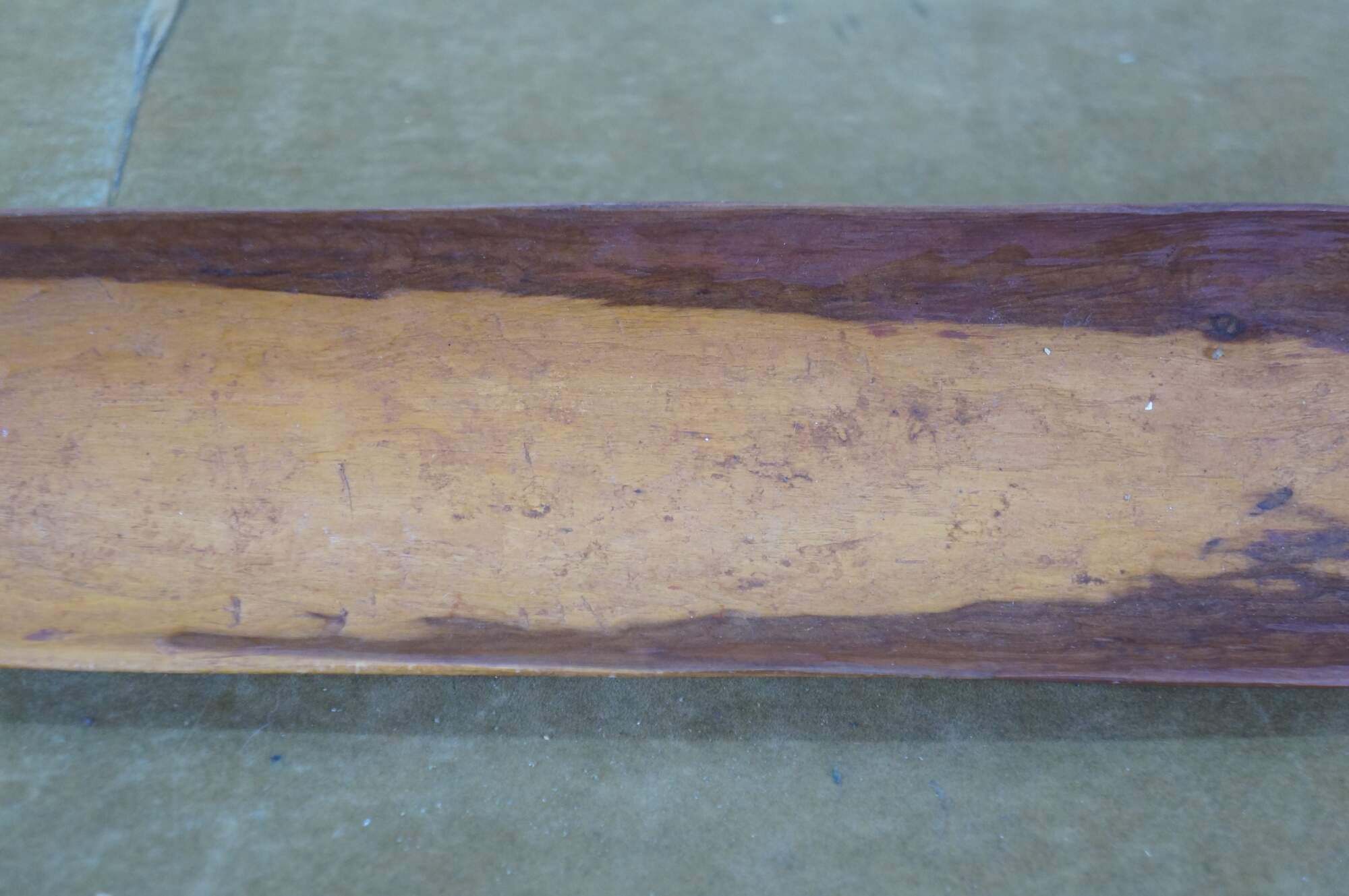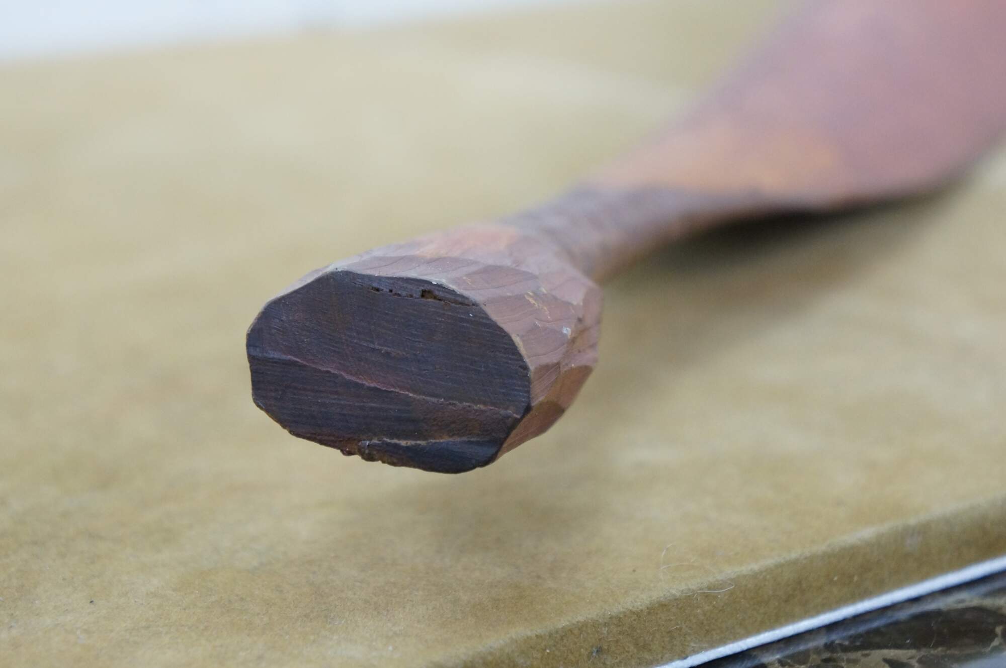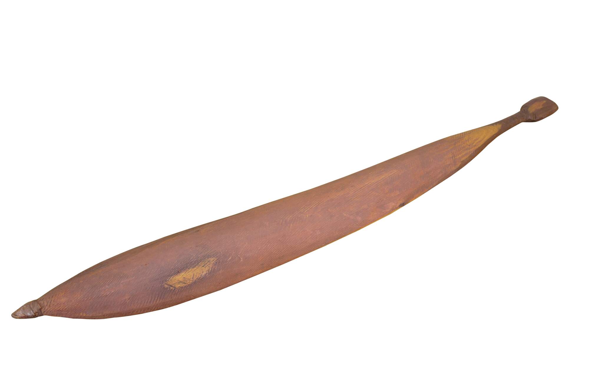 Vintage 20th century Australian aboriginal wooden woomera or hunting spear. Leaf shaped throwing spear hand carved in two toned wood.