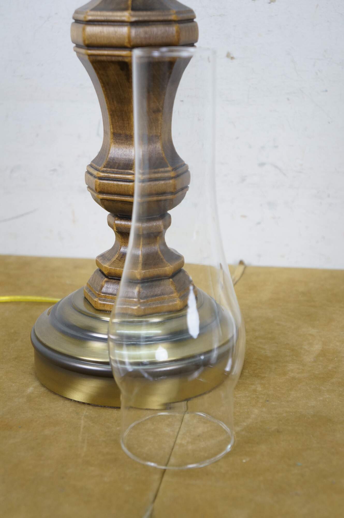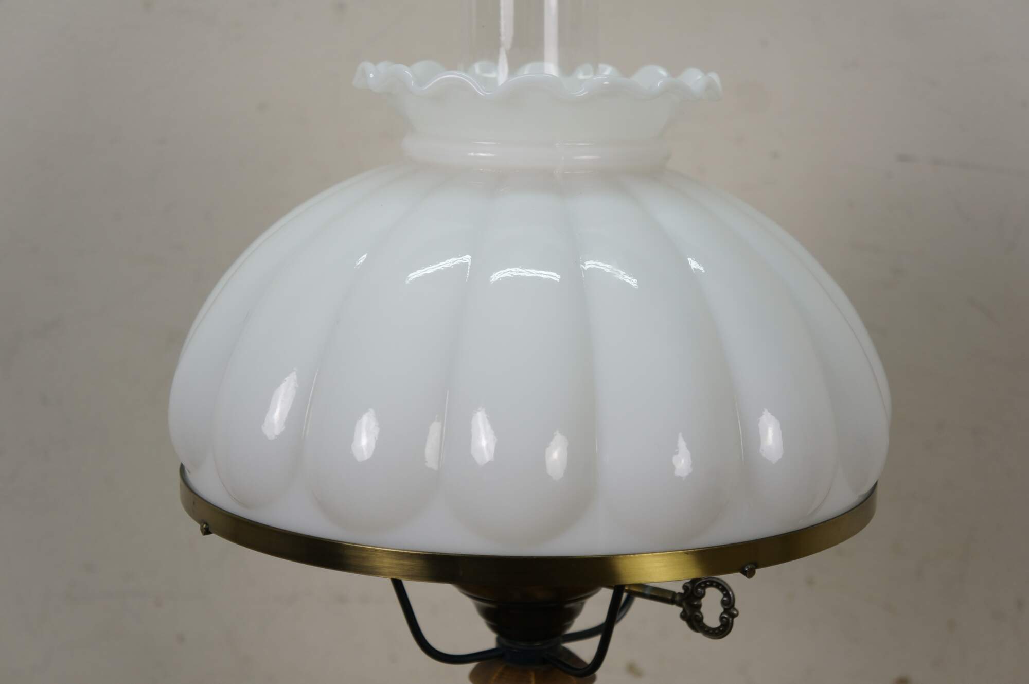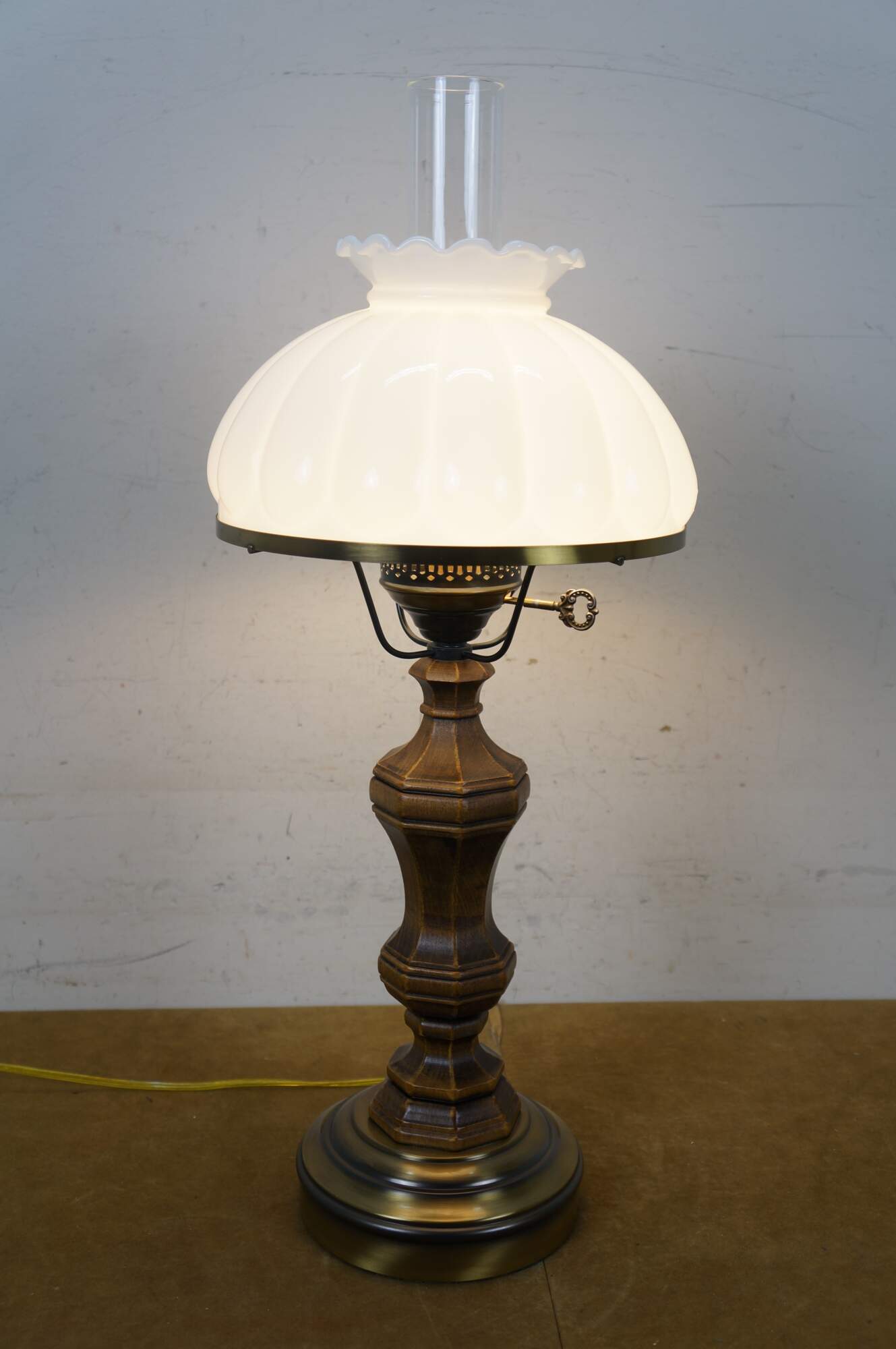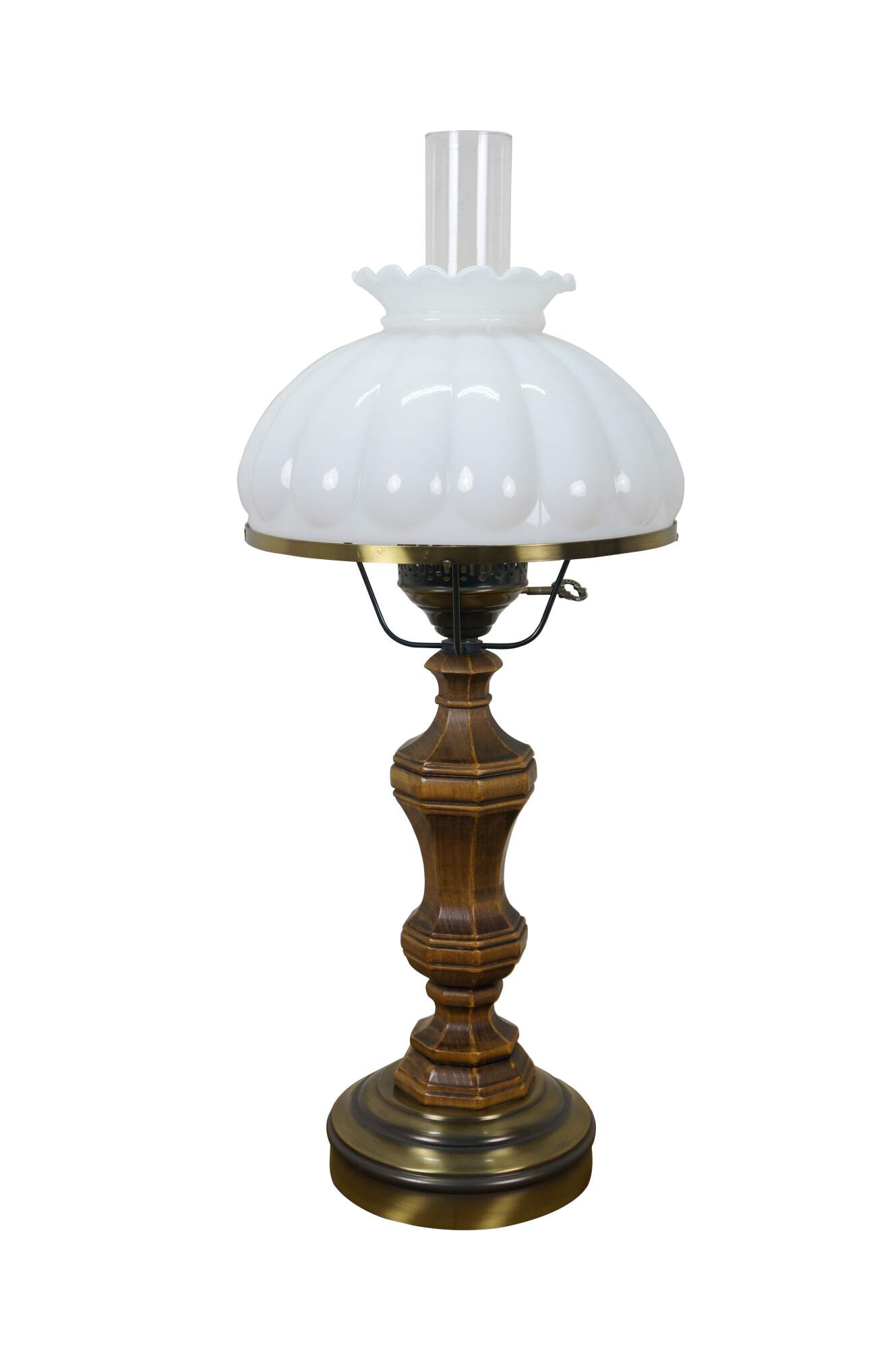 Late 20th century table lamp in the style of an old converted oil lamp. Faux wood grain resin body with round brass base and oil burner styled top supporting a clear glass hurricane and lobed, ruffle top, milk glass shade. Attributed to Pee Gee Lamps / Philip J. Greenspan Inc.