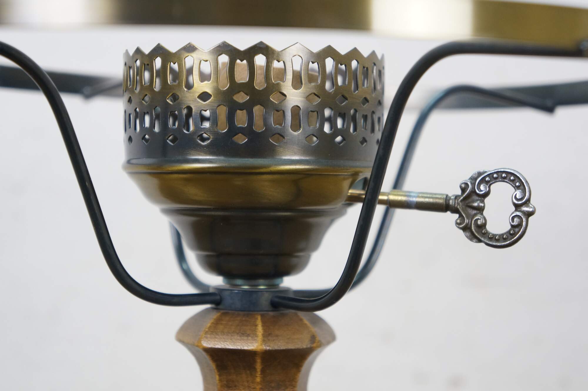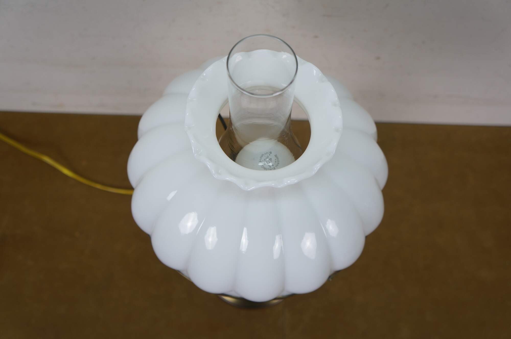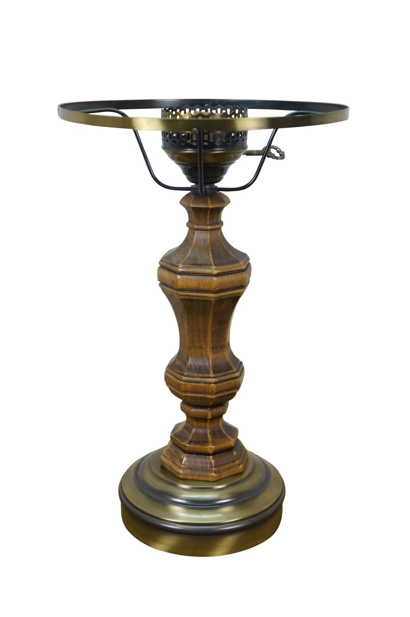 Late 20th century table lamp in the style of an old converted oil lamp. Faux wood grain resin body with round brass base and oil burner styled top supporting a clear glass hurricane and lobed, ruffle top, milk glass shade. Attributed to Pee Gee Lamps / Philip J. Greenspan Inc.