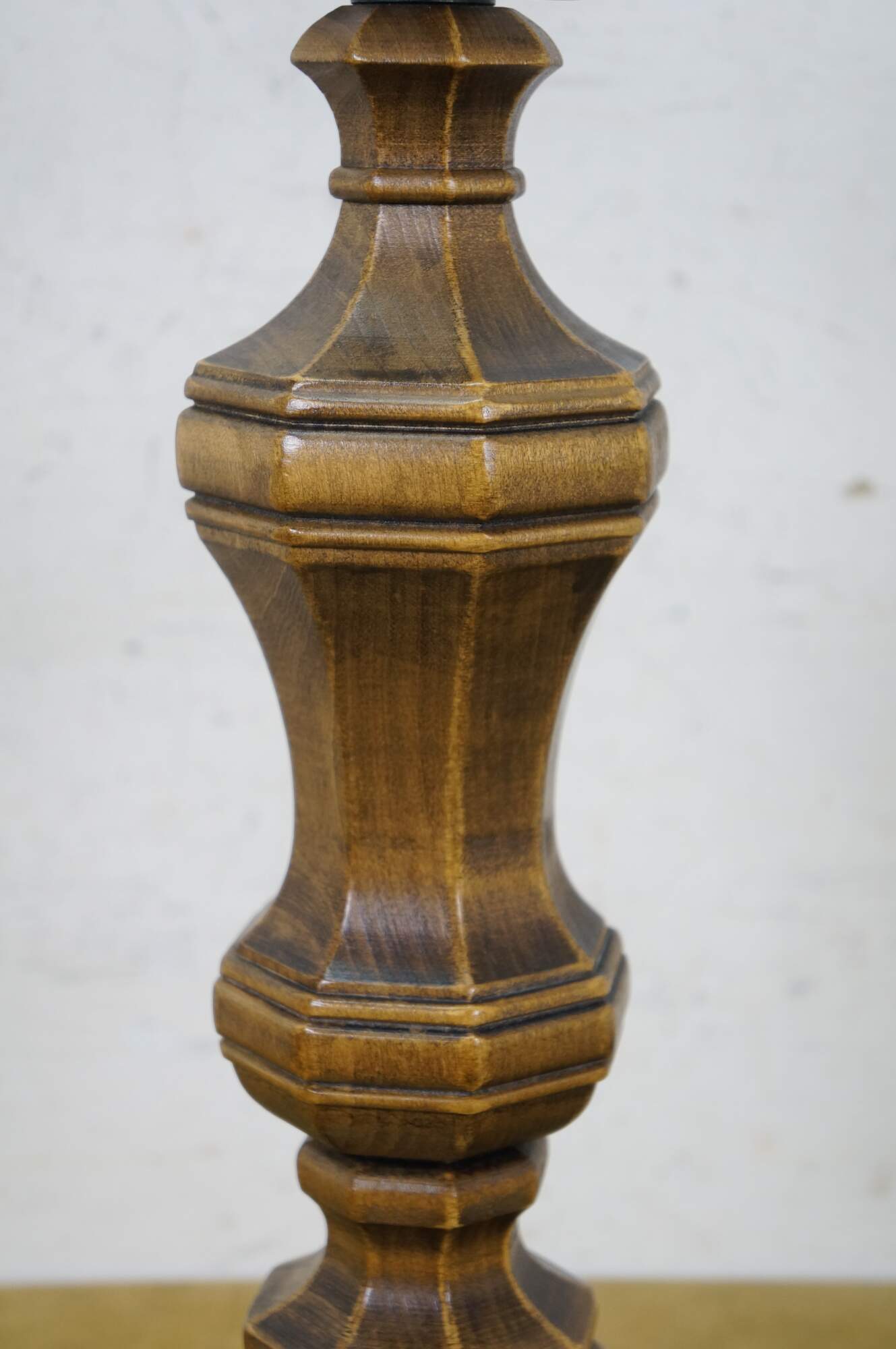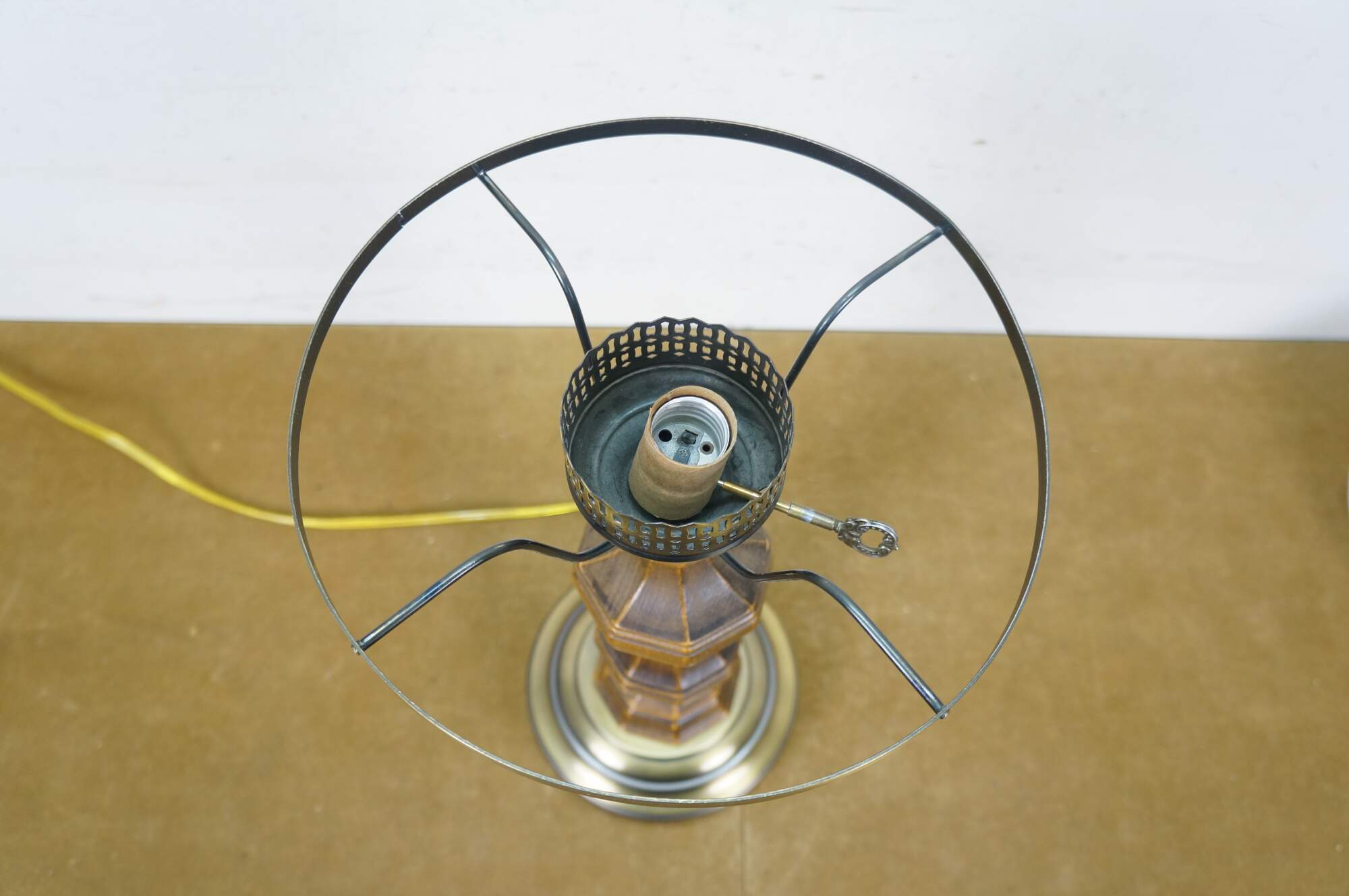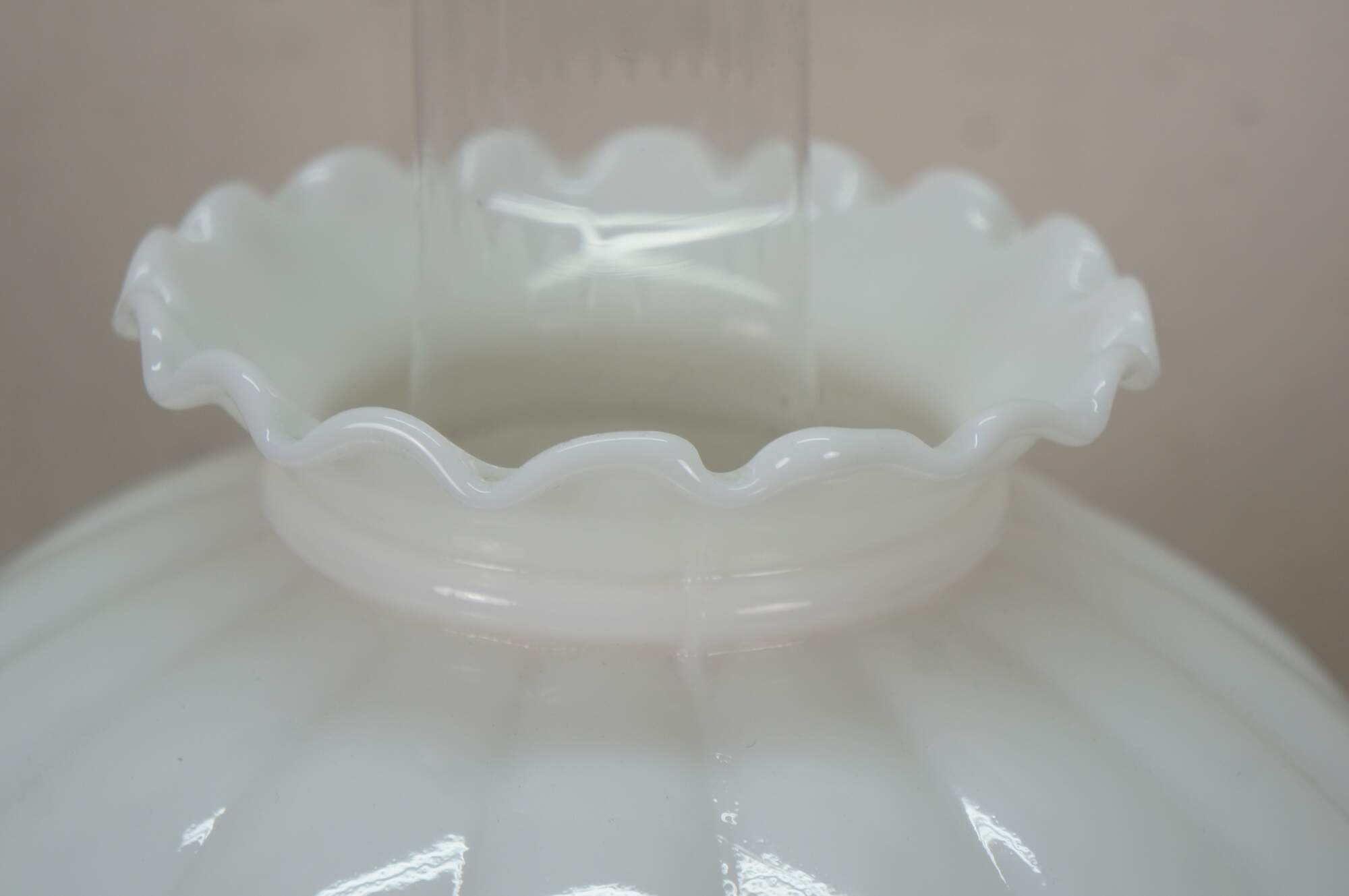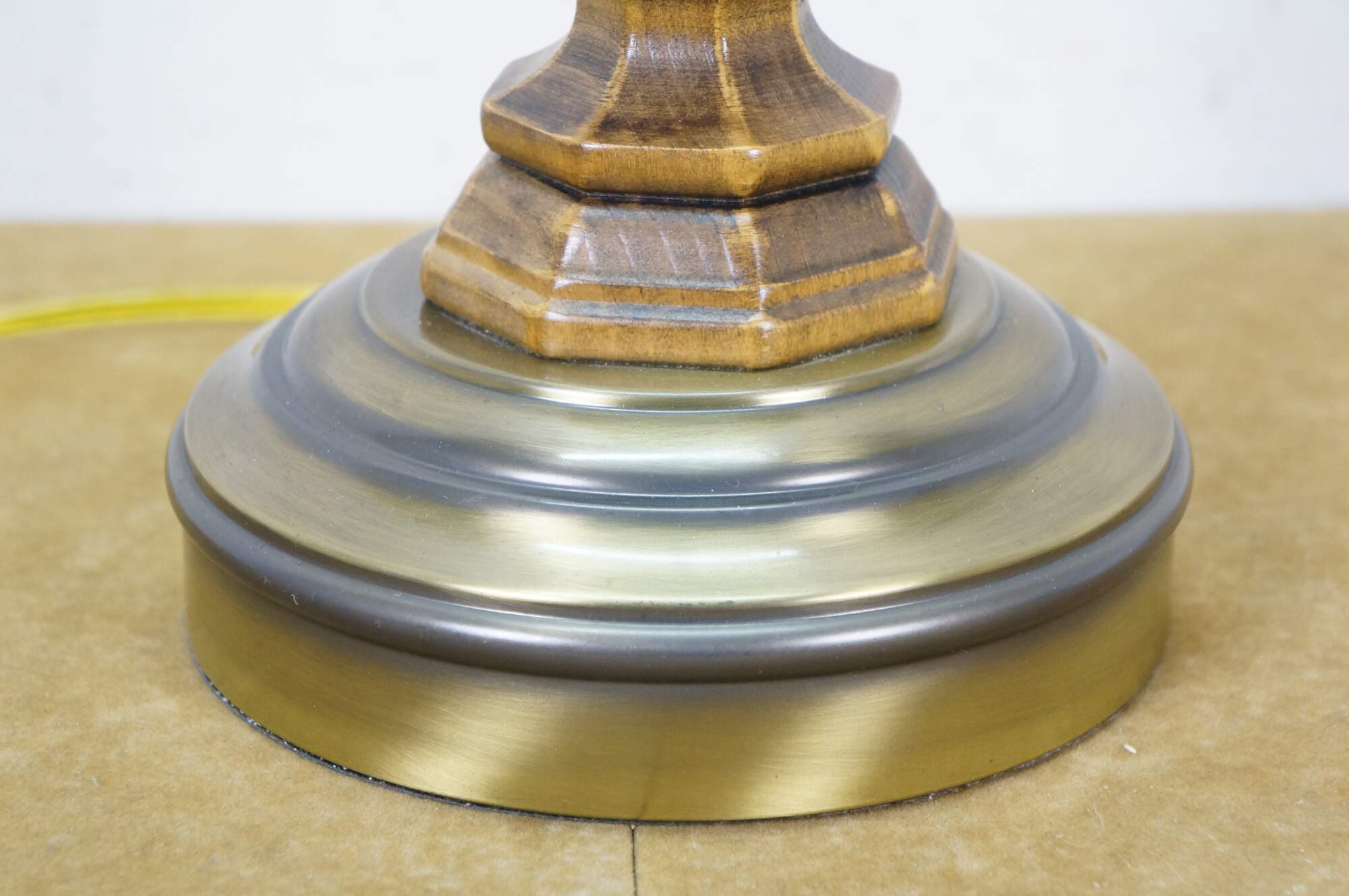 Late 20th century table lamp in the style of an old converted oil lamp. Faux wood grain resin body with round brass base and oil burner styled top supporting a clear glass hurricane and lobed, ruffle top, milk glass shade. Attributed to Pee Gee Lamps / Philip J. Greenspan Inc.