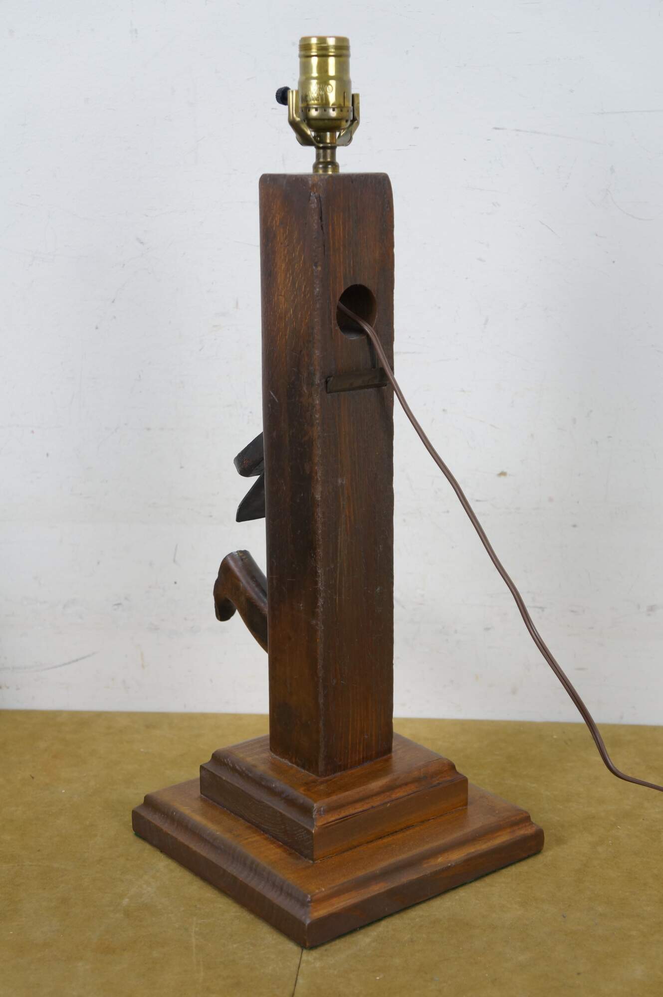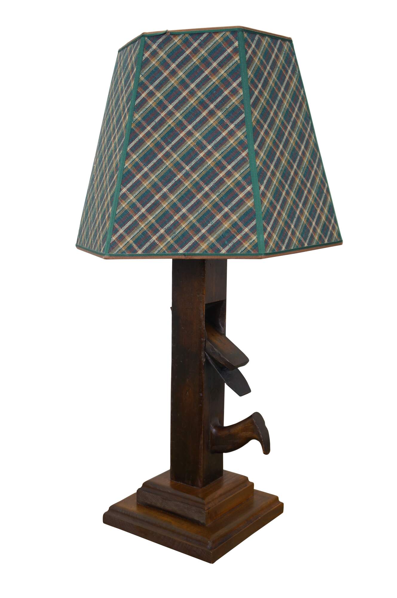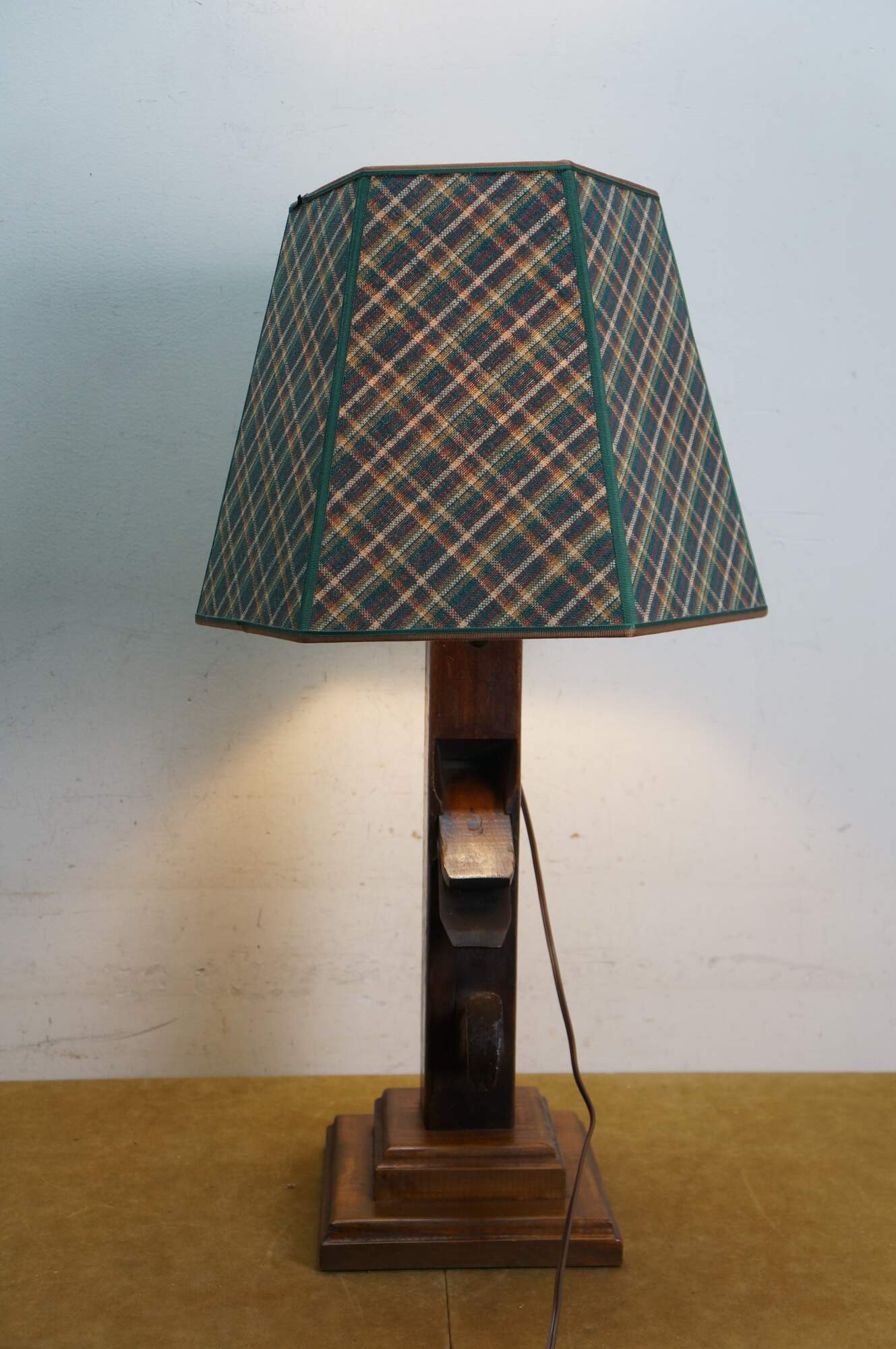 Early 20th century rustic wooden woodworking plane made into a lamp. The planer is from The Chapin Stephens Company, and at some point in time was repurposed into a table lamp with tiered square base. Includes harp, brass finial, and green, red, and gold plaid fabric shade. Chaplin Stephens, Pine Meadow Connecticut Union Factory.
