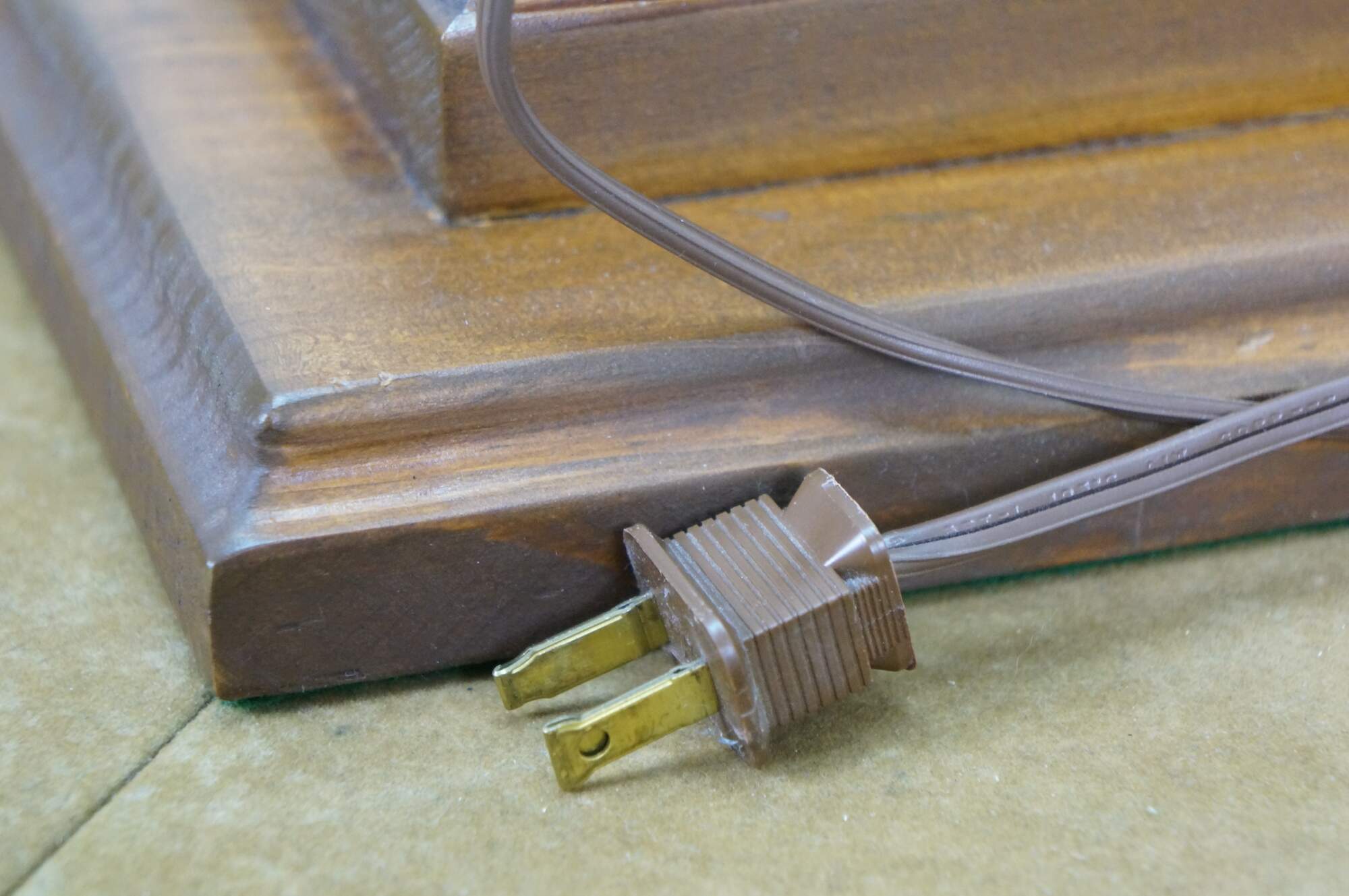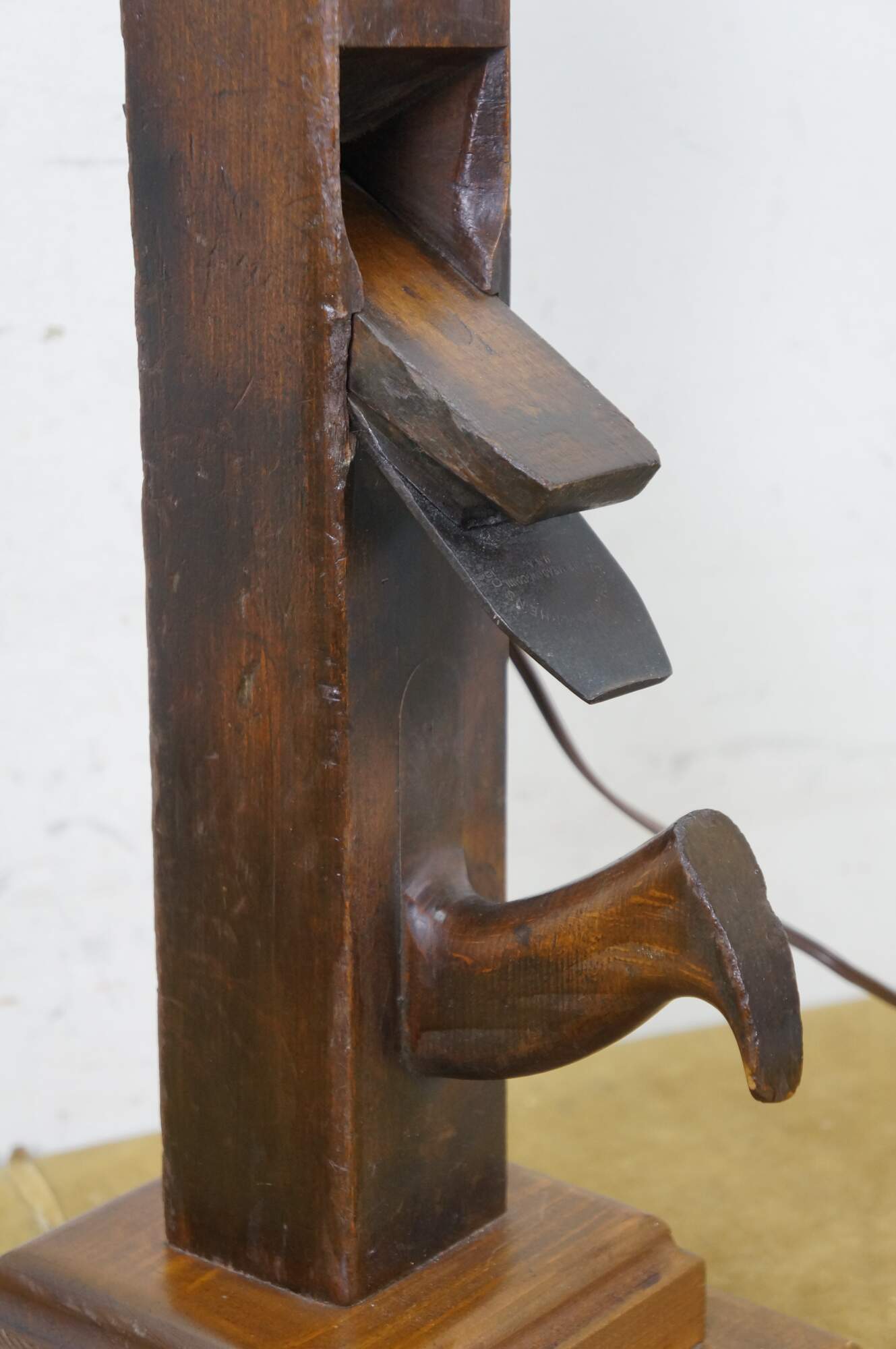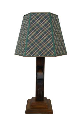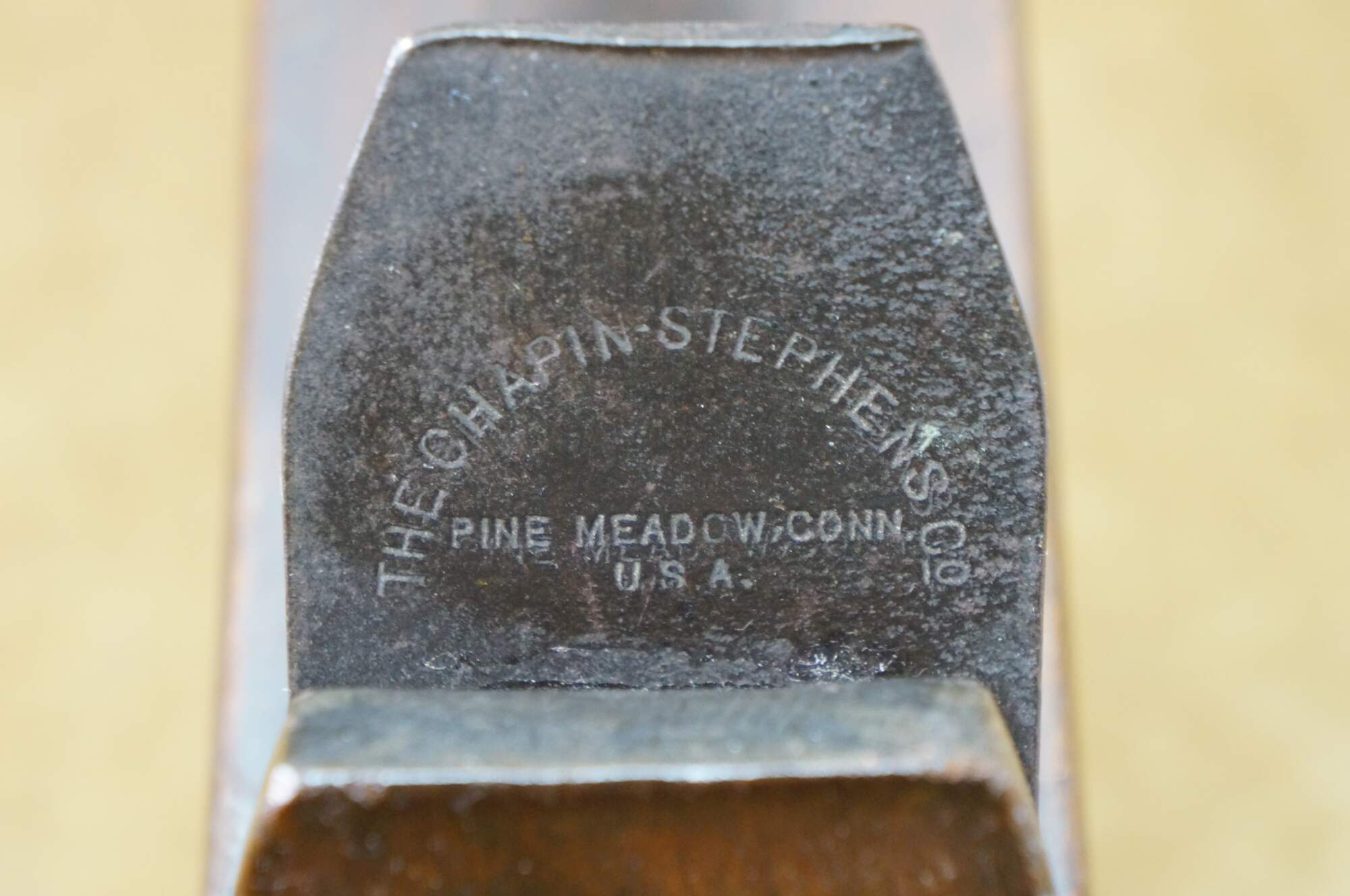 Early 20th century rustic wooden woodworking plane made into a lamp. The planer is from The Chapin Stephens Company, and at some point in time was repurposed into a table lamp with tiered square base. Includes harp, brass finial, and green, red, and gold plaid fabric shade. Chaplin Stephens, Pine Meadow Connecticut Union Factory.
