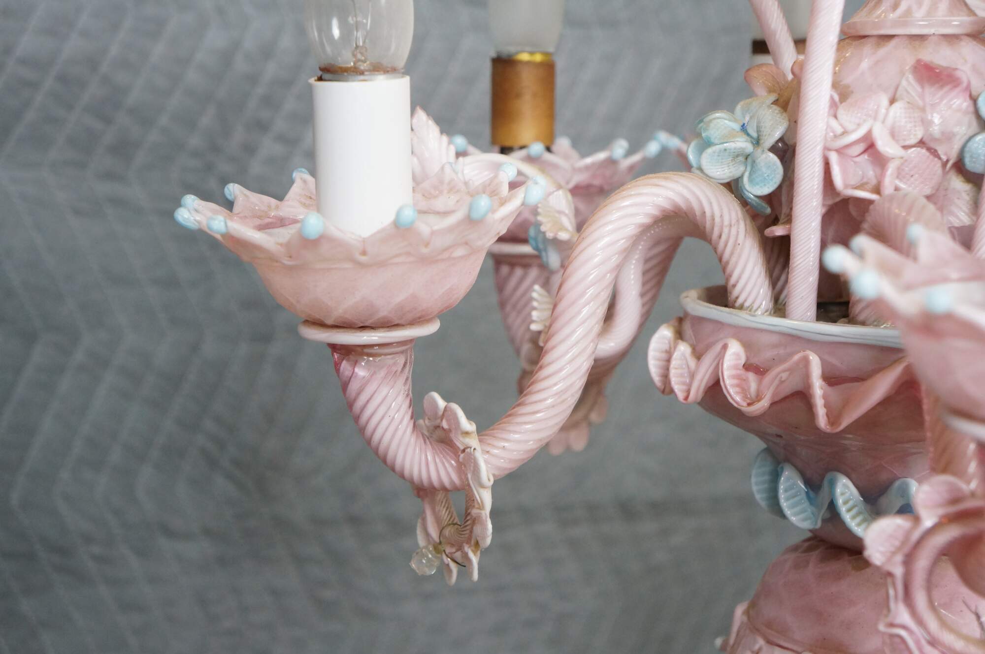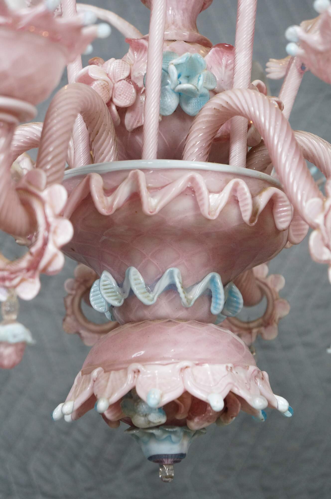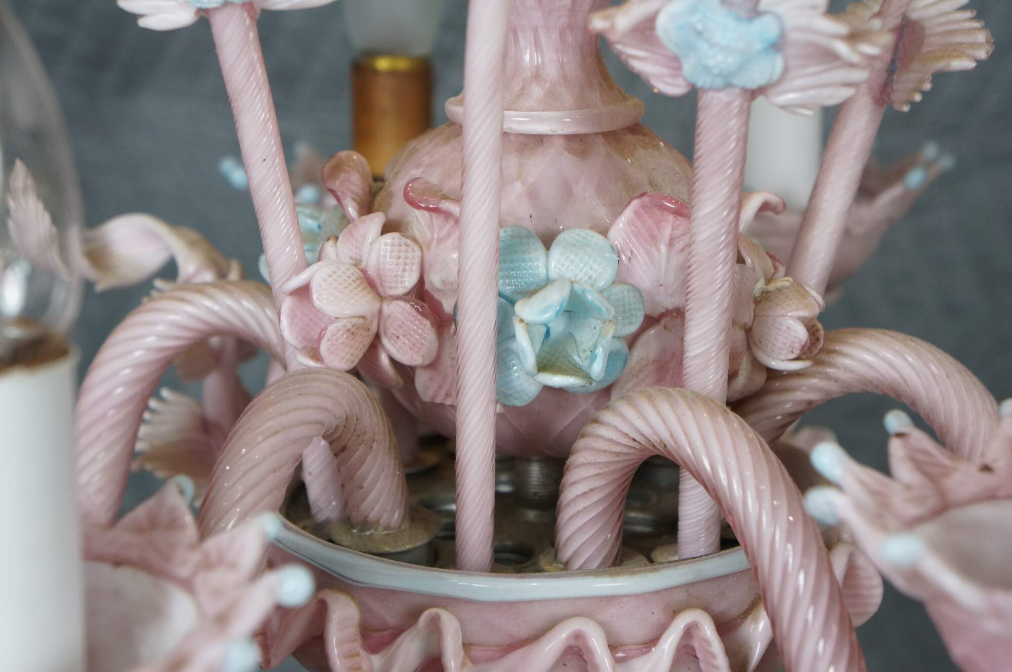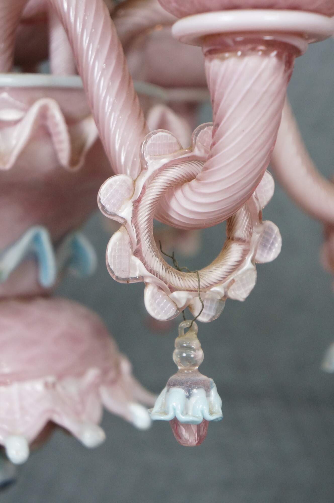 Beautiful and intricate hand blown vintage pink Venetian art glass chandelier. Six twisted arms with faux candlesticks and dangling ring shaped charms, alternating with stems of leaves and pink and blue flowers. Lattice textured body with Hollywood Regency styling. Pink with pale blue accents. Hardwired.