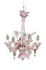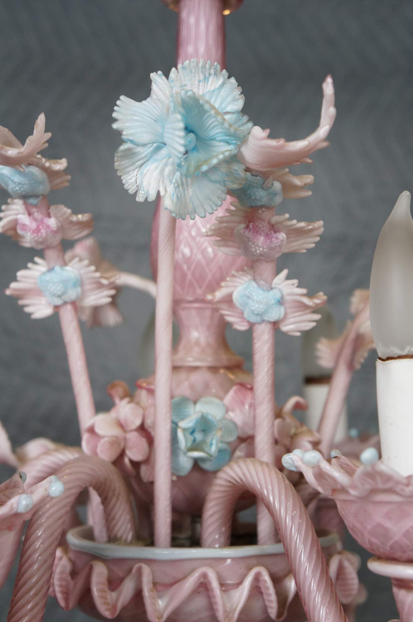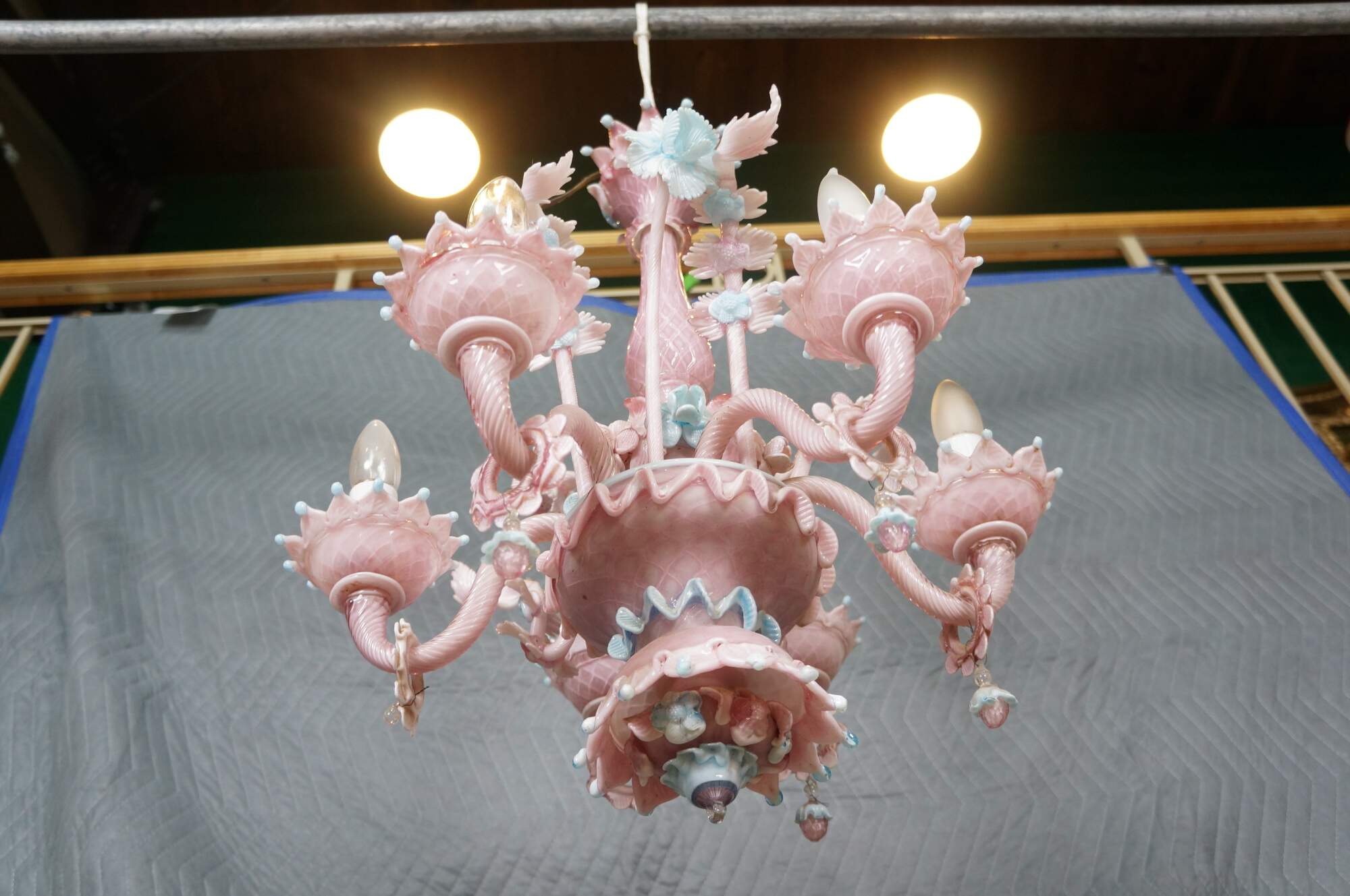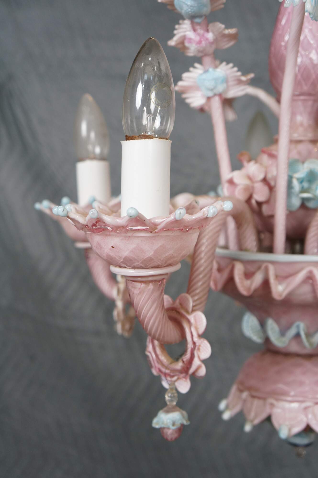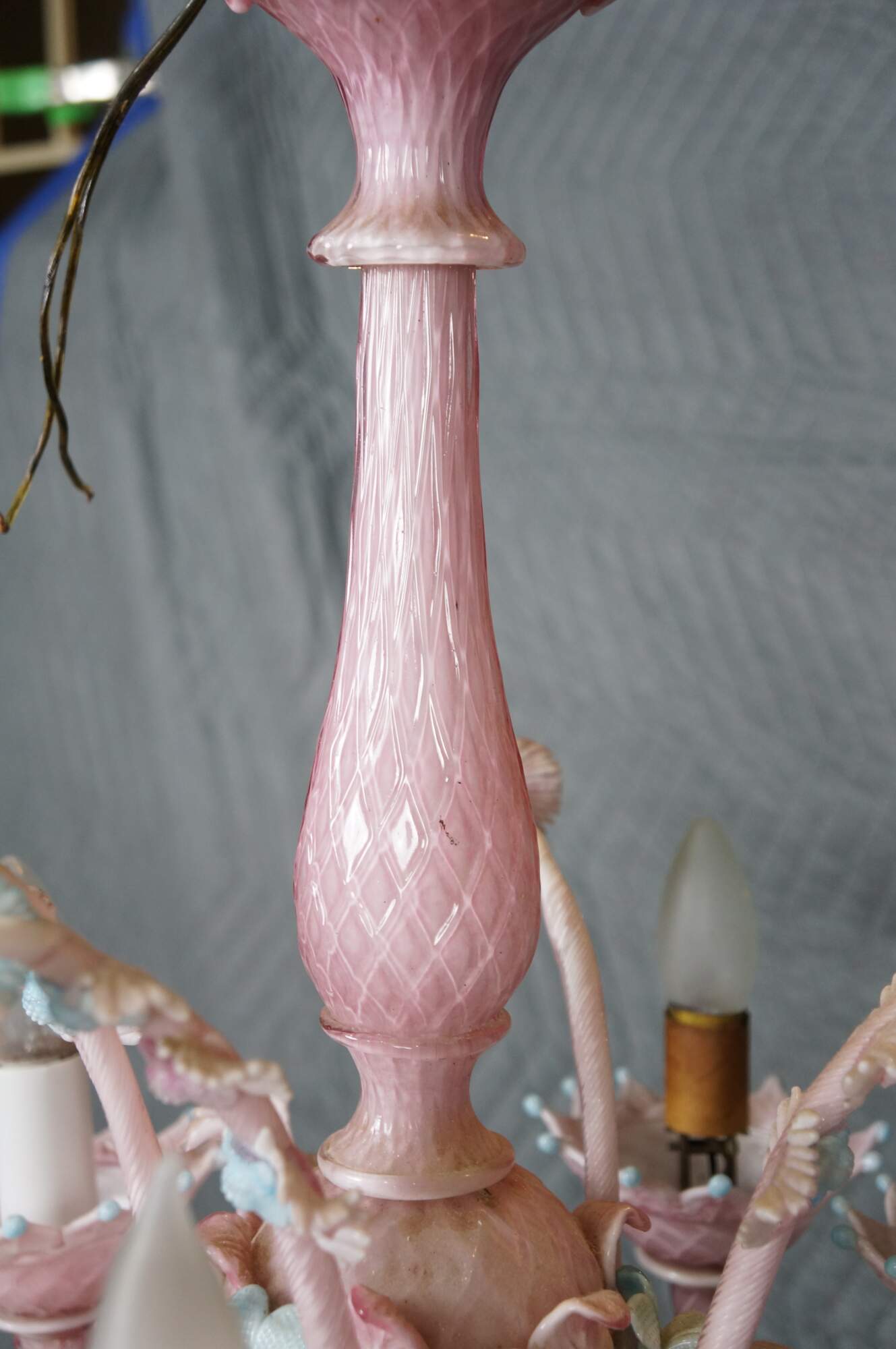 Beautiful and intricate hand blown vintage pink Venetian art glass chandelier. Six twisted arms with faux candlesticks and dangling ring shaped charms, alternating with stems of leaves and pink and blue flowers. Lattice textured body with Hollywood Regency styling. Pink with pale blue accents. Hardwired.