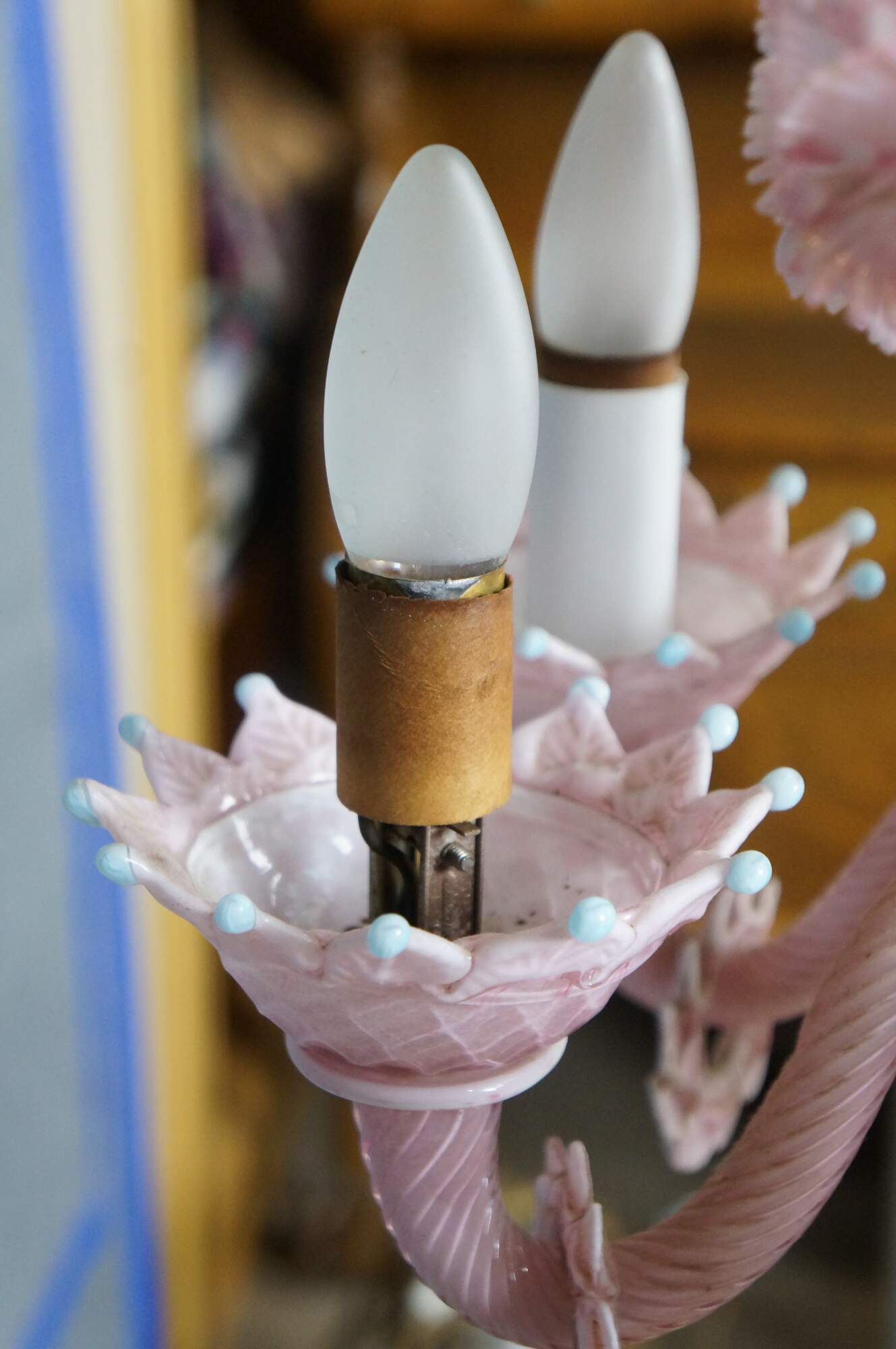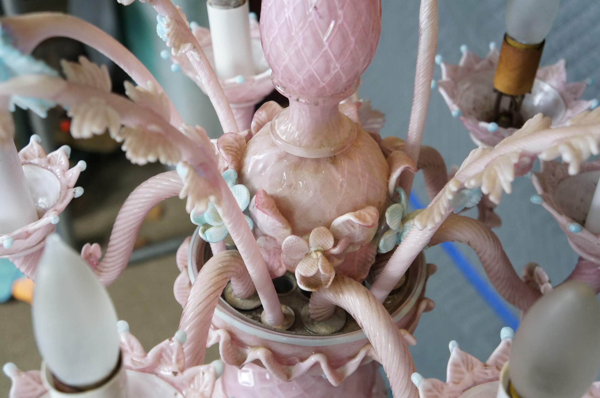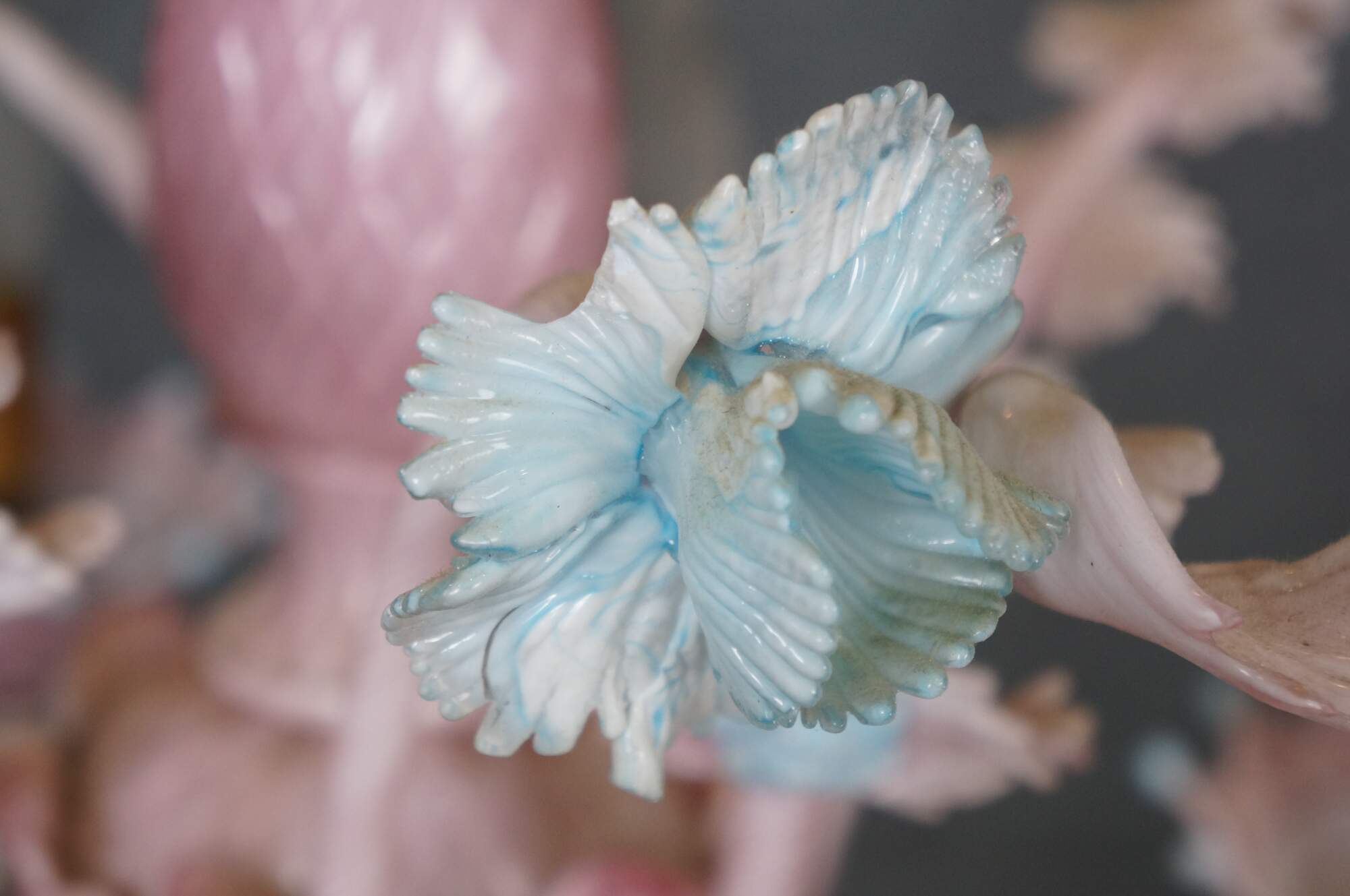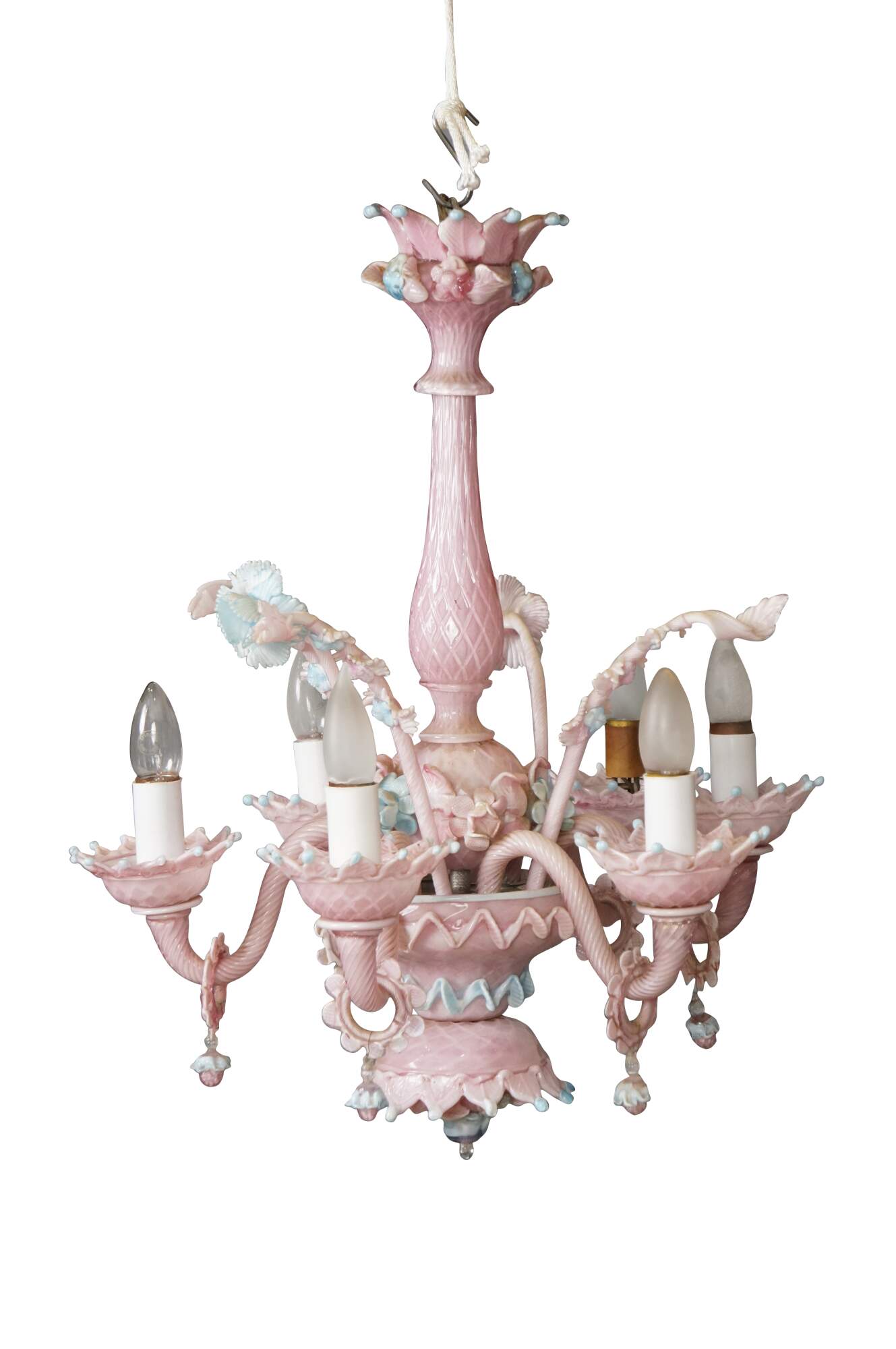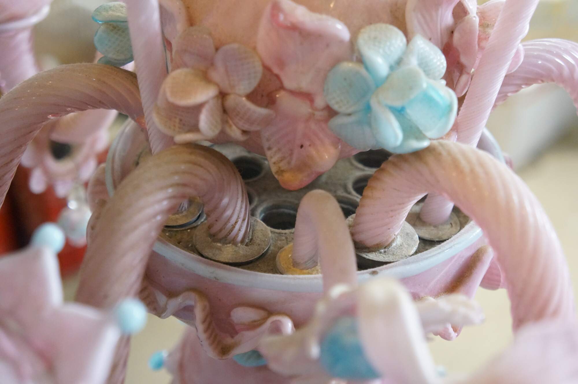 Beautiful and intricate hand blown vintage pink Venetian art glass chandelier. Six twisted arms with faux candlesticks and dangling ring shaped charms, alternating with stems of leaves and pink and blue flowers. Lattice textured body with Hollywood Regency styling. Pink with pale blue accents. Hardwired.