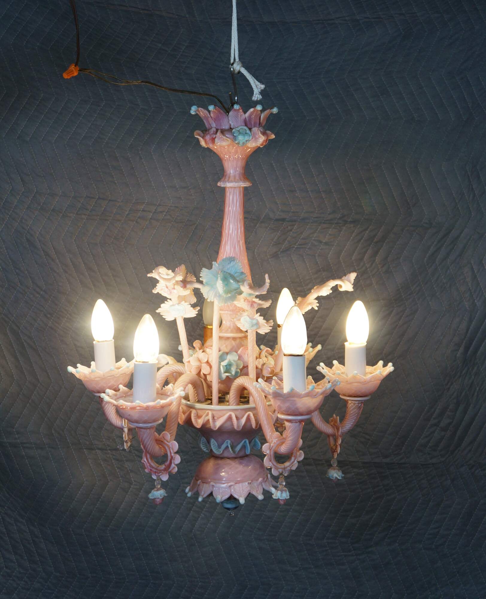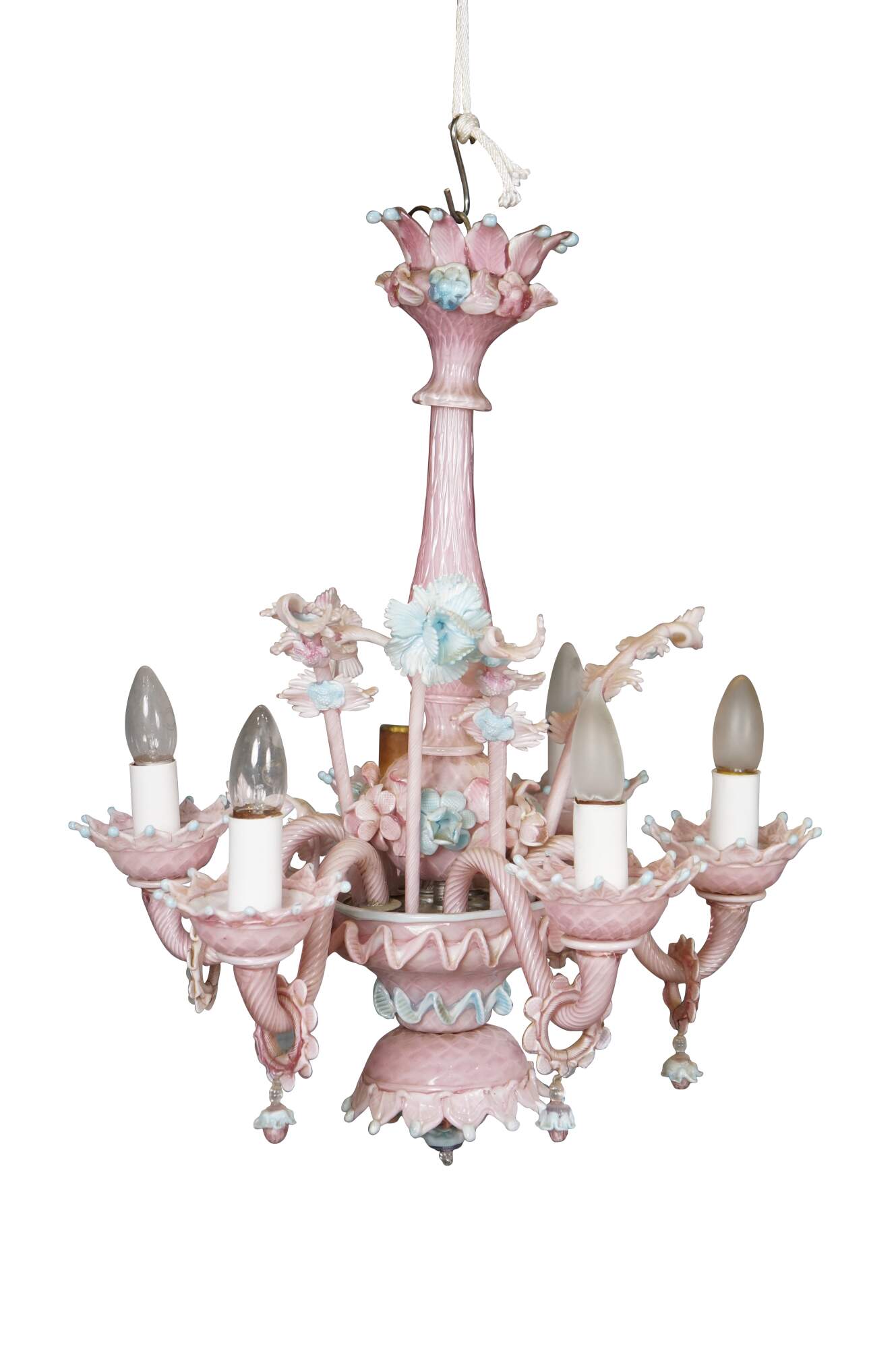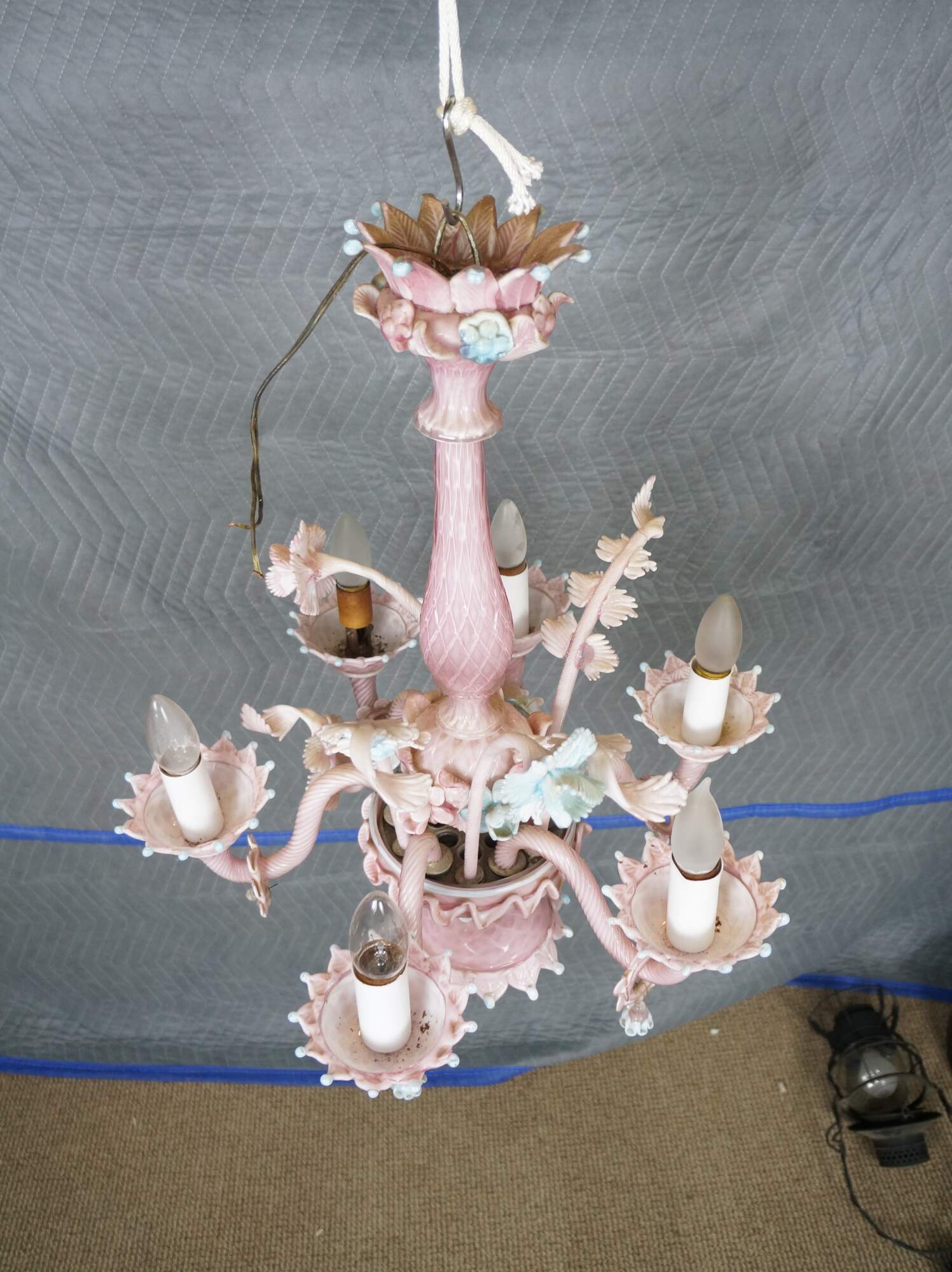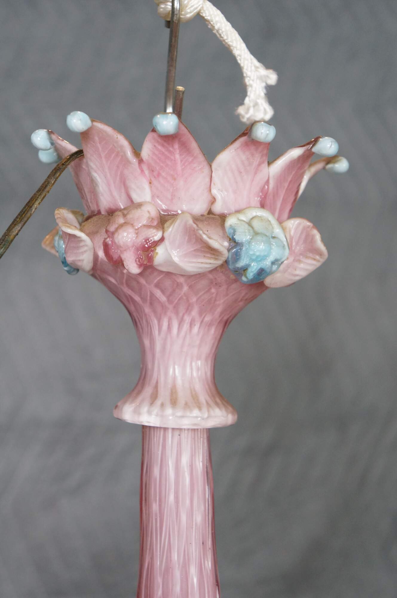Beautiful and intricate hand blown vintage pink Venetian art glass chandelier. Six twisted arms with faux candlesticks and dangling ring shaped charms, alternating with stems of leaves and pink and blue flowers. Lattice textured body with Hollywood Regency styling. Pink with pale blue accents. Hardwired.