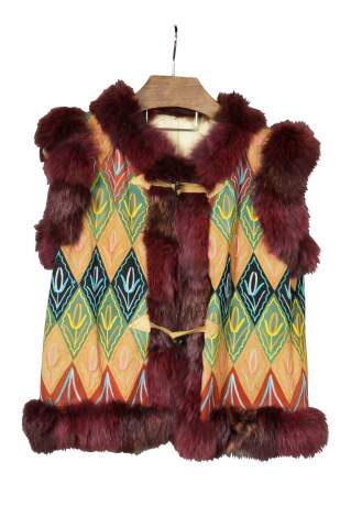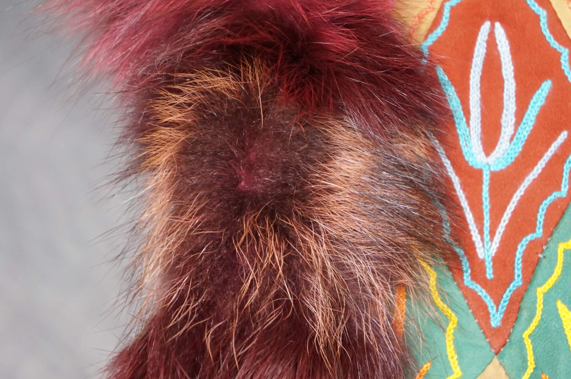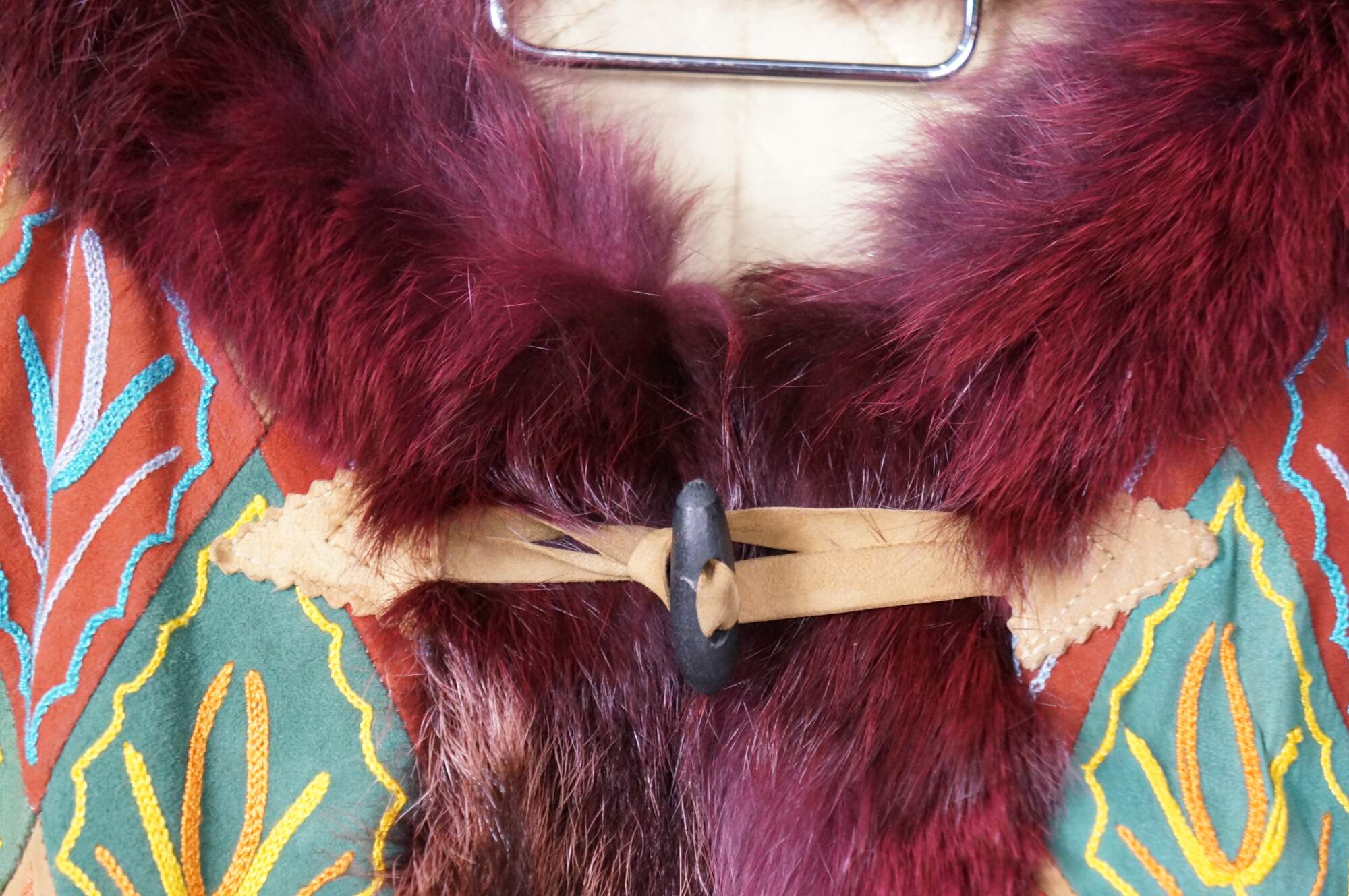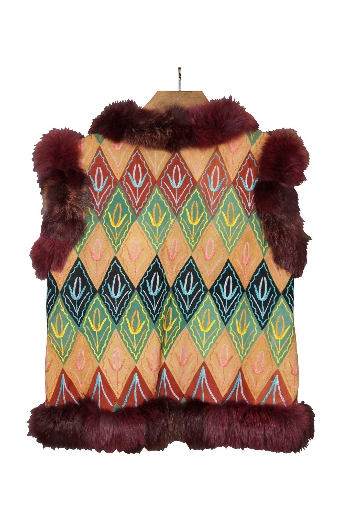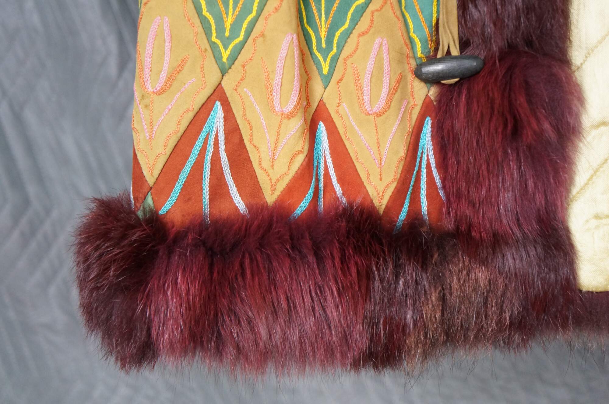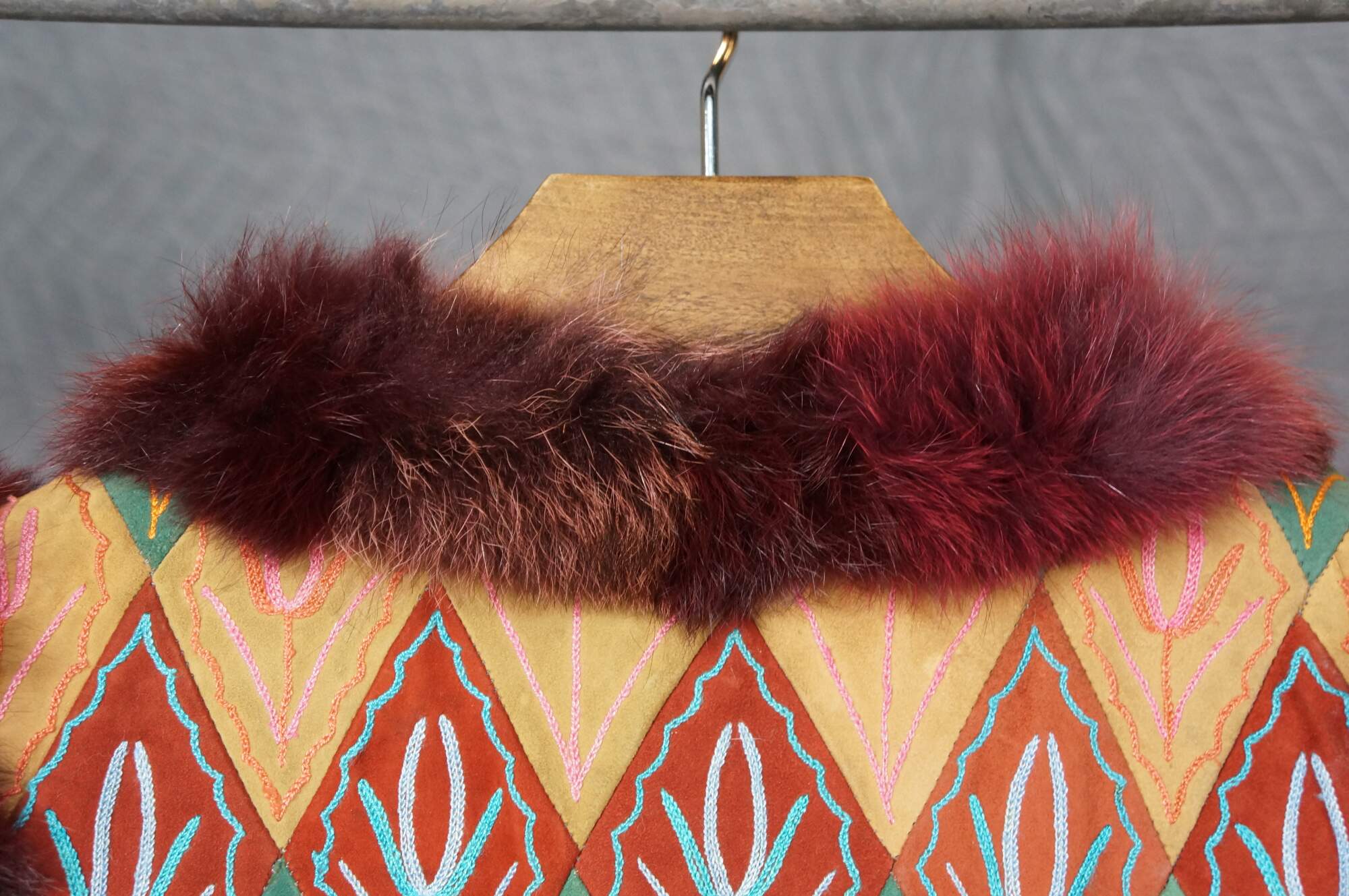 Mid to late 20th century suede and fur vest. Diamond patchwork multicolor suede leather, embroidered with flowers, trimmed with soft burgundy dyed fur. Leather toggle closure. Quilted off white lining. One interior chest pocket.