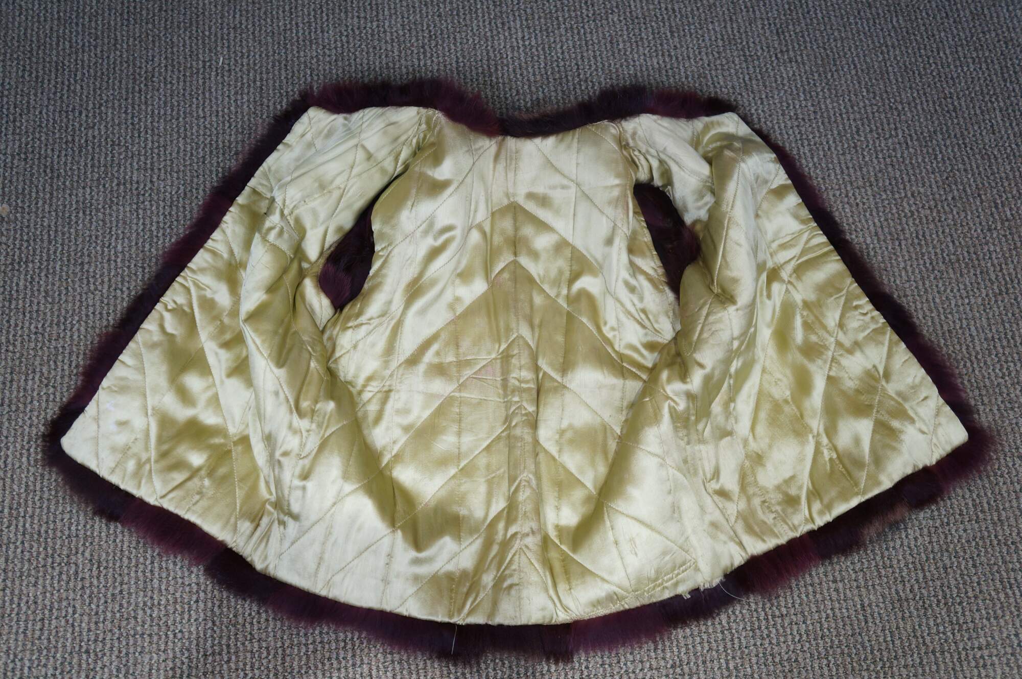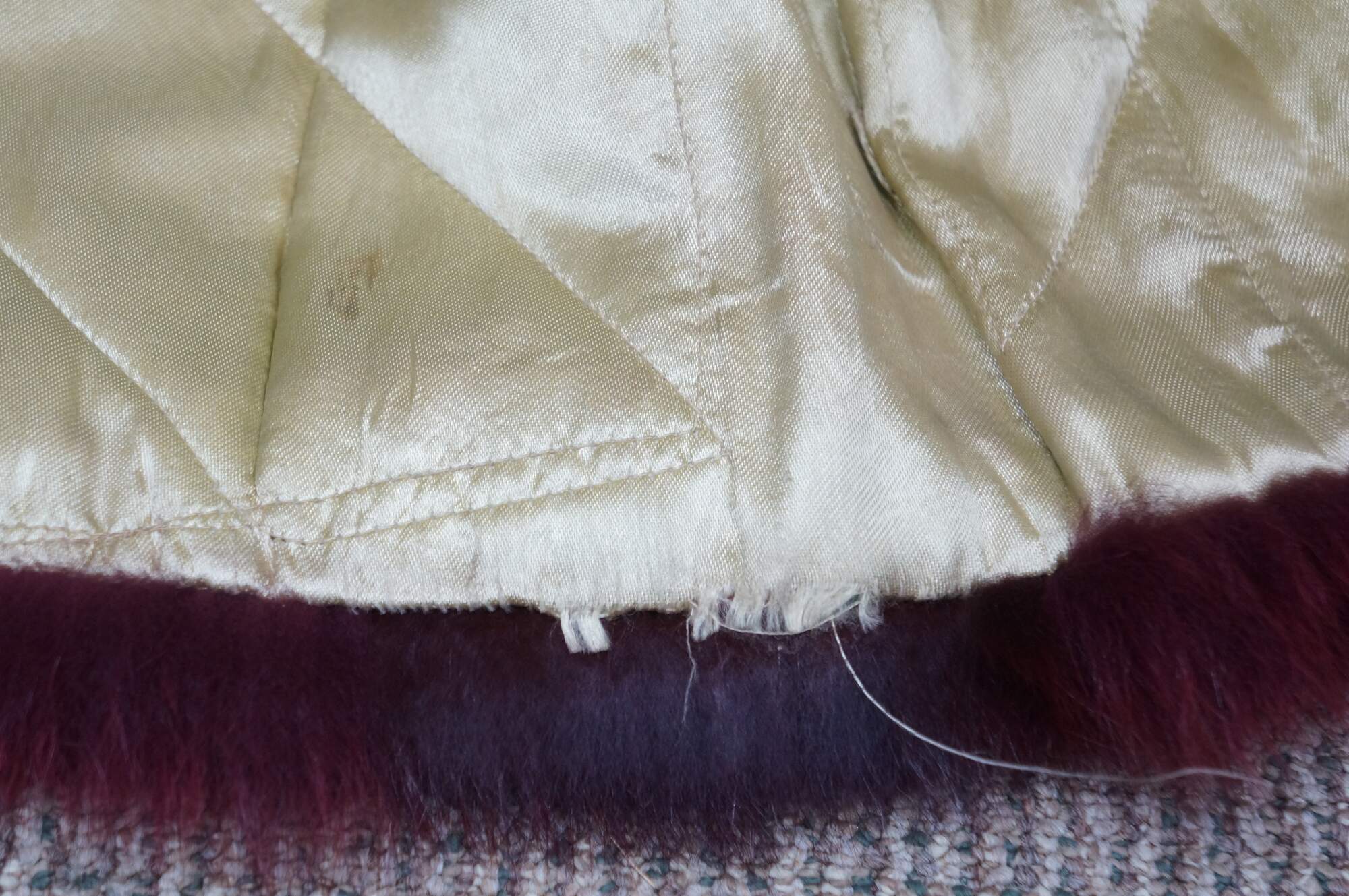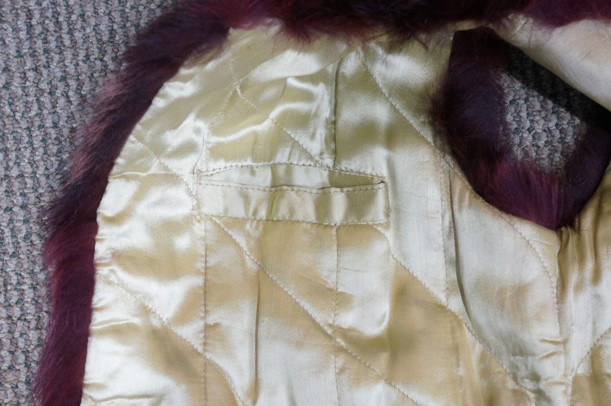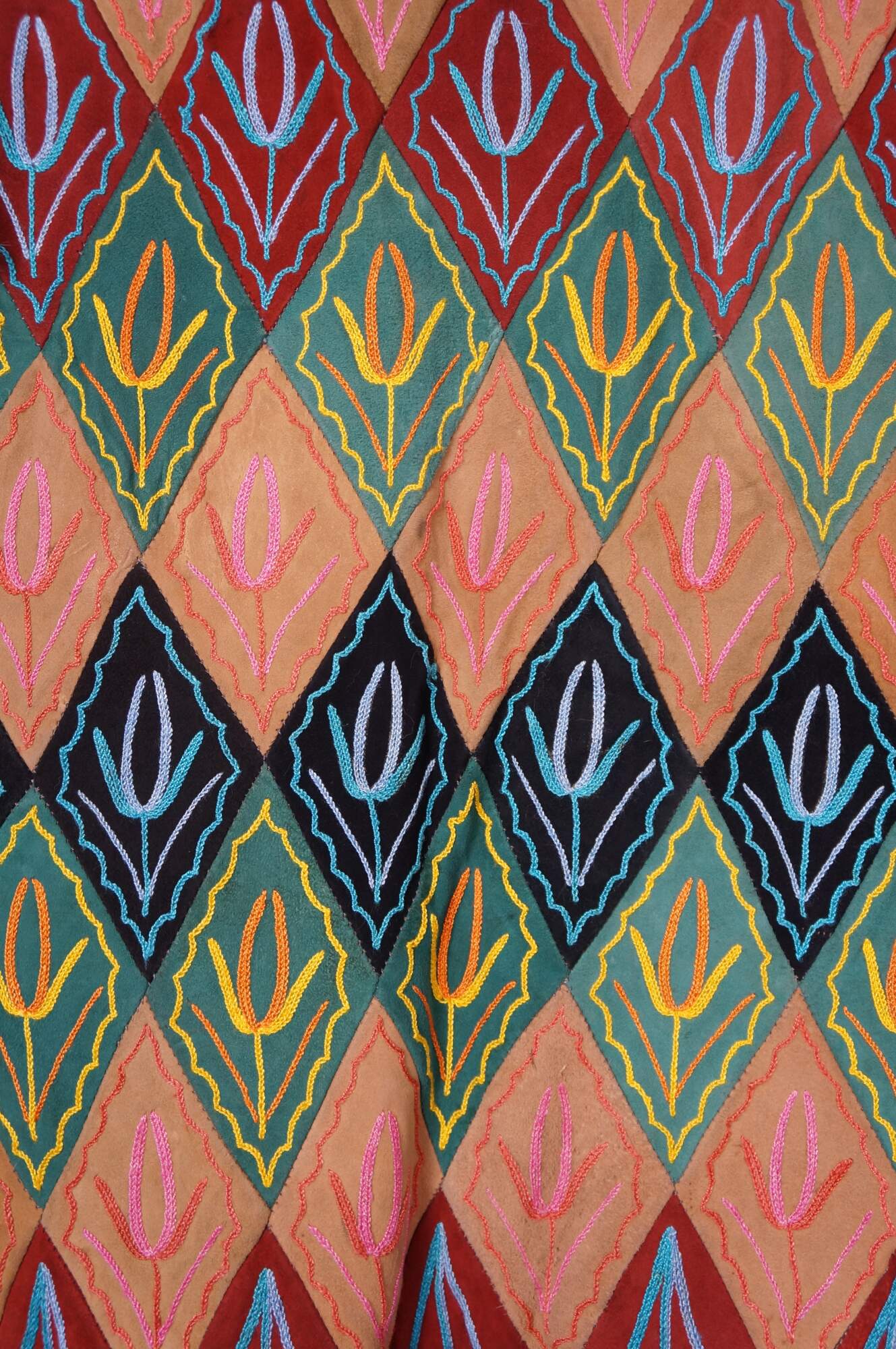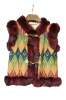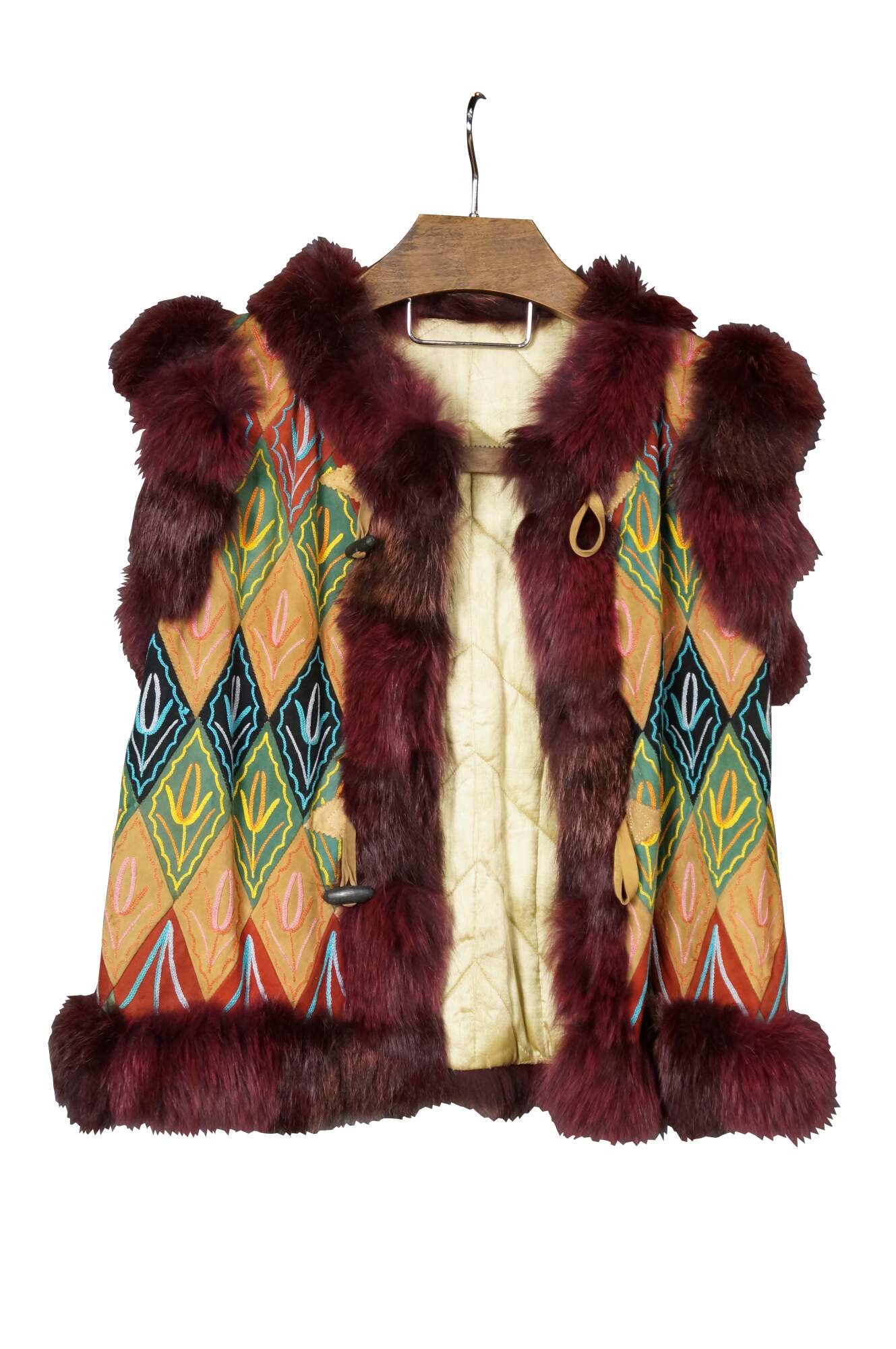 Mid to late 20th century suede and fur vest. Diamond patchwork multicolor suede leather, embroidered with flowers, trimmed with soft burgundy dyed fur. Leather toggle closure. Quilted off white lining. One interior chest pocket.