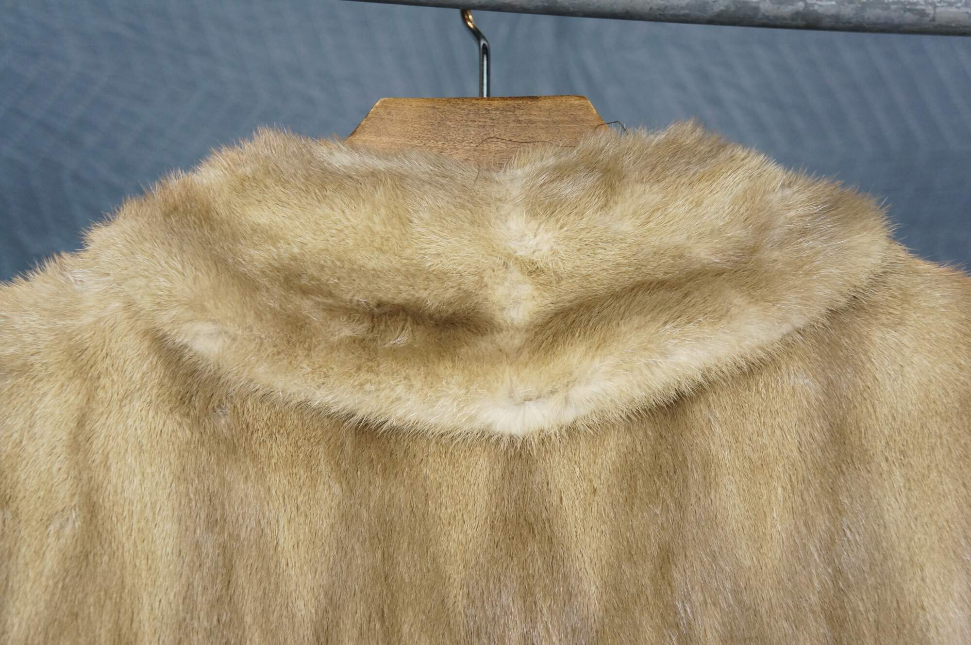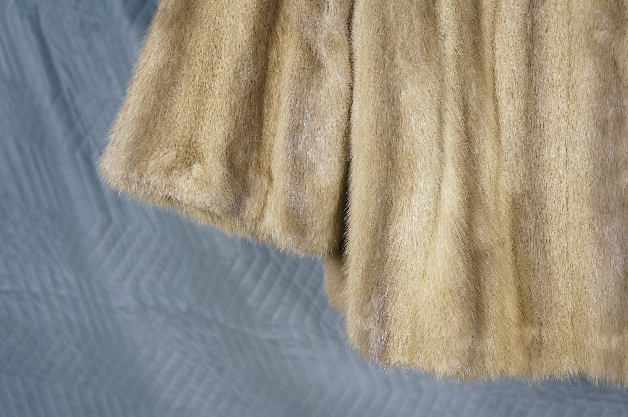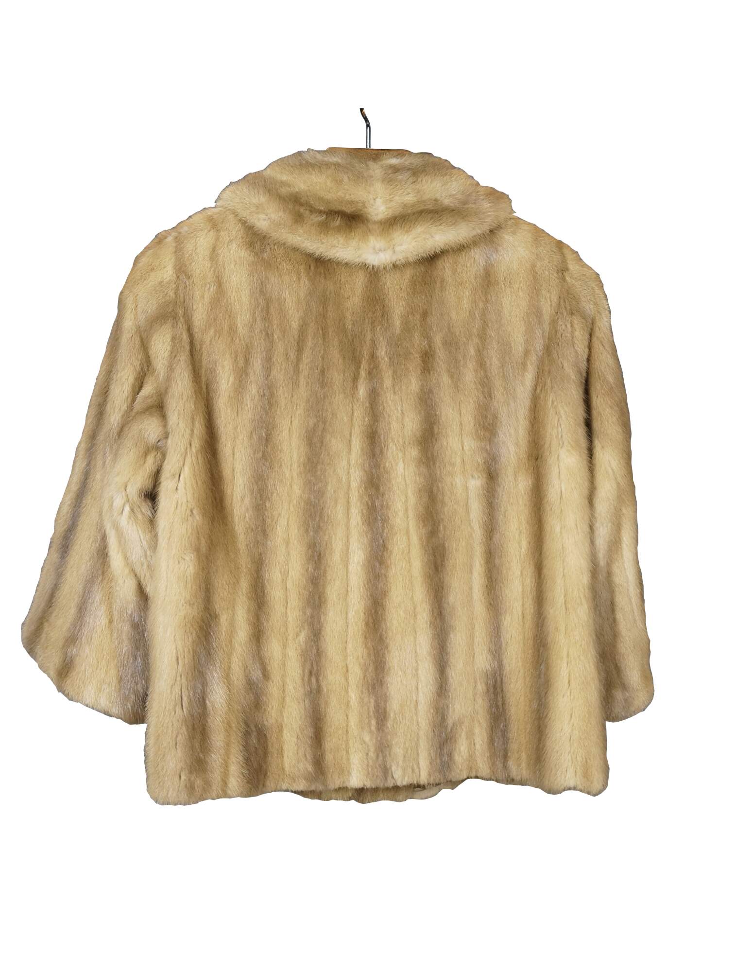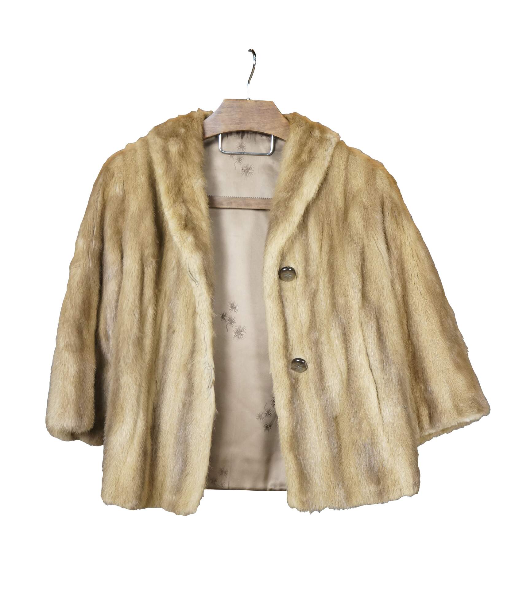 Mid to late 20th century light brown natural taxidermy mink fur jacket / coat. Short / hip length; floral plastic button closure; two exterior side pockets. Dandelion embroidered taupe lining. Lazarus - Columbus.