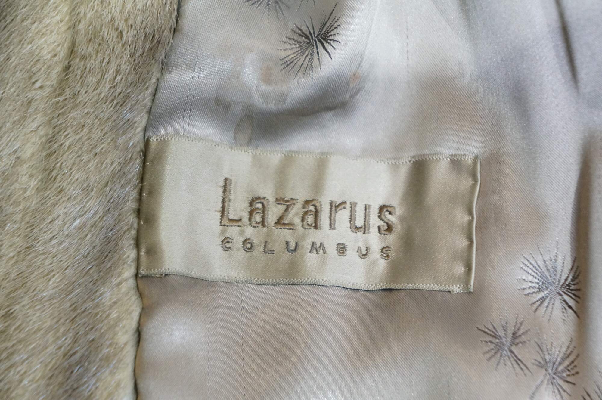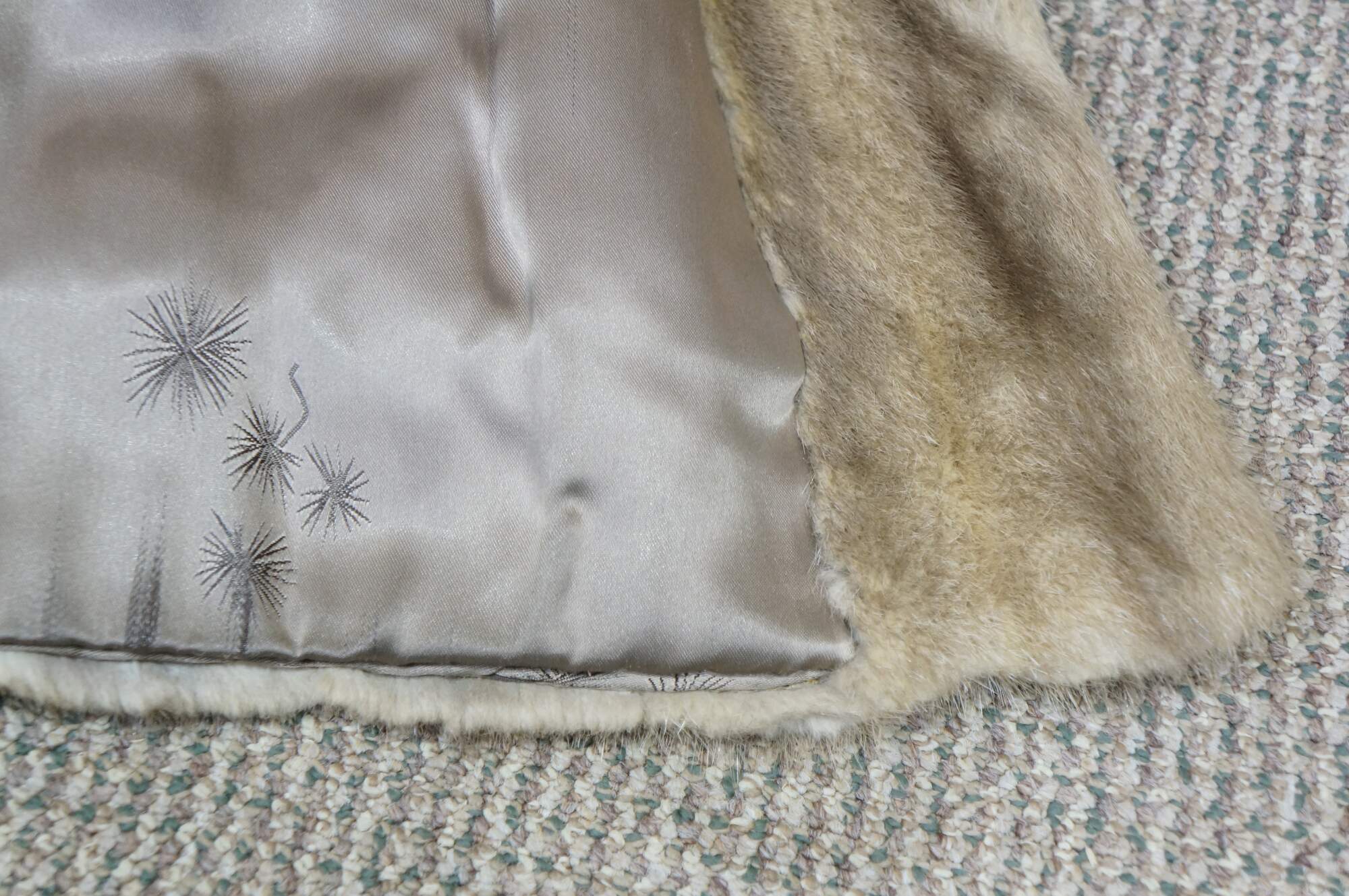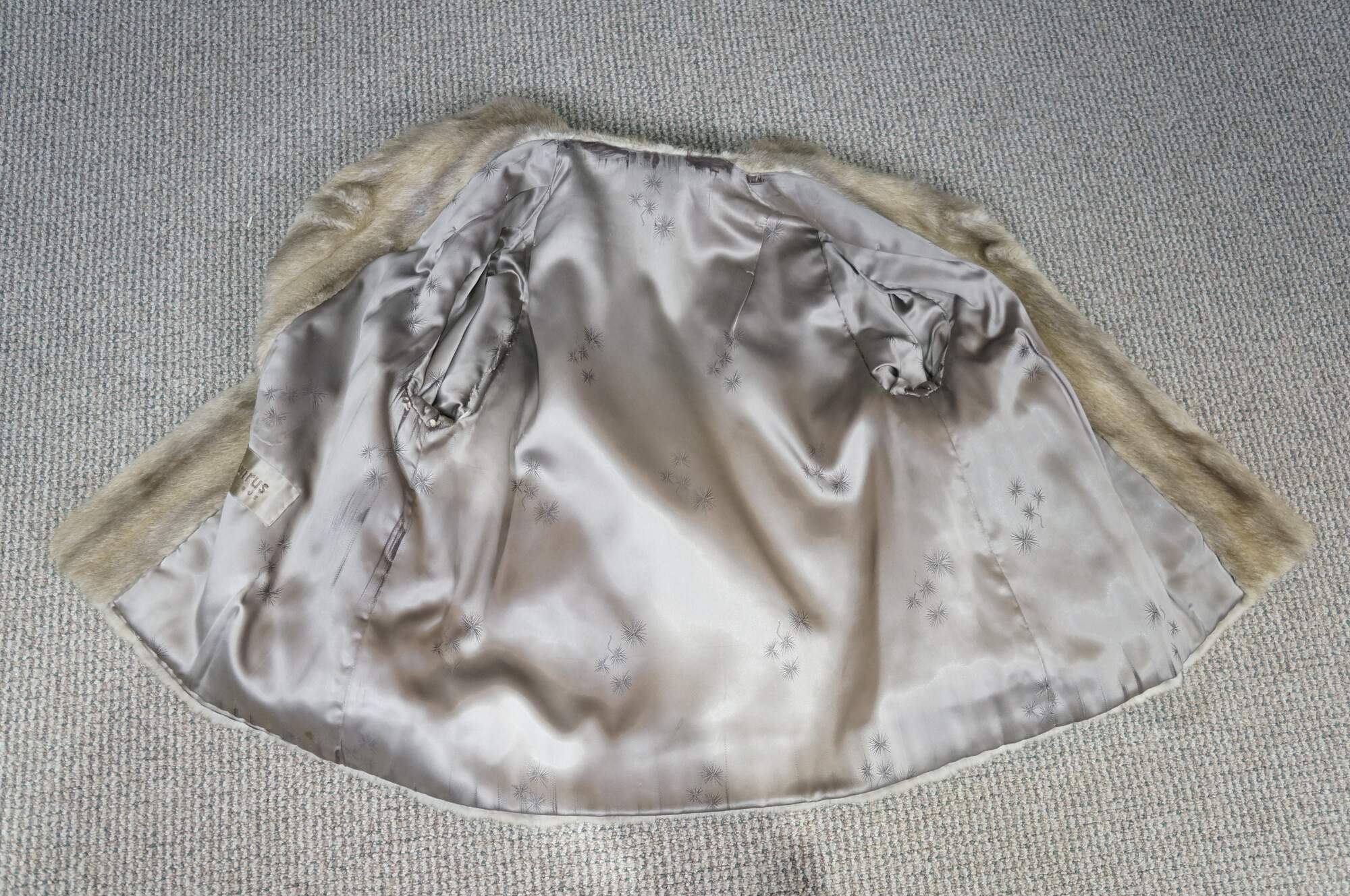 Mid to late 20th century light brown natural taxidermy mink fur jacket / coat. Short / hip length; floral plastic button closure; two exterior side pockets. Dandelion embroidered taupe lining. Lazarus - Columbus.