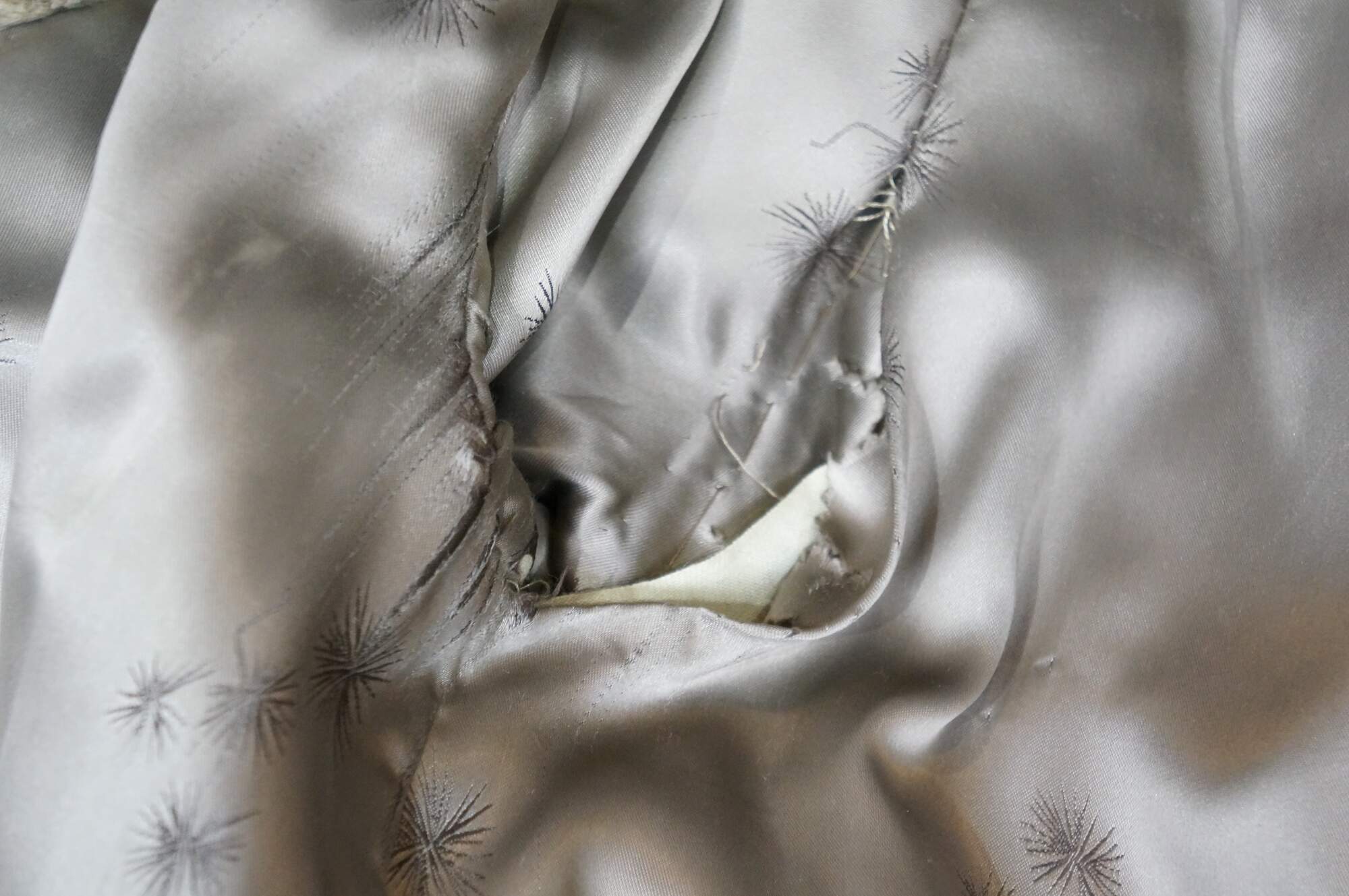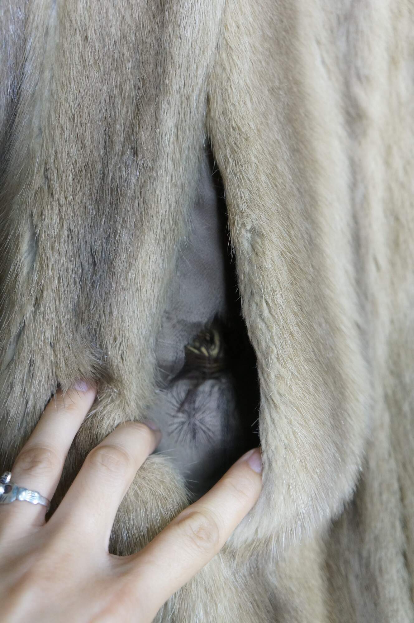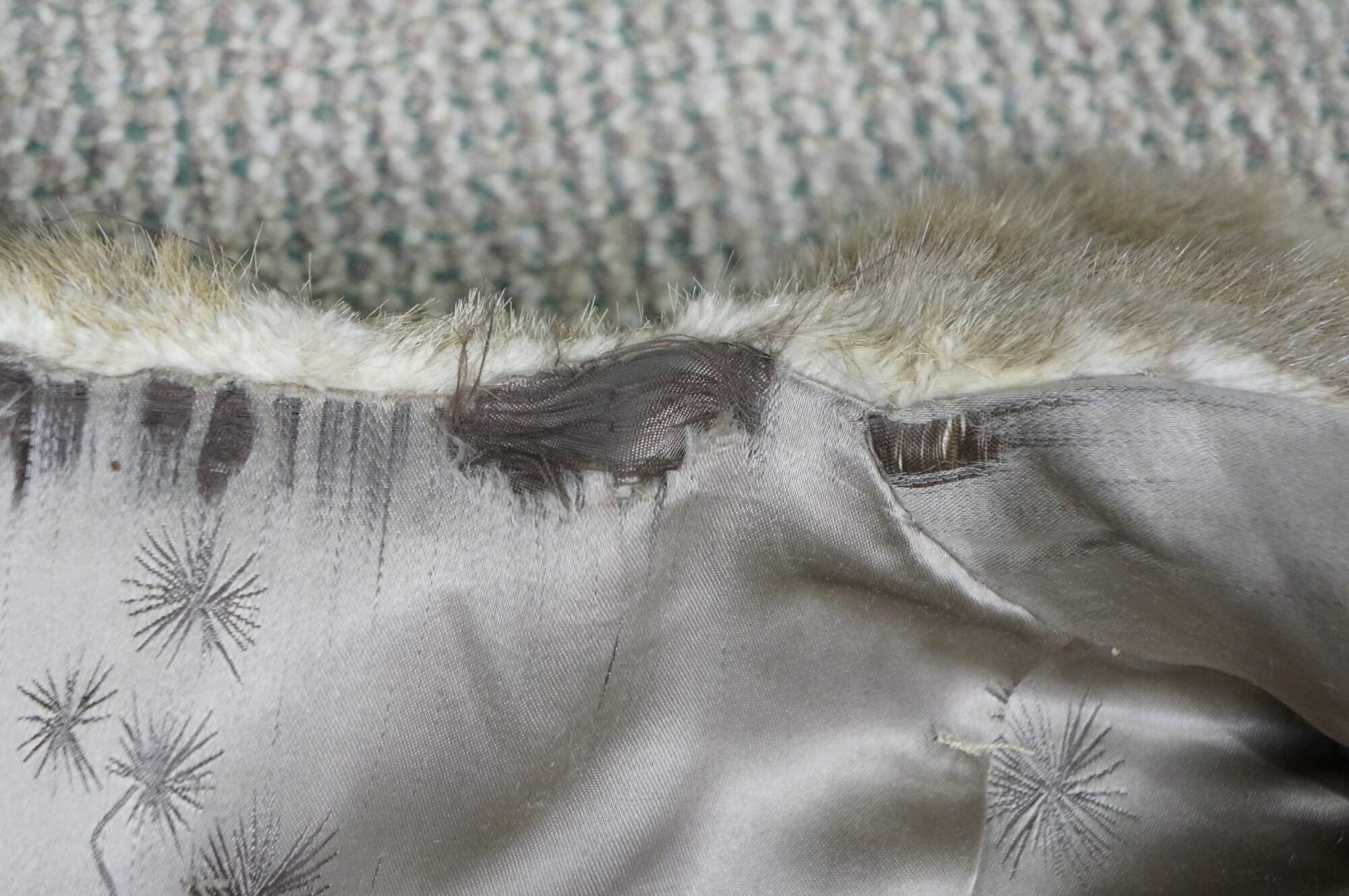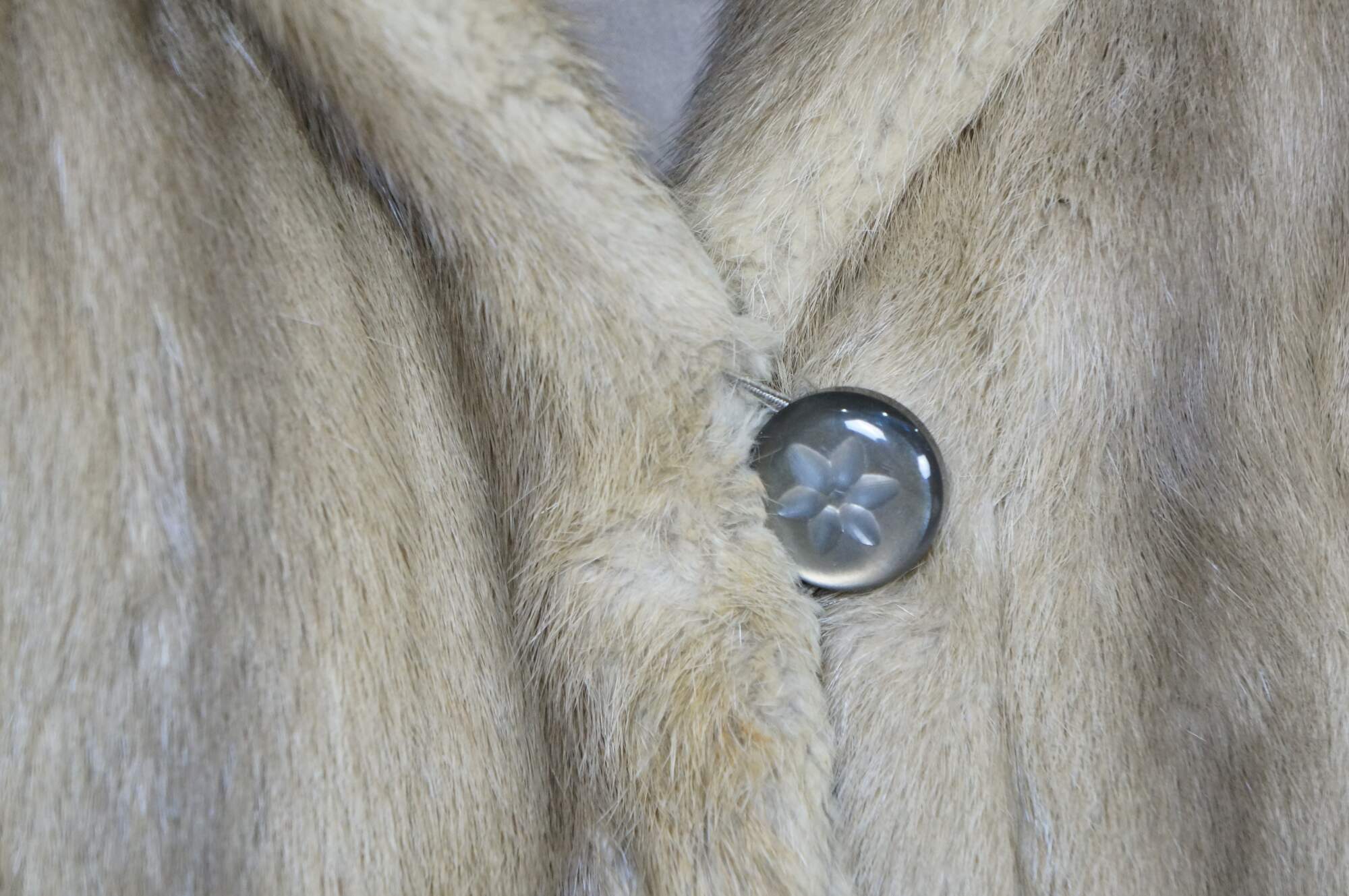 Mid to late 20th century light brown natural taxidermy mink fur jacket / coat. Short / hip length; floral plastic button closure; two exterior side pockets. Dandelion embroidered taupe lining. Lazarus - Columbus.