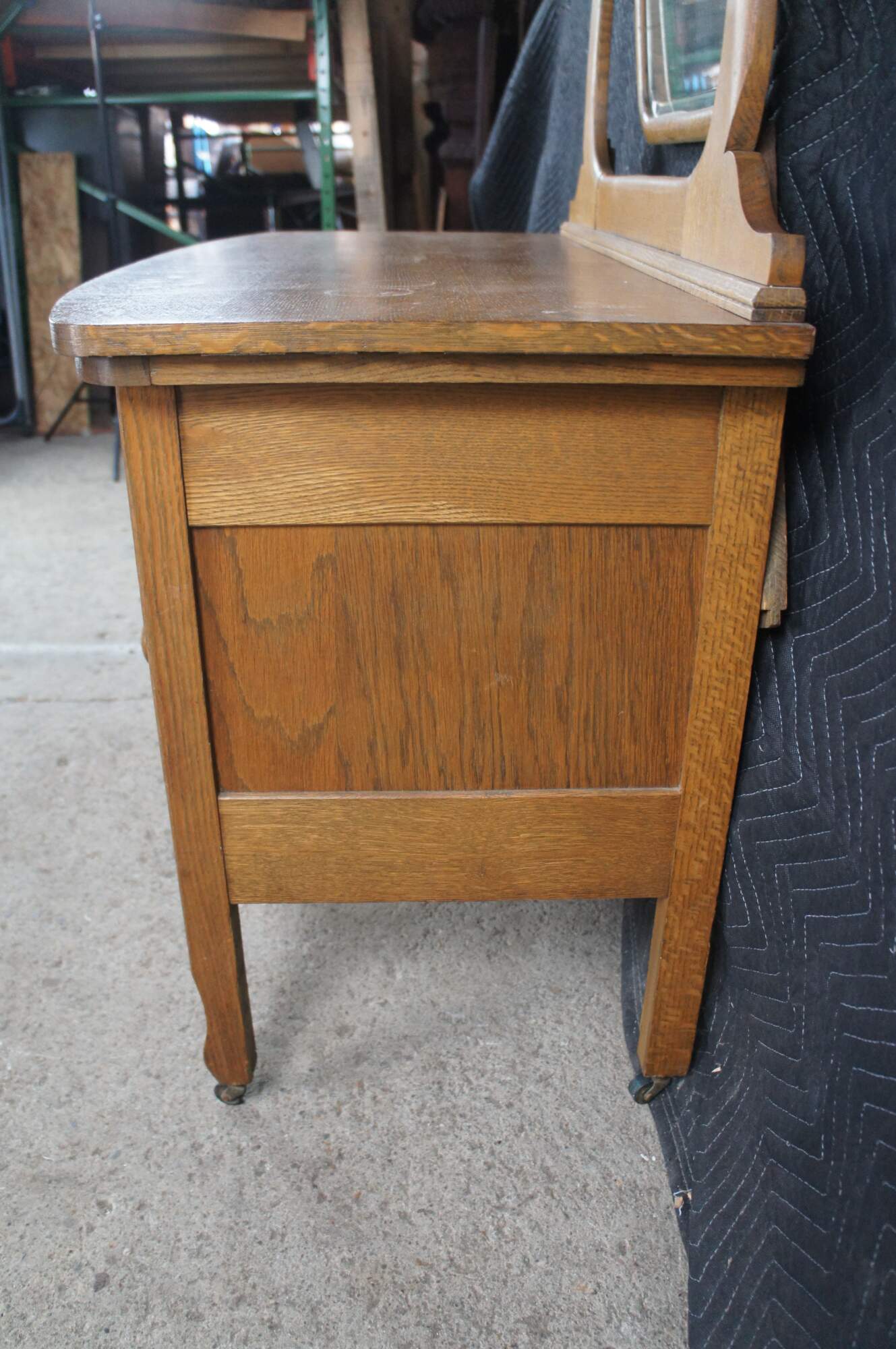 Antique Victorian lowboy vanity princess dresser / parlor wash stand with mirror. Made of quartersawn "tiger" oak featuring a wishbone vanity mirror, three drawers and rolling castors.
