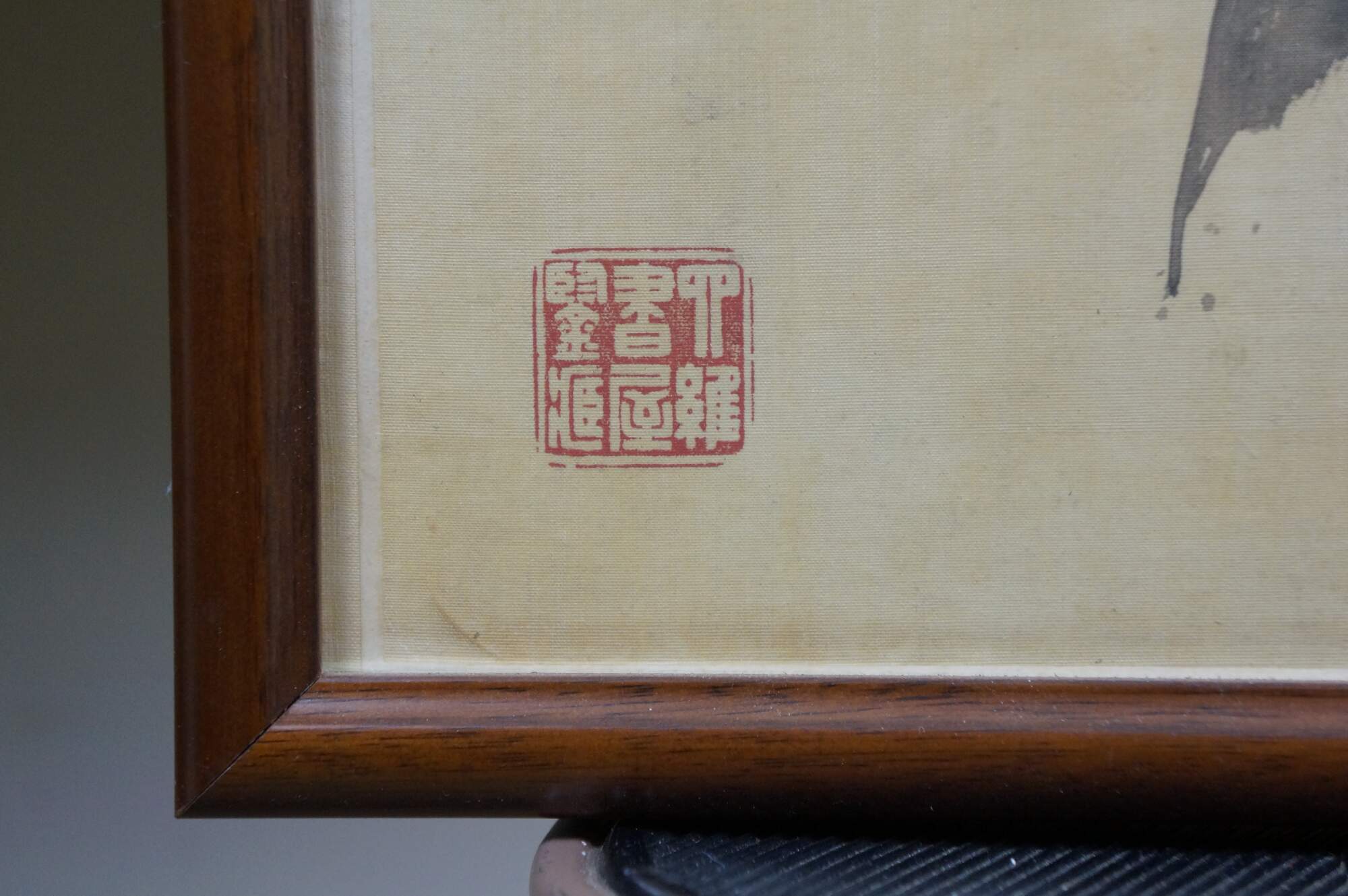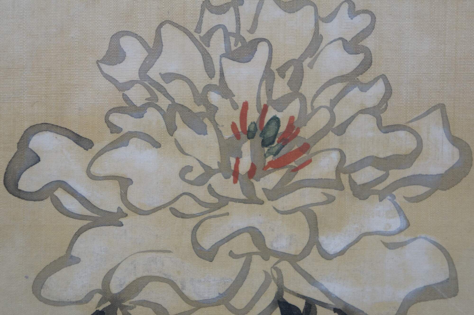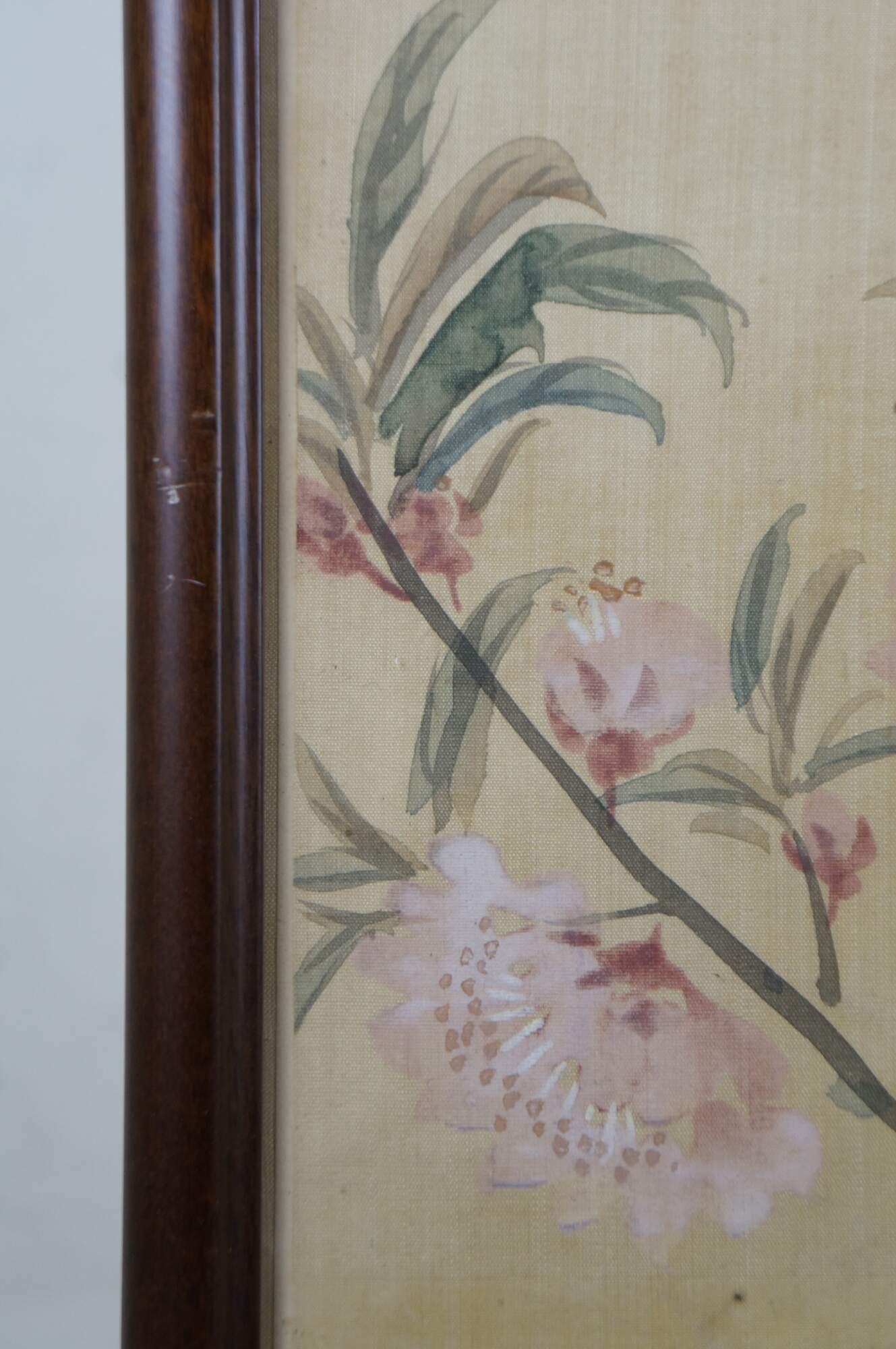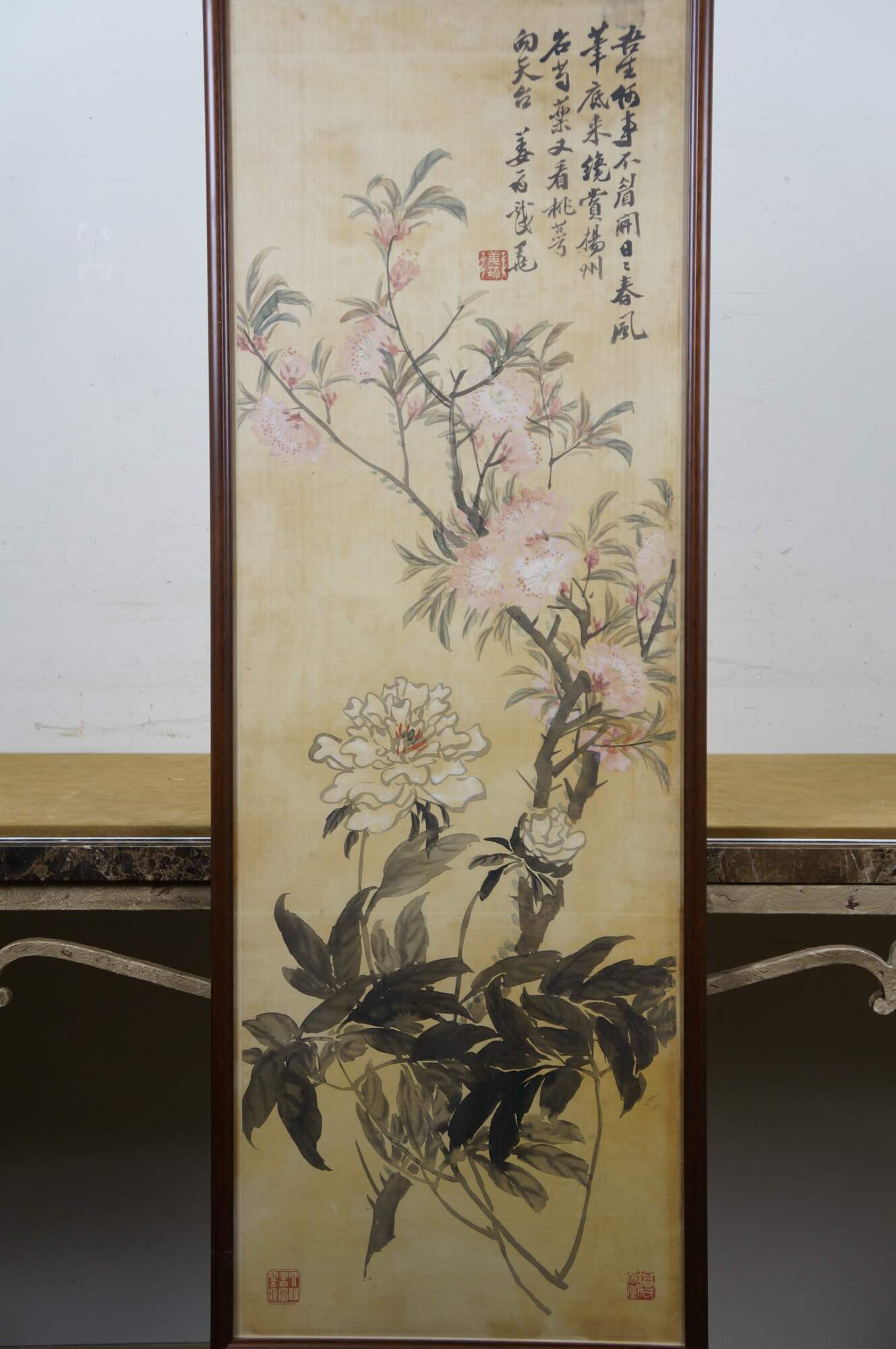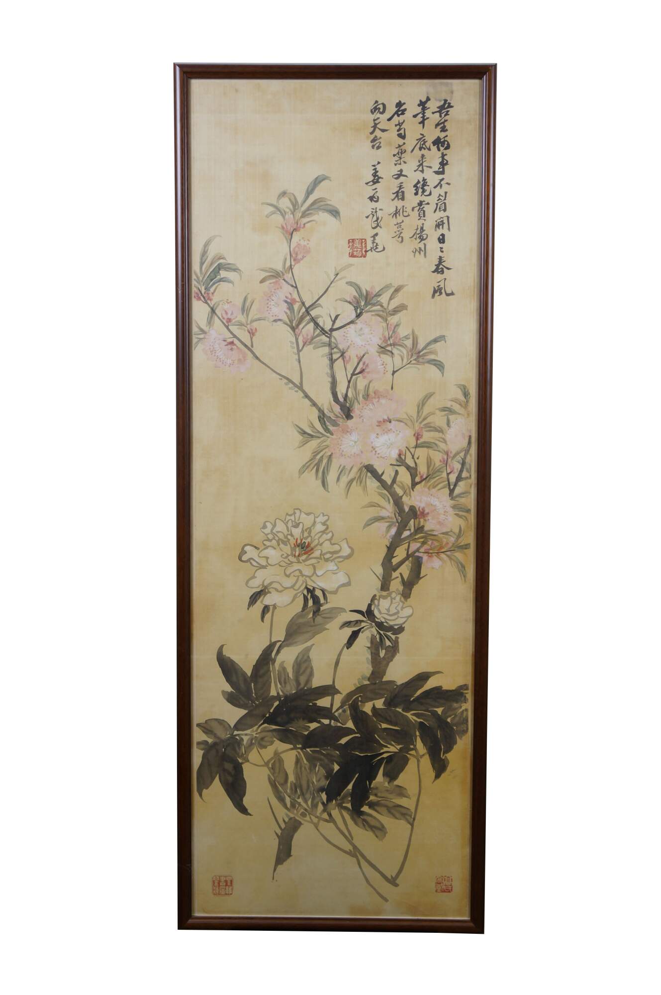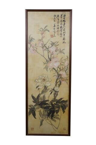 Circa early 20th century, Qing dynasty Jiang Jun Chinese chinoiserie watercolor scroll painting on silk showing branching stems of pink and white peonies and peach blossoms. Calligraphy in upper right. Three red stamps / seals. Wood frame.