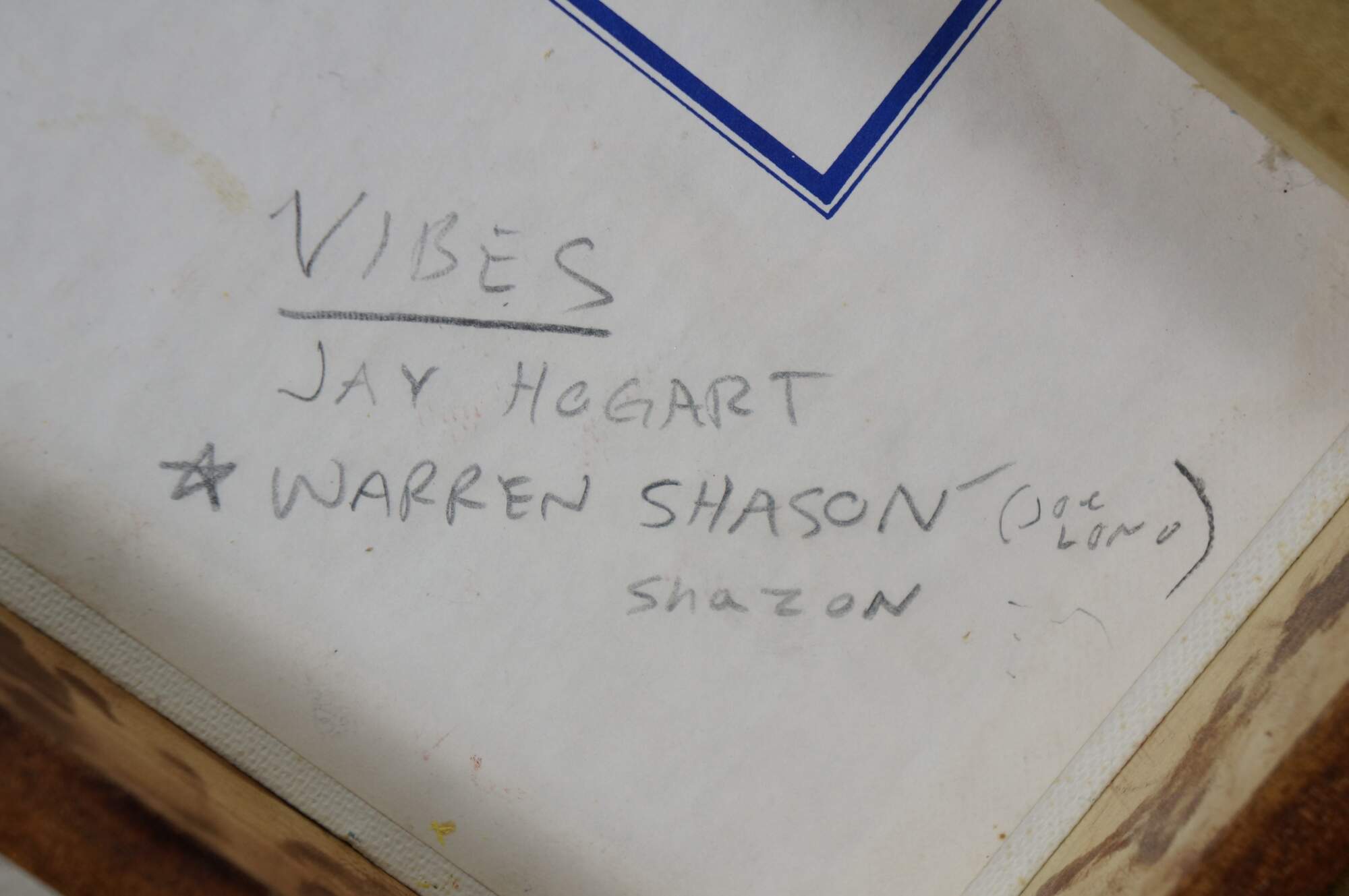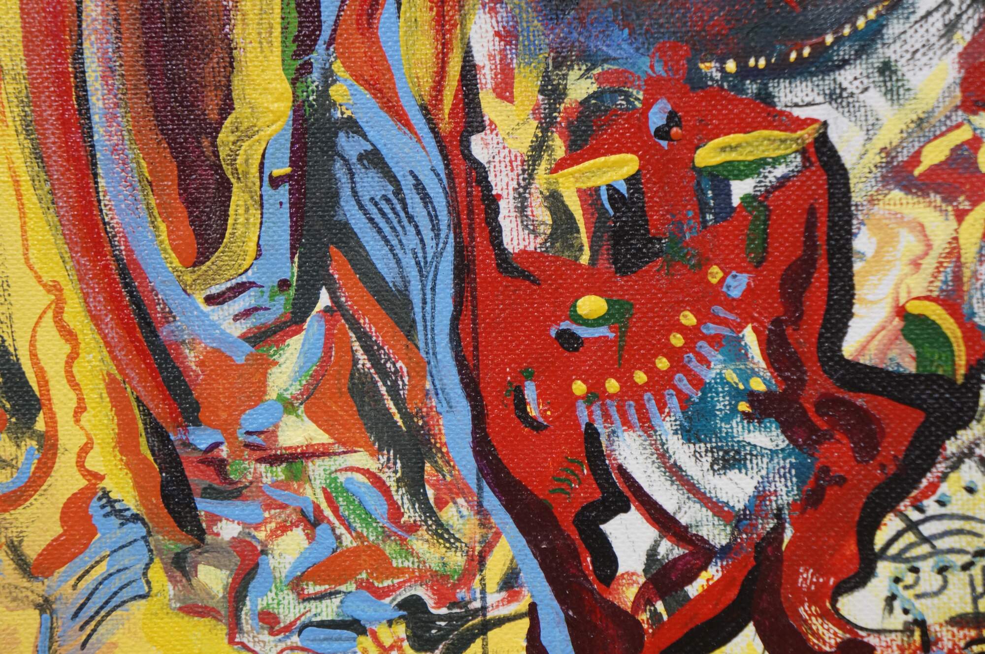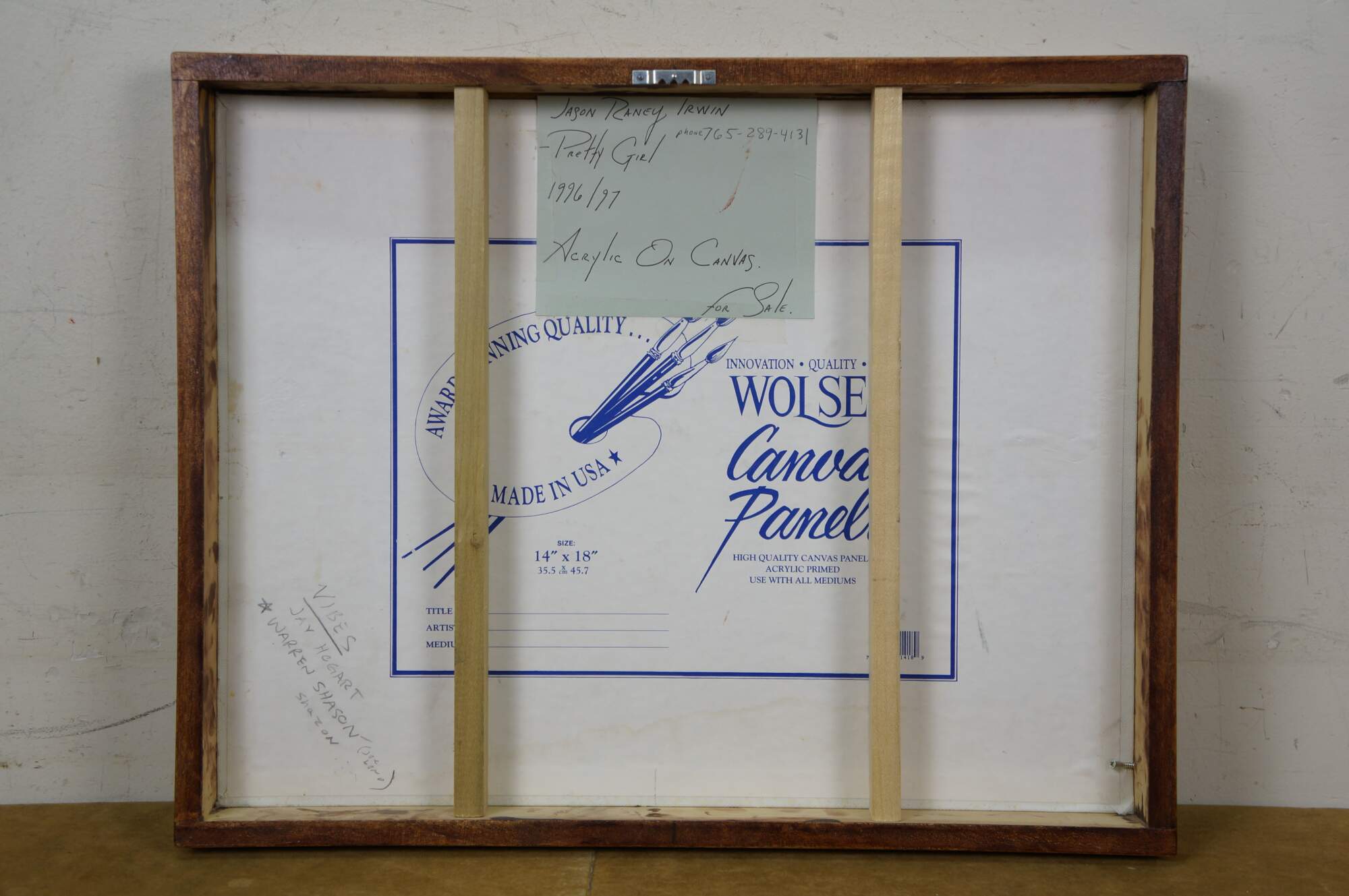 Vintage acrylic oil on canvas board painting titled "Pretty Girl" by Jason Raney Irwin. Depicts an abstract expressionist portrait of a female face with red band and hair in a pony tail, made of and surrounded by graffiti style shapes and figures. Signed and dated 1997, upper right. Wood frame.