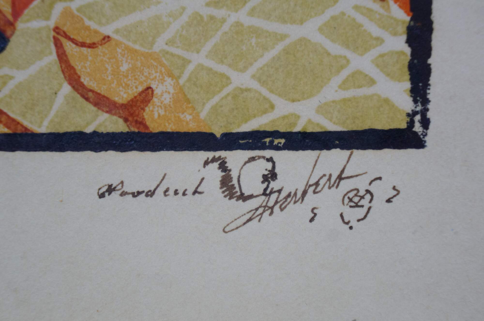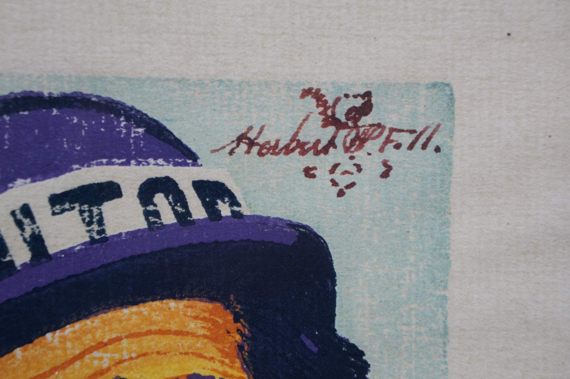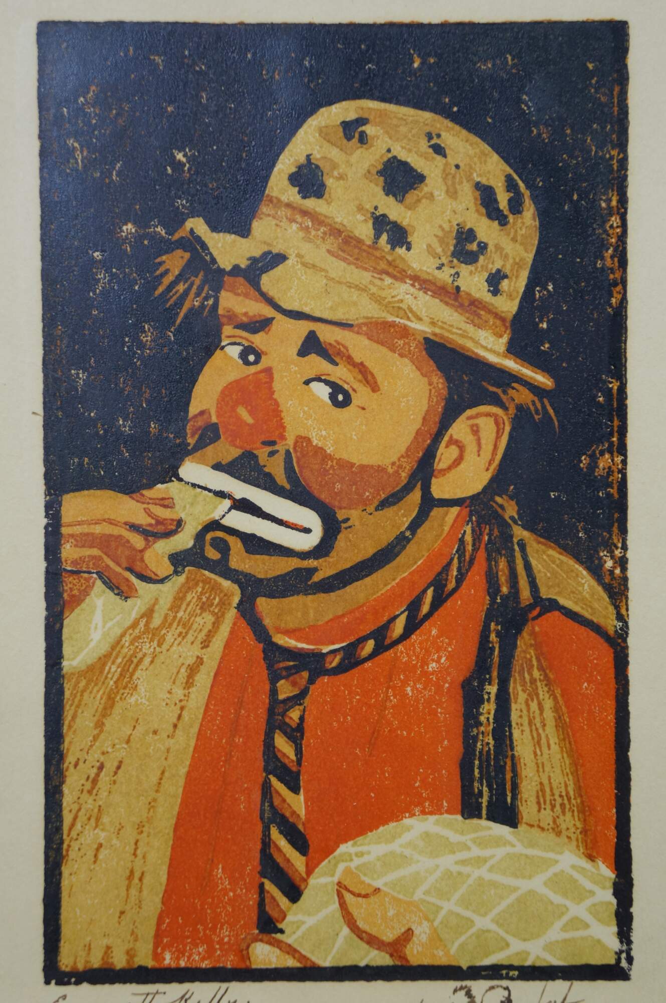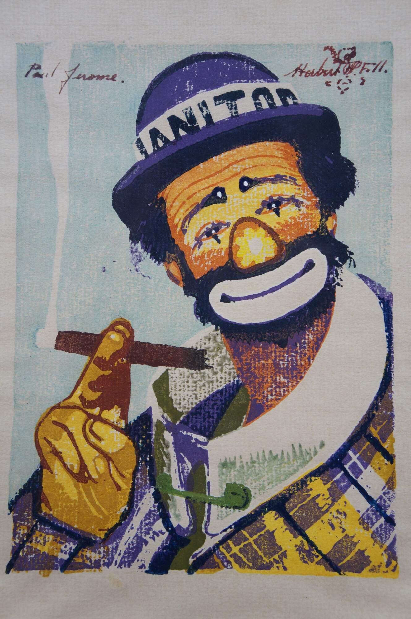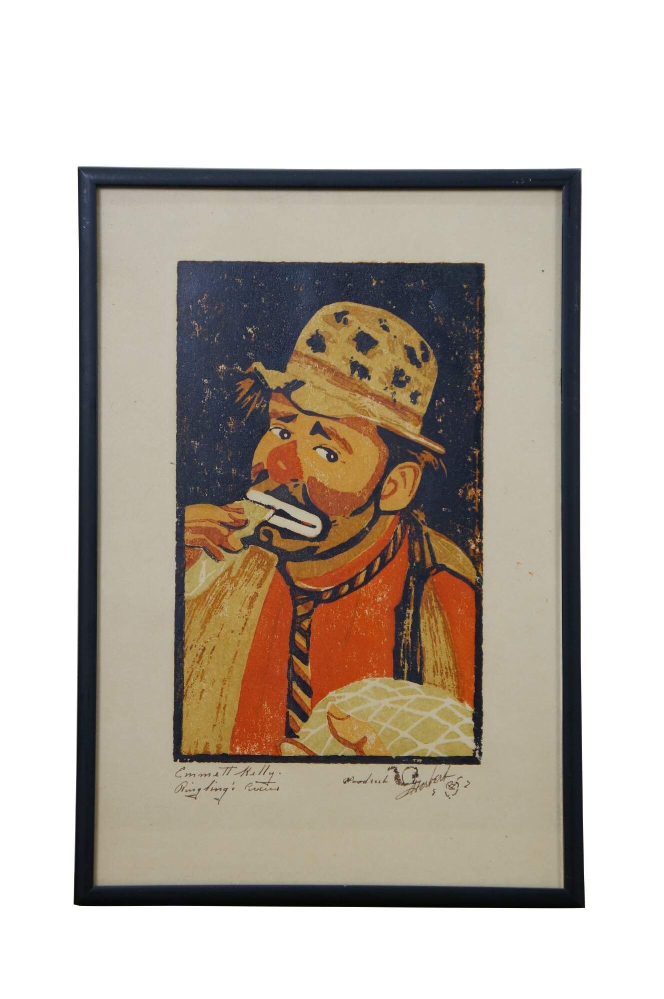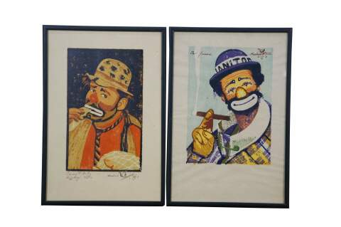 Pair of original screen or woodblock printed portraits depicting Emmett Kelly (Weary Willie) and Paul Jerome (Janitor), two famous clowns from the early 20th century Ringling Brothers Circus. both pieces signed and titled in ink - signature appears to read Horbert. Remarks of a squirrel. Black metal frames; no mat.