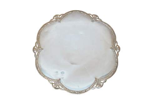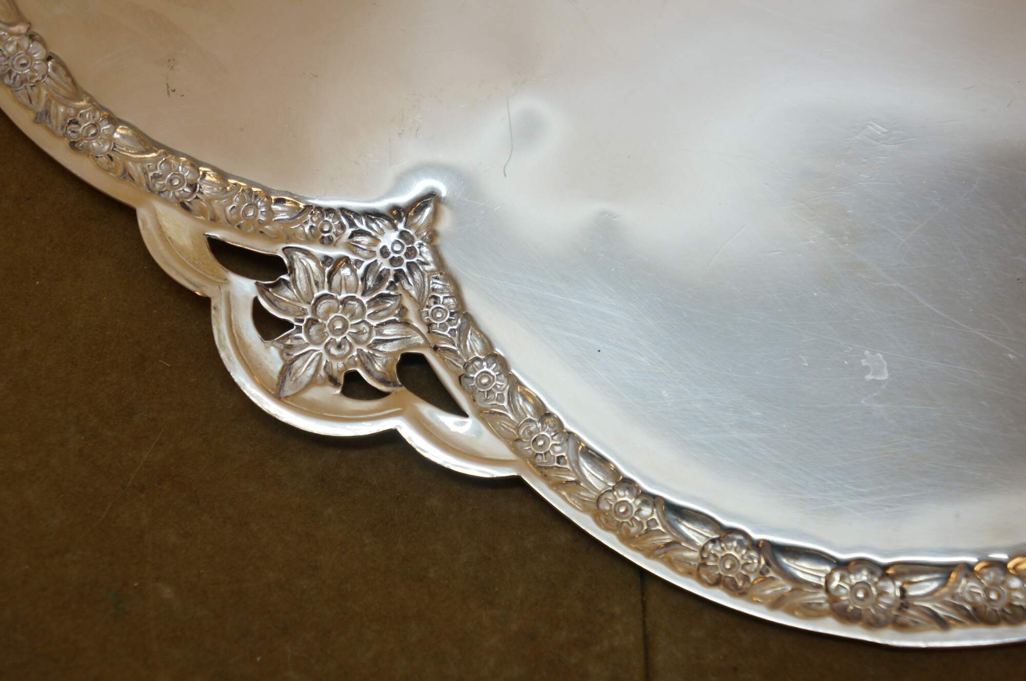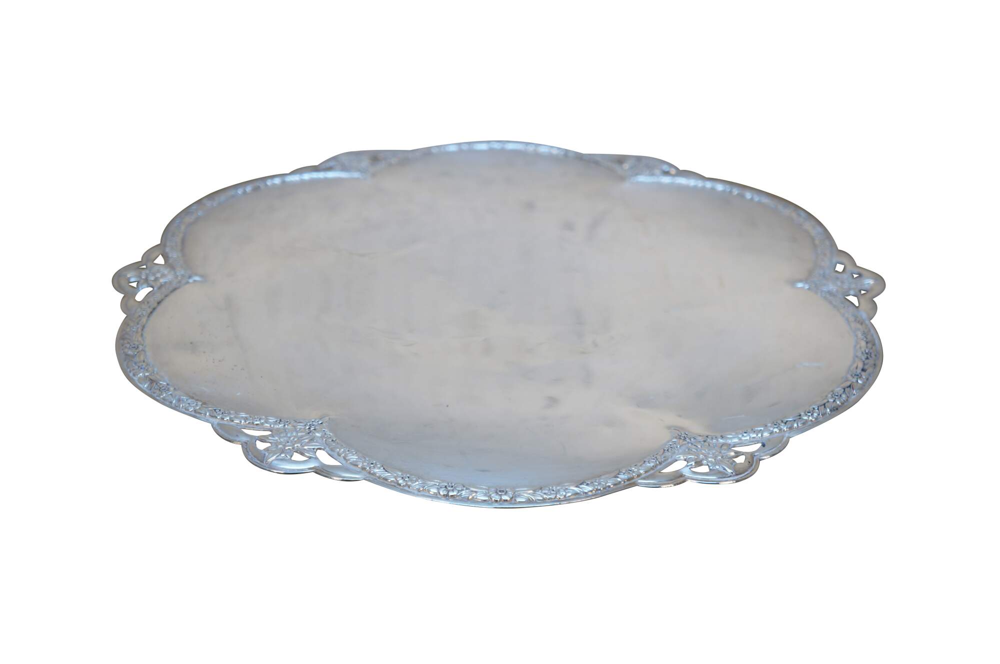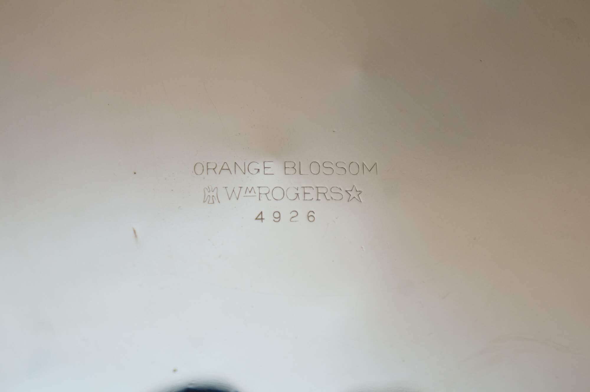 Circa mid 20th century William Rogers elegant silverplate cake plate / footed platter number 4926 in the Orange Blossom pattern. Six lobed flower shape design edged with a pattern of orange blossoms and pierced accents; round footed base.