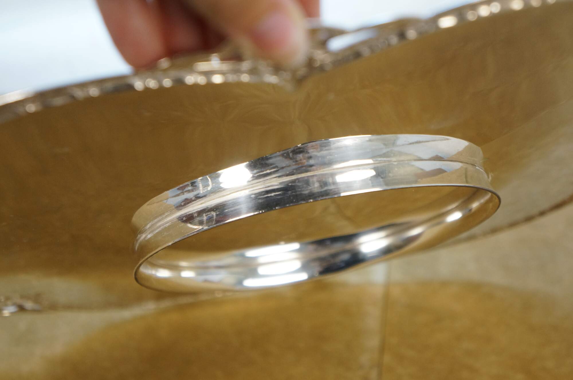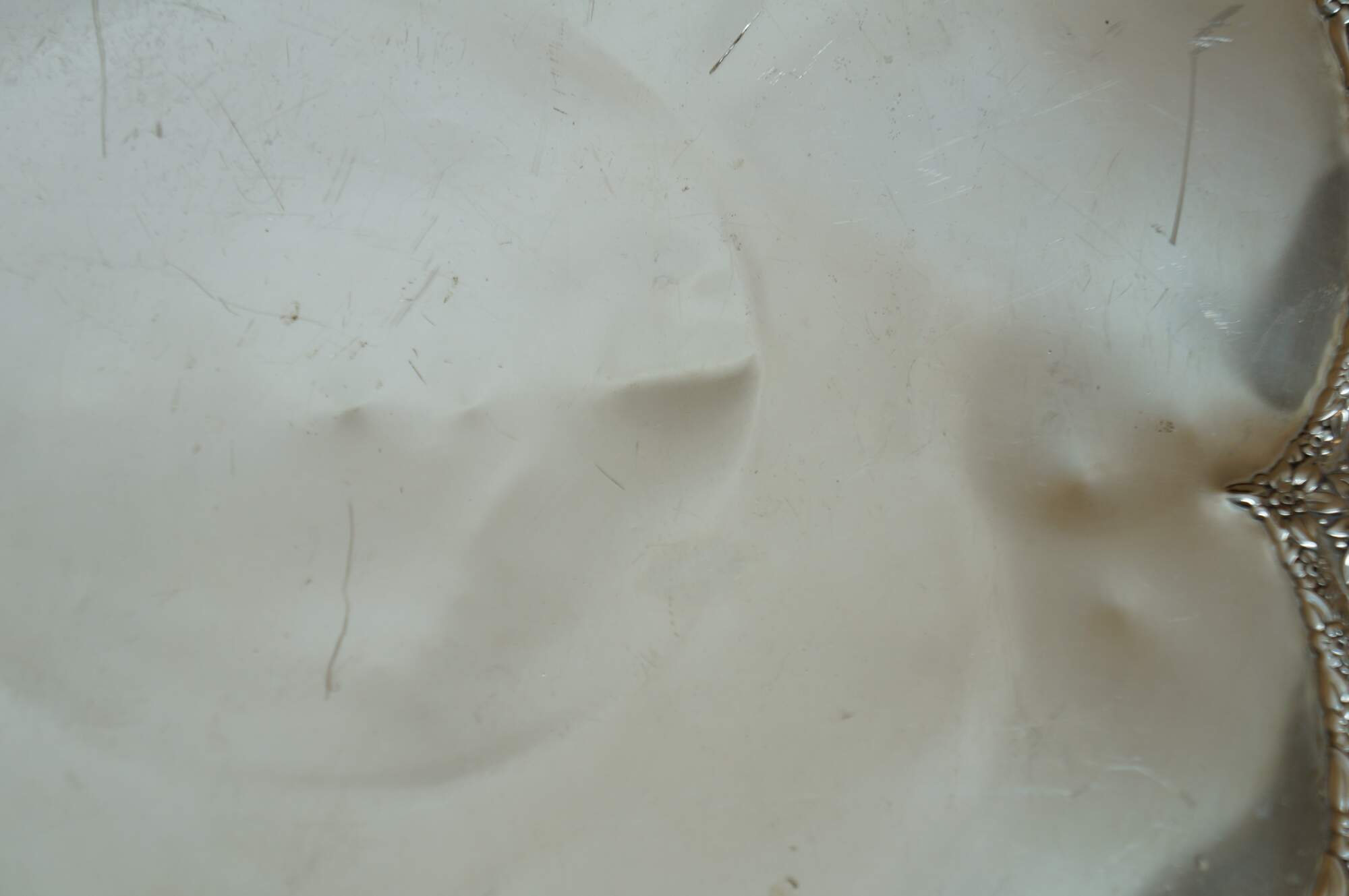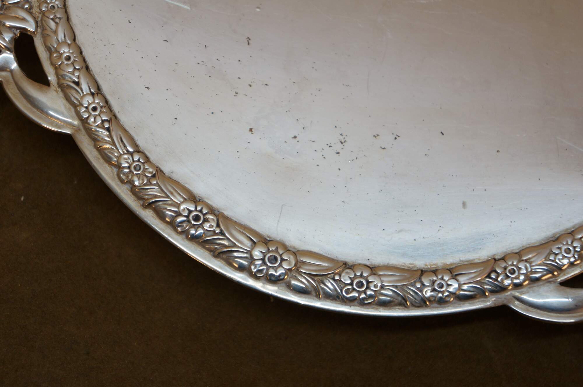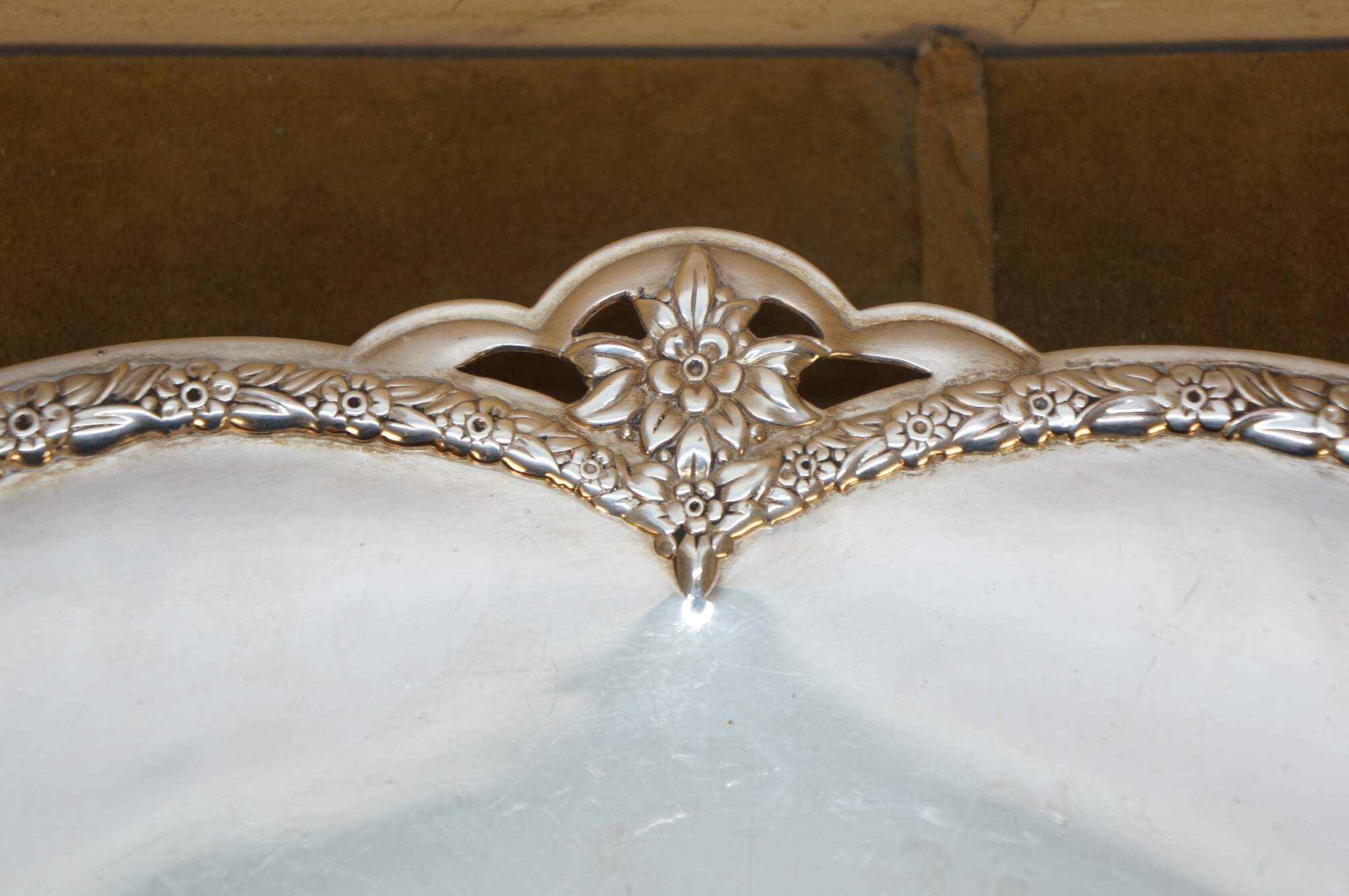 Circa mid 20th century William Rogers elegant silverplate cake plate / footed platter number 4926 in the Orange Blossom pattern. Six lobed flower shape design edged with a pattern of orange blossoms and pierced accents; round footed base.